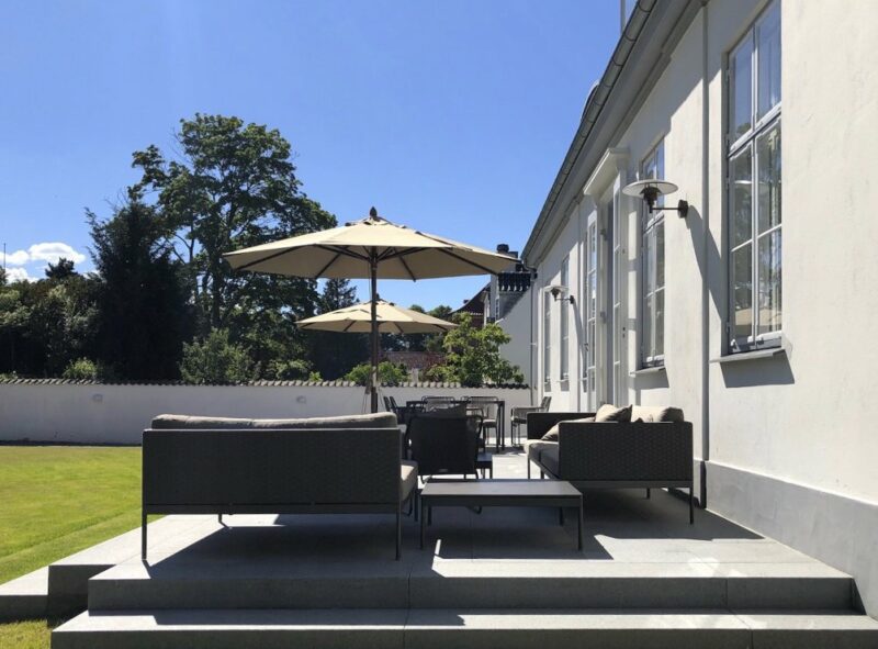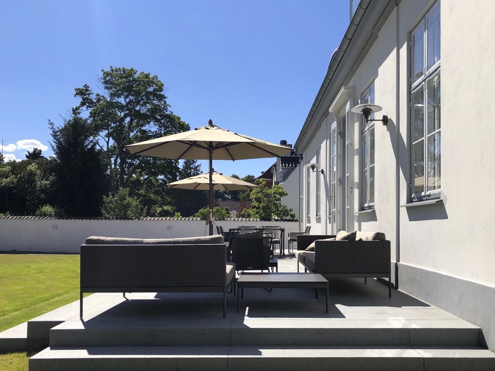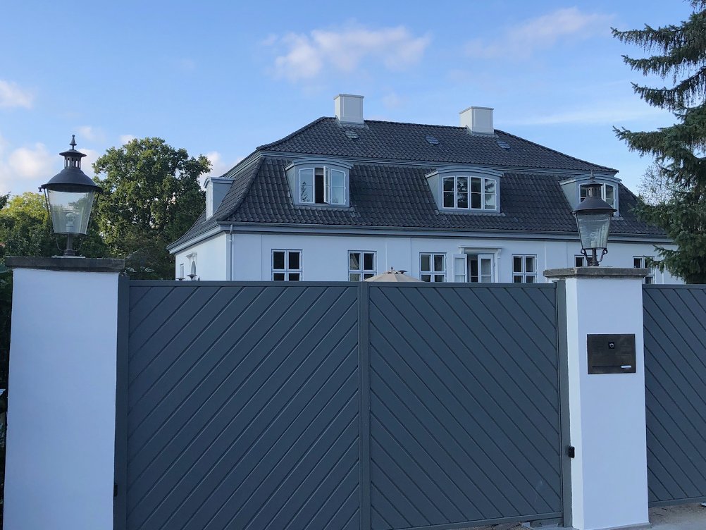 Nyt tag udført med gammel dansk vingetegl fra Monier i blå dæmpet. Special designet kviste udført i samarbejde med Bøjsø. Alle zink inddækninger blev udført af Byens Tag og Facade i forpatineret zink. Tagvinduer i støbejern fra GH Holbæk Jernstøberi A/S. Facader og mur blev renoveret. Eksisterende vinduespartier med det oprindelige gamle glas blev istandsatte. Etablering af ny port og indgangsparti med søjler. Belysning og gørtler arbejde udført i samarbejde med Finn Jakobsen. Ny terrasse udført i granit i samarbejde med Zurface med mønster designet af Due de Fønss. De gamle skulpturer fra den gamle terrasse er gemt og placeret i et bed i haven.