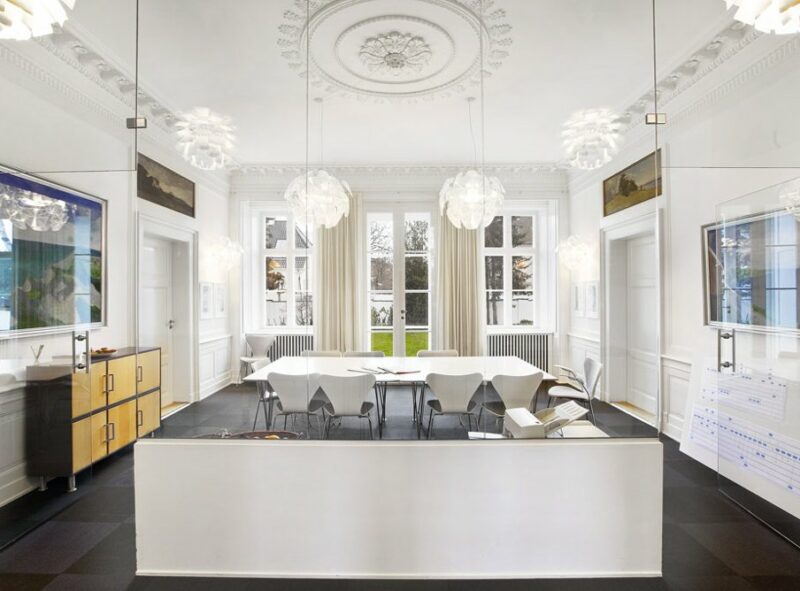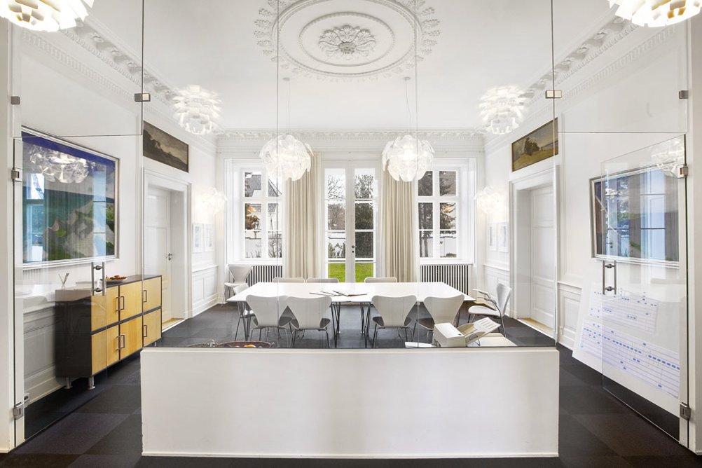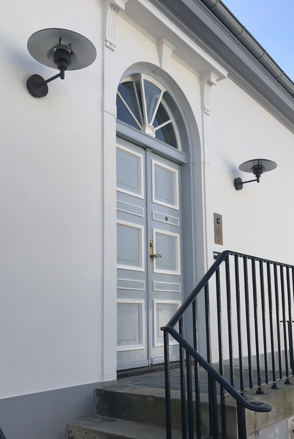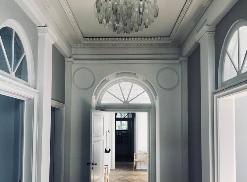 Huset fra 1923 i klassicistisk stil er tegnet af arkitekten Helge Holm (1891-1973). Arkitektens mål var at få huset tilbage til dets oprindelige pragt – et hus med et næsten hammerhøisk udtryk med smukke, høje paneler, store vindues partier med skodder og stuk i det fire meter høje rum.