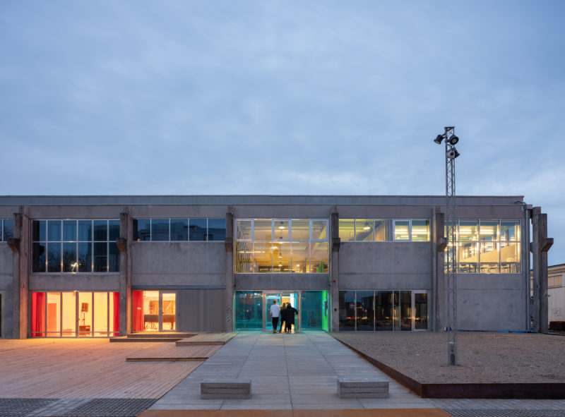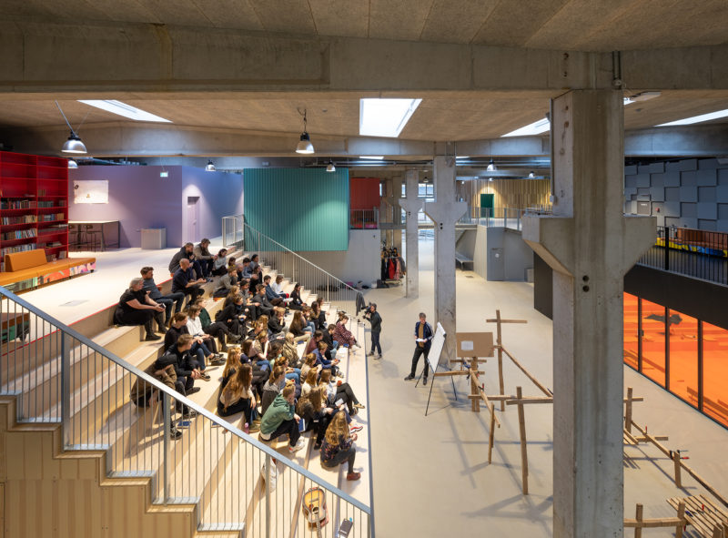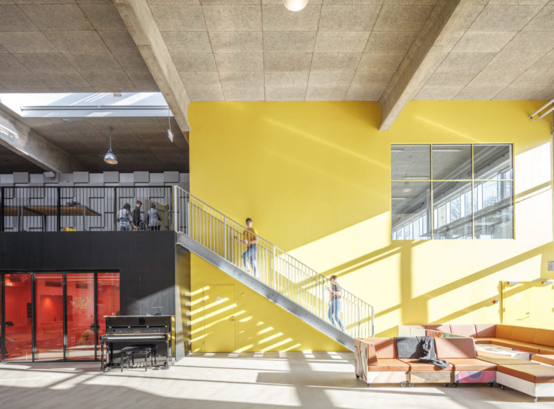 Med Roskilde Festival Højskole har Cobe og MVRDV renoveret og åbnet den gamle fabrikshal op med store vinduer og ovenlys samtidig med, at de eksisterende betondragere og søjler er bibeholdt helt rå som levn fra den gamle produktionshal.