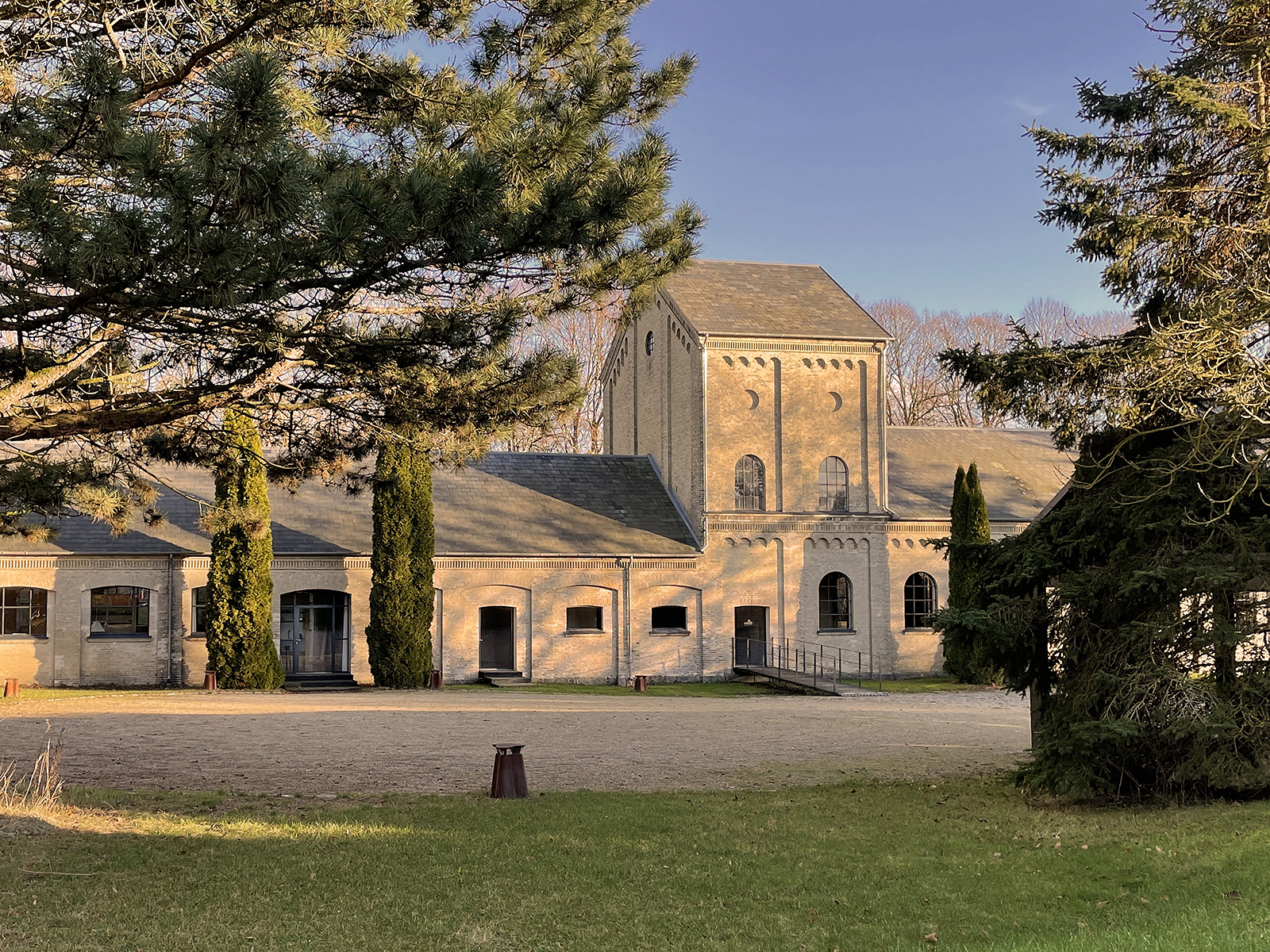 Endelig er bygningens forplads anlagt i en kombination af en eksisterende brostensbelægning og en ny, cirkulær grusplads. Indkørslen til området er flyttet i for hold til de oprindelige, så man kan overskue hele bygningens længde, når man ankommer.