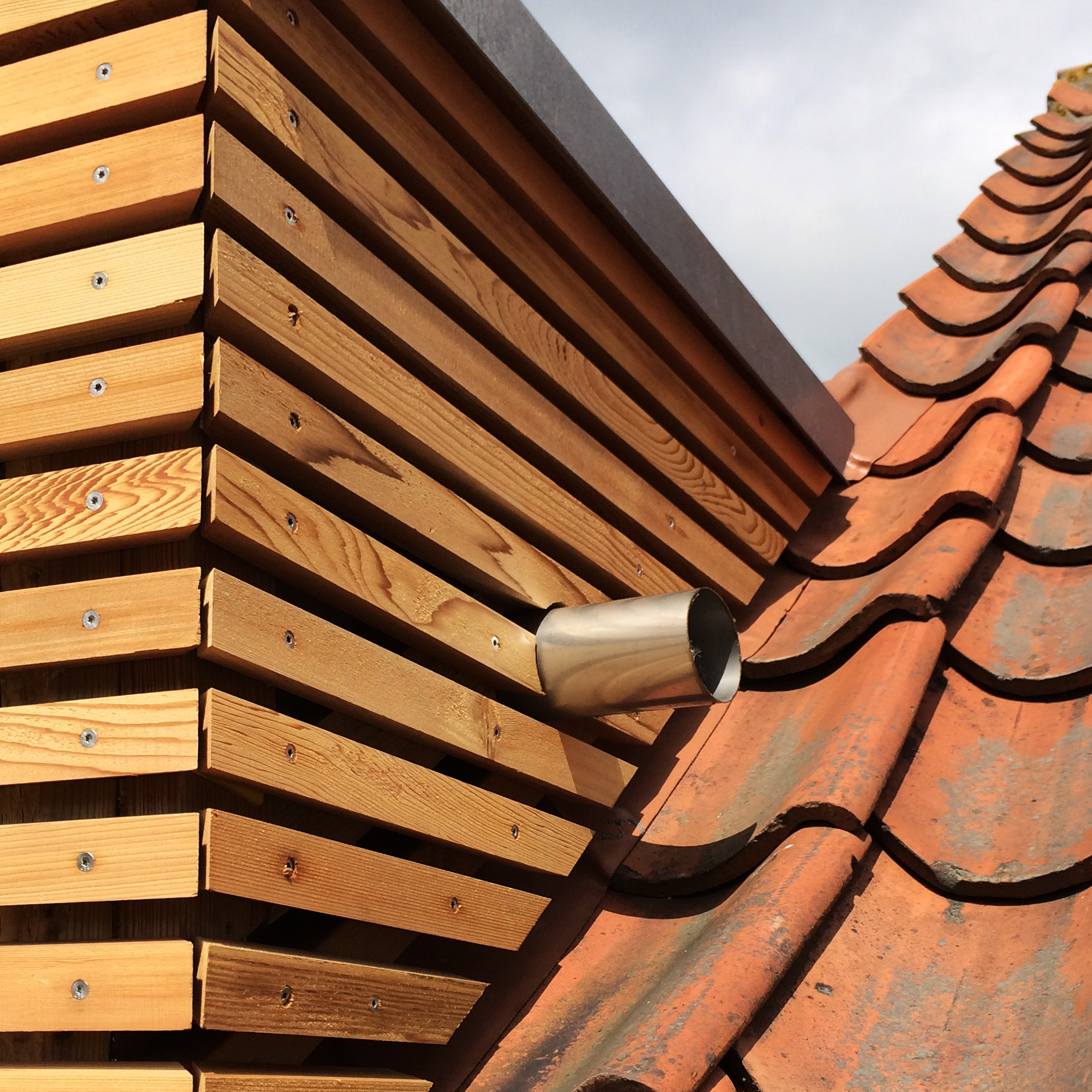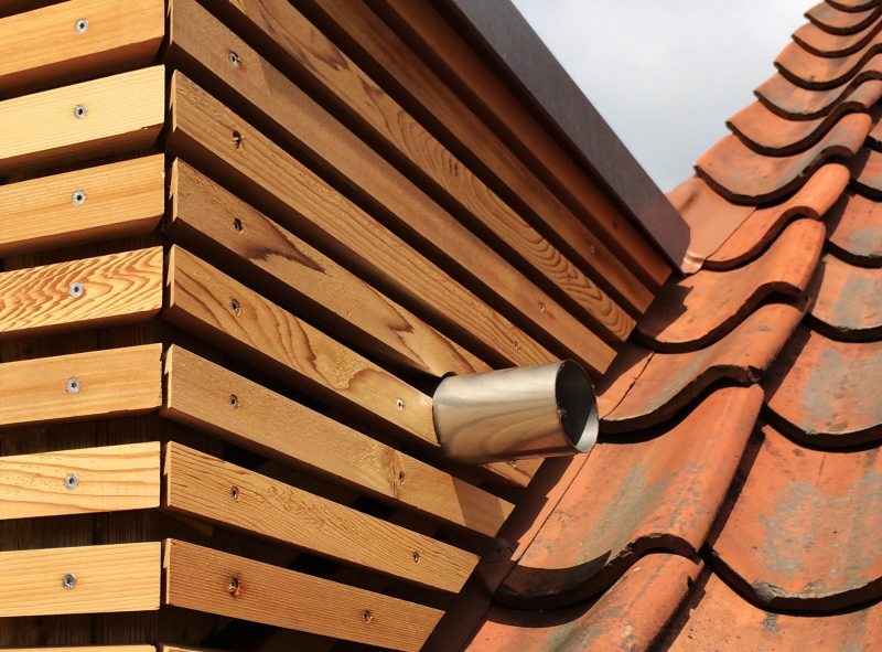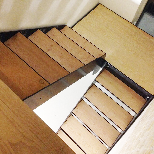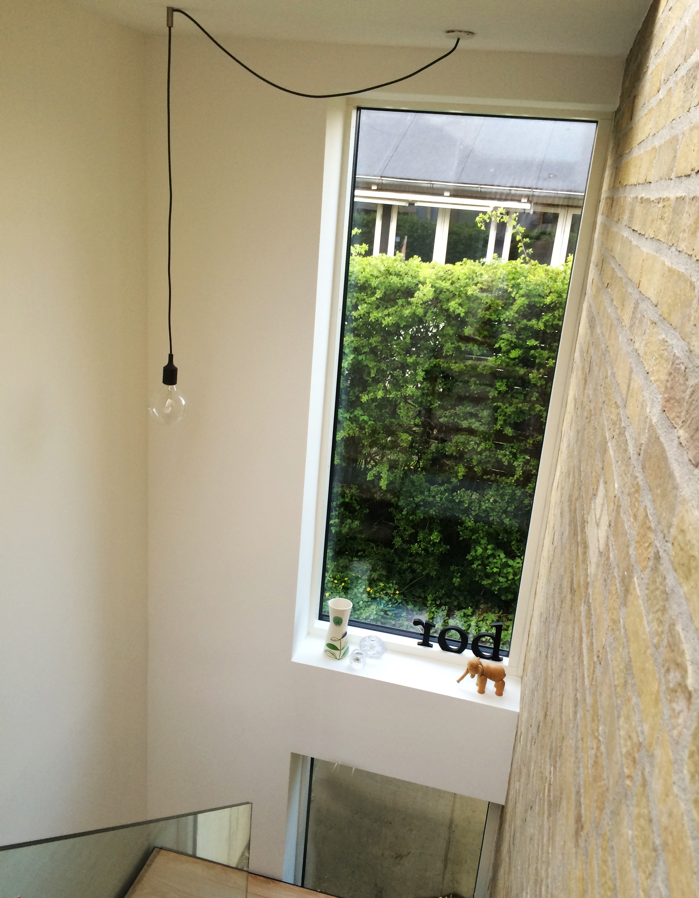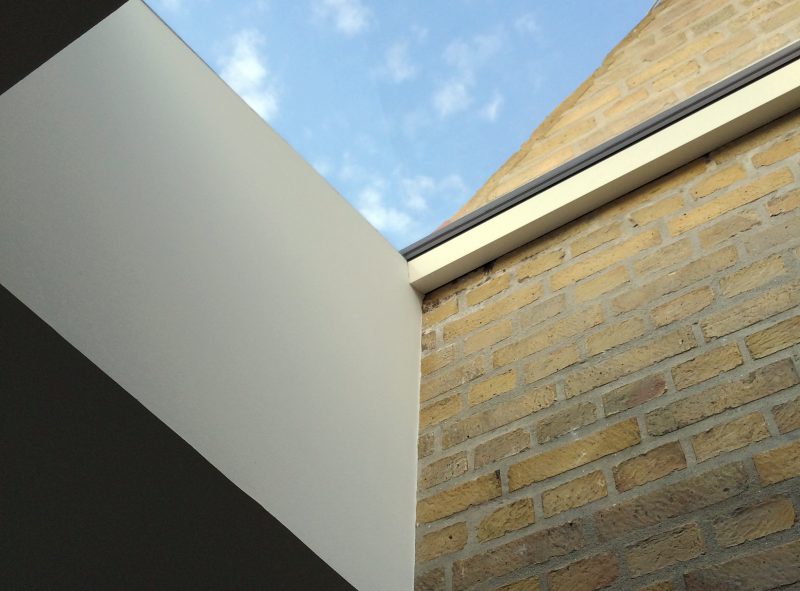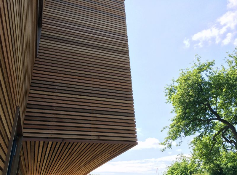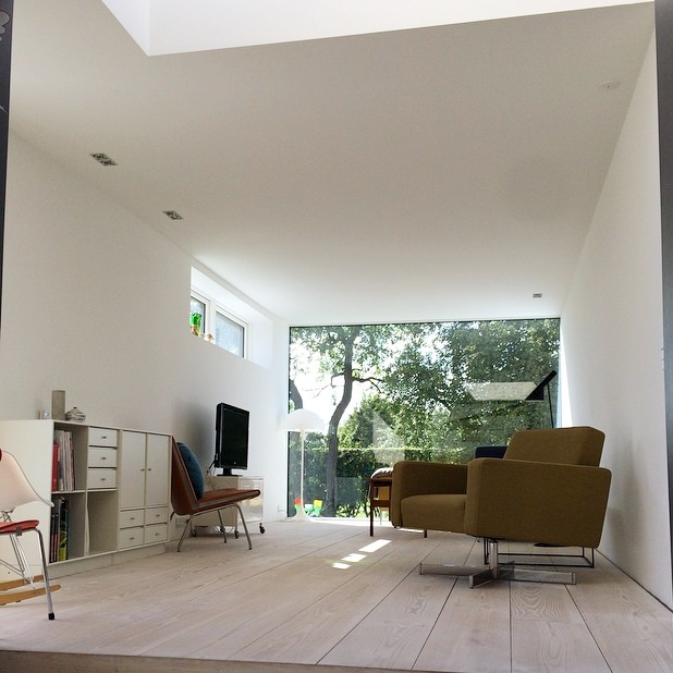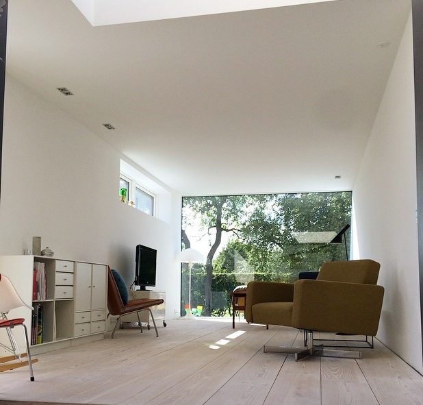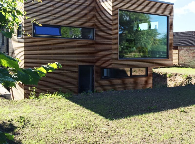 Materialevalget er begrænset til træ, beton og glas i et forsøg på at forenkle indtrykket af en tilbygning i respekt for det eksisterende hus.
