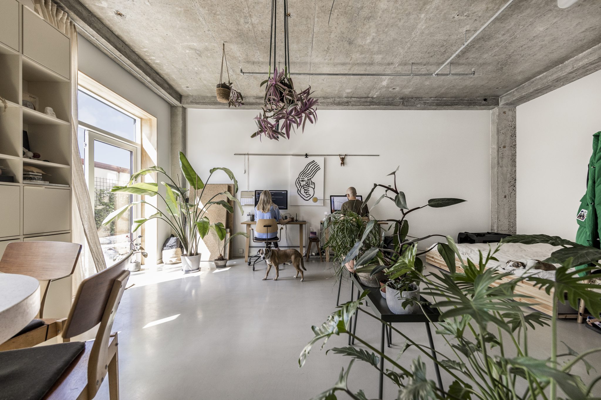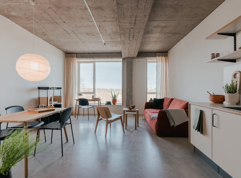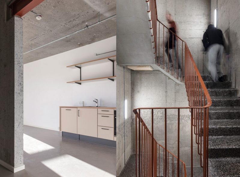 Der er lagt vægt på at bevare bygningens rå atmosfære og skabe en helstøbt oplevelse på tværs af gårdrum, fællesrum og det enkelte studio, hvor den rå beton, materialer og farveholdning går konsistent igen.