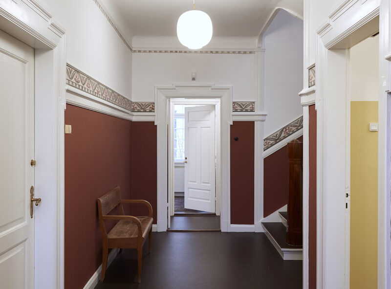 Før selve byggeprojektet har vi gjort forundersøgelser af bygningens stand, ligesom vi gik tilbage for at studere de originale tegninger. Da vi fik lavet huller i de nedhængte lofter blev de gamle stukdetaljer afsløret, og de gamle fløjdøre blev genfundet på loftet.