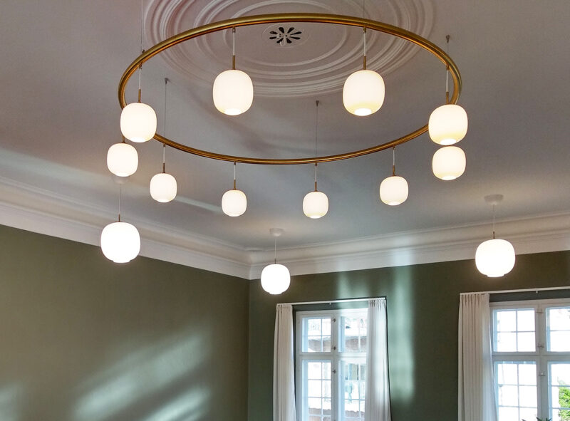 Flere af de gamle lysekroner og lamper er bevaret og nye i skræddersyet design er kommet til. Bæredygtigheden består derfor i en kombination af nutidige installationer og historiske materialer, der har givet bygningen en helt ny livscyklus.