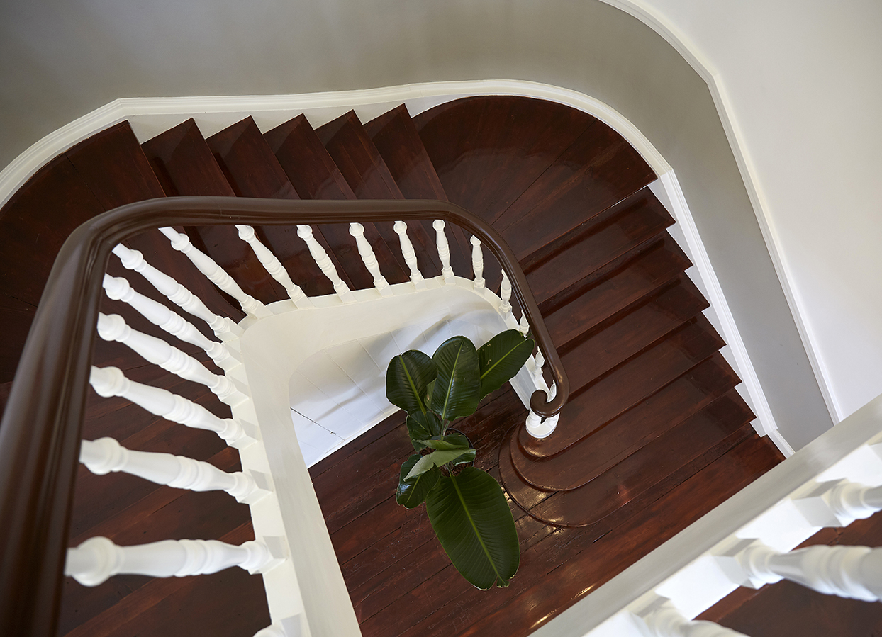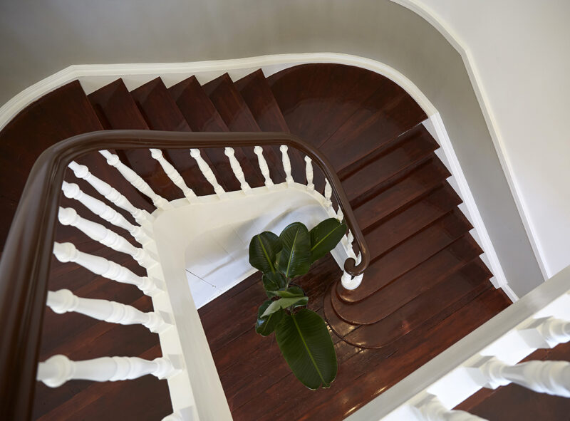 Overalt er der anvendt gedigne og historiske materialer, der er udvalgt både for deres karaktergivende og bæredygtige egenskaber. Vægge og lofter er således pudset traditionelt på rørvæv, og vi har i samarbejde med specialhåndværkere genskabt stuk og originale farver til vægge og borter. De gamle gulve er slebet ned og har fået fem gange Tonkin-lak.
