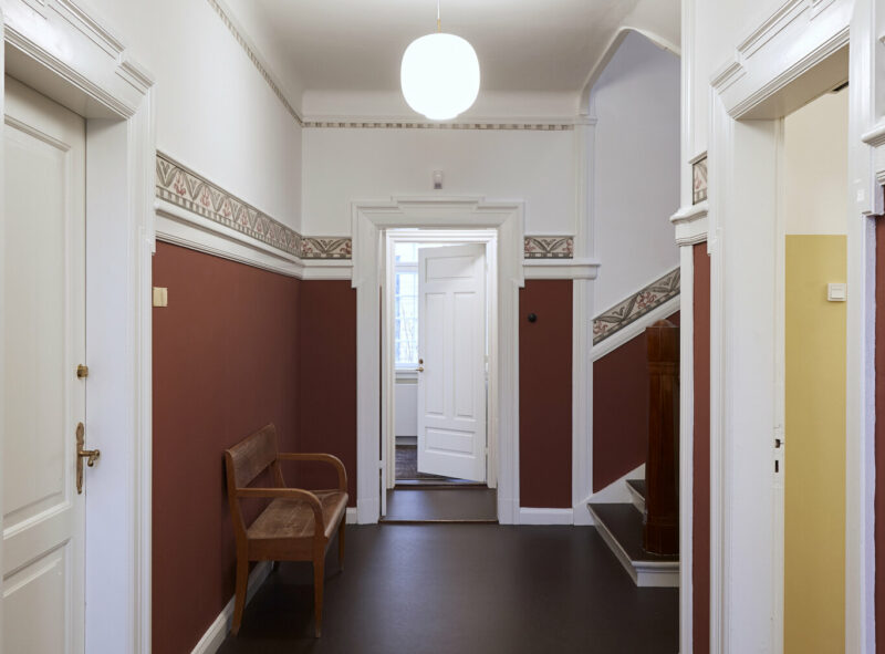 Overalt er der anvendt gedigne og historiske materialer, der er udvalgt både for deres karaktergivende og bæredygtige egenskaber. Vægge og lofter er således pudset traditionelt på rørvæv, og arkitekten har også i samarbejde med specialhåndværkere genskabt stuk og originale farver til vægge og borter. De gamle gulve er slebet ned og har fået fem gange Tonkin-lak.