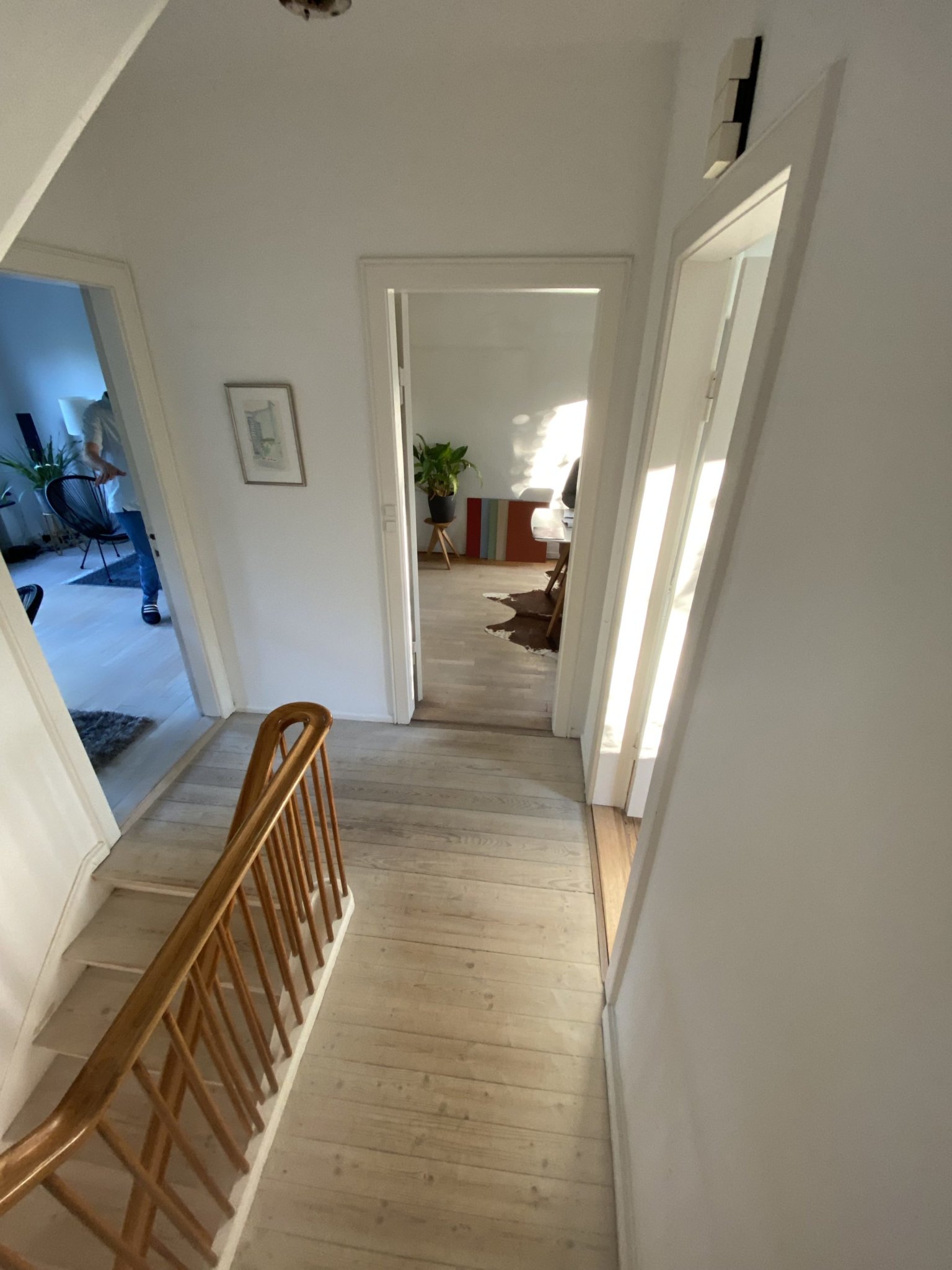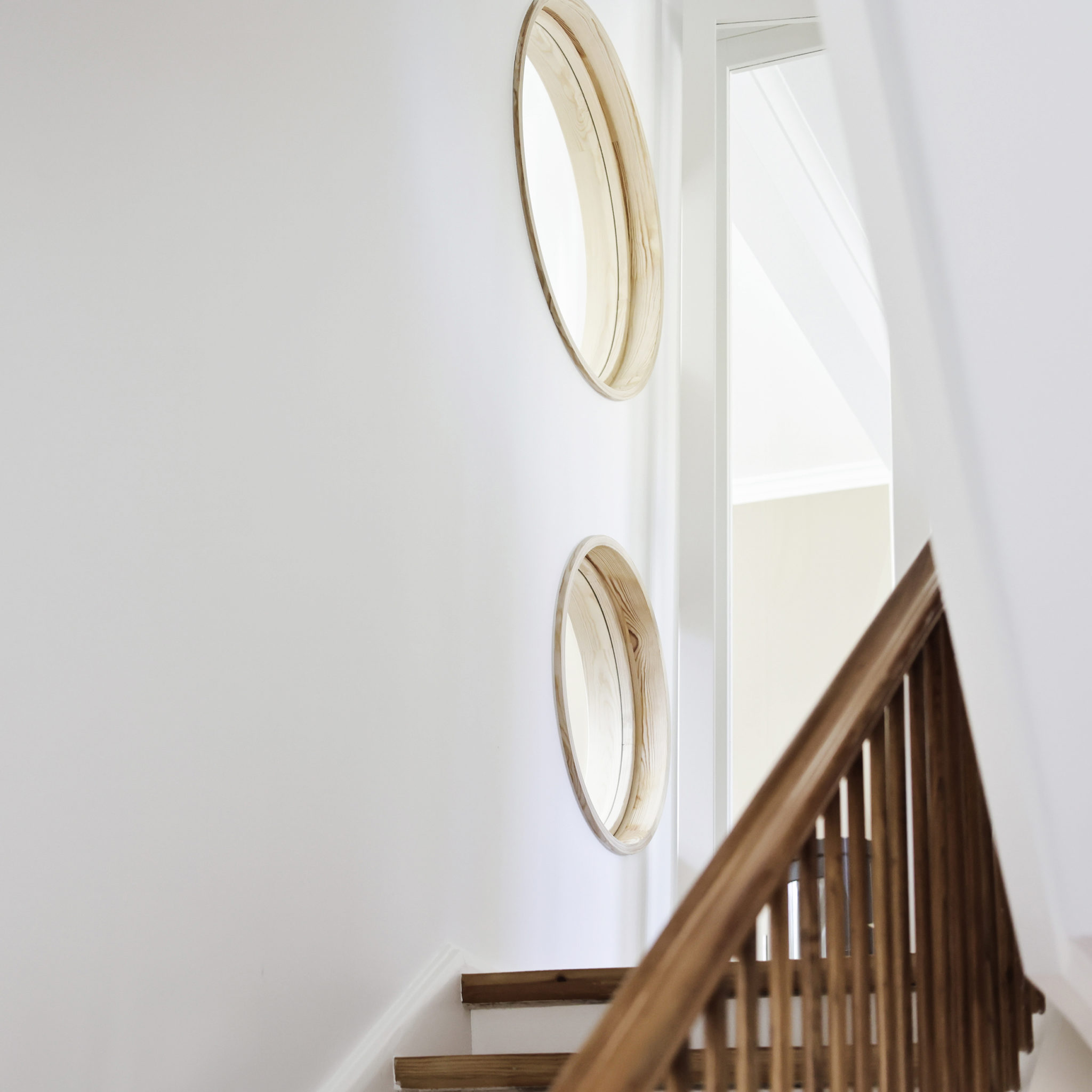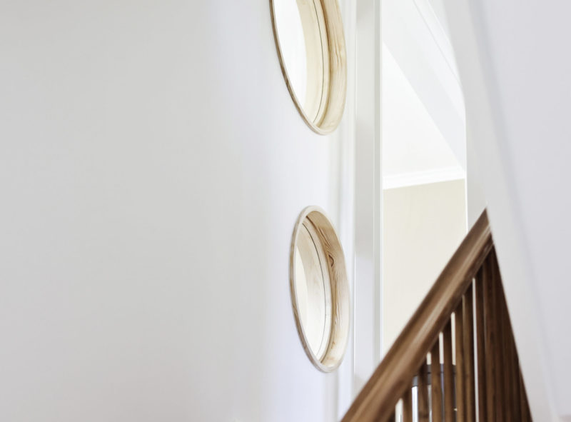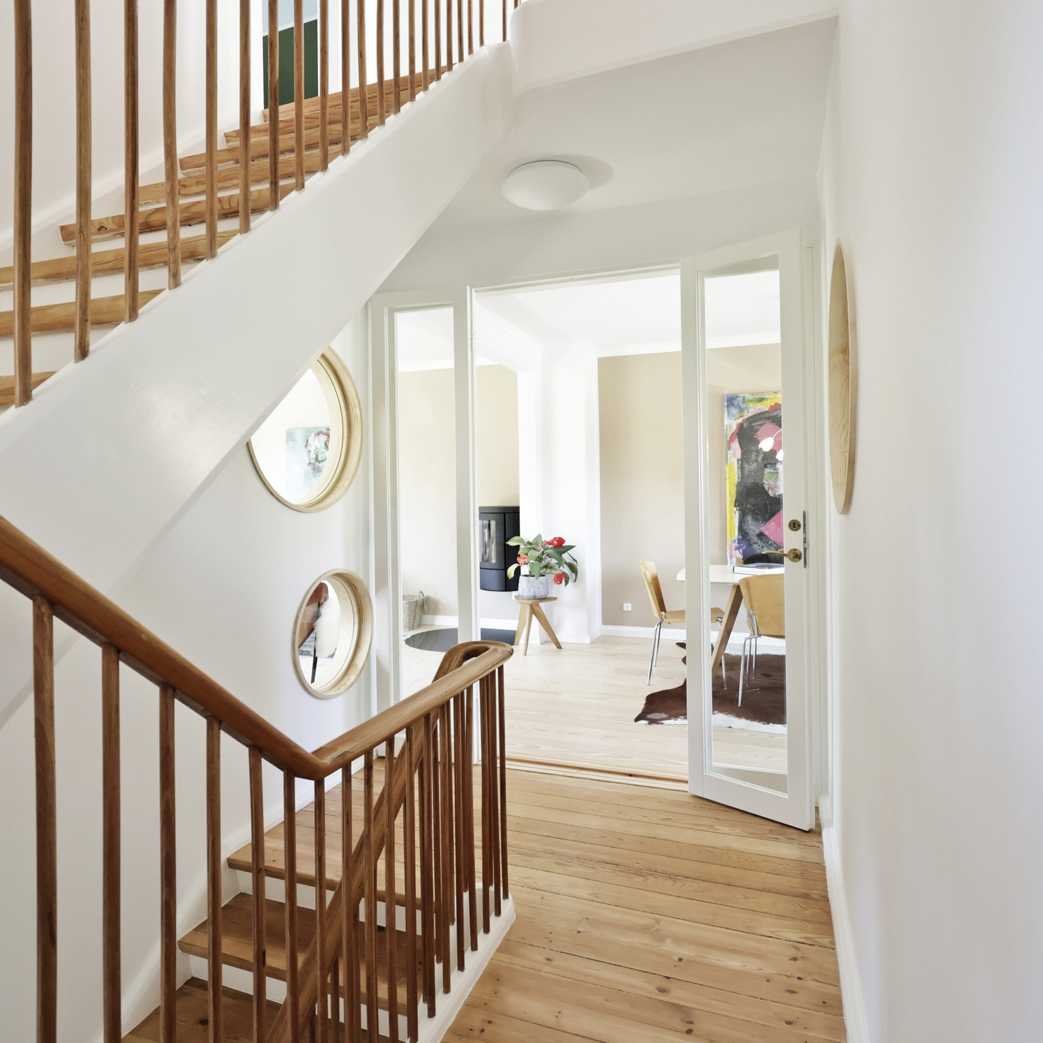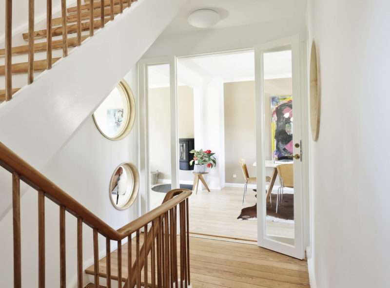 Sammenføjningen af stuer og trapperum med runde vinduer og et stort dørparti er med til at skabe et bedre flow og visuel forbindelse med husets øvrige etager