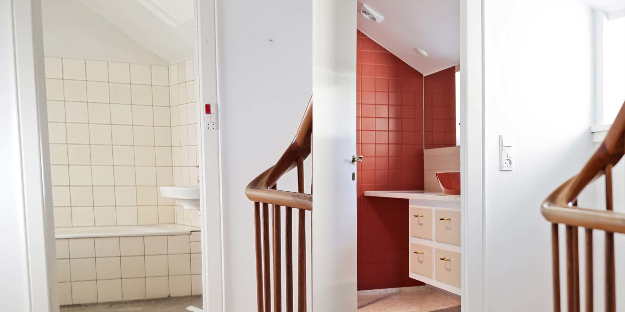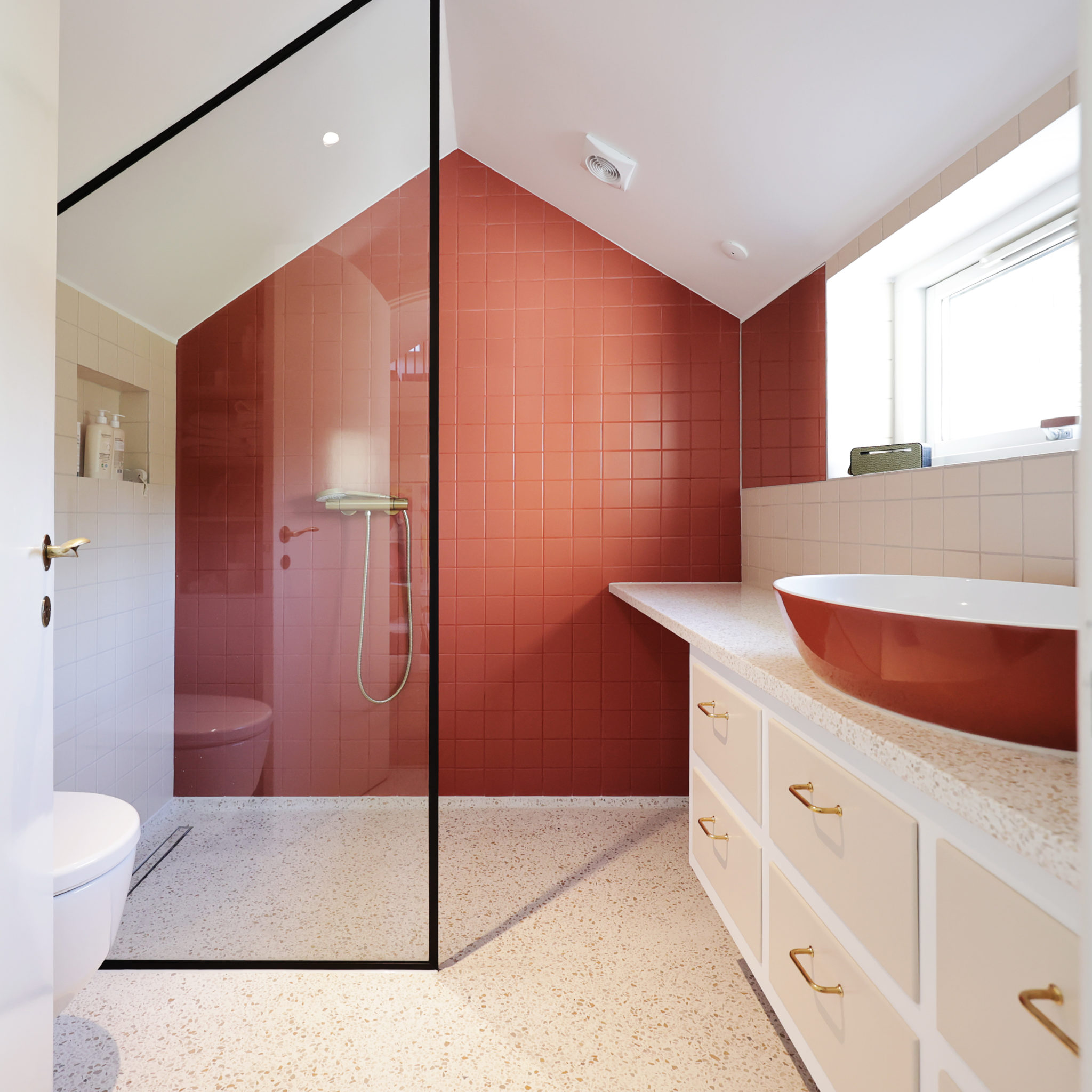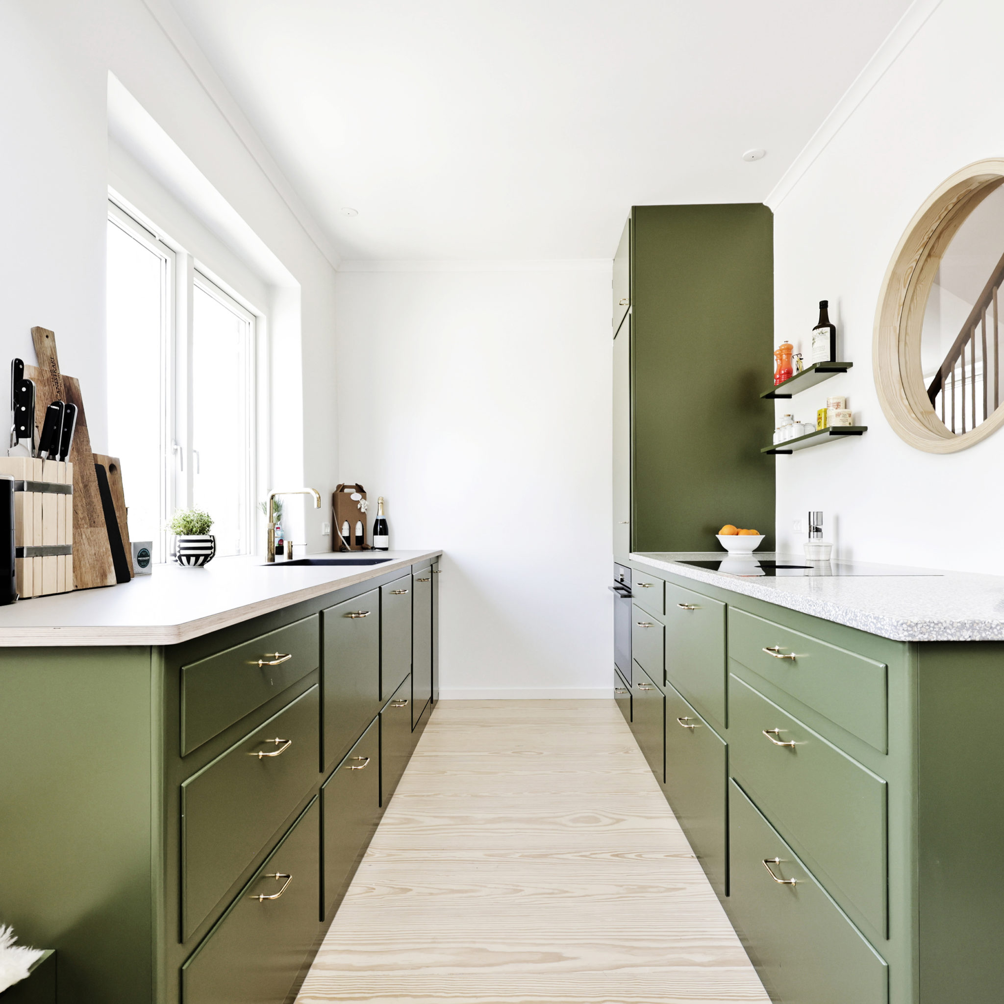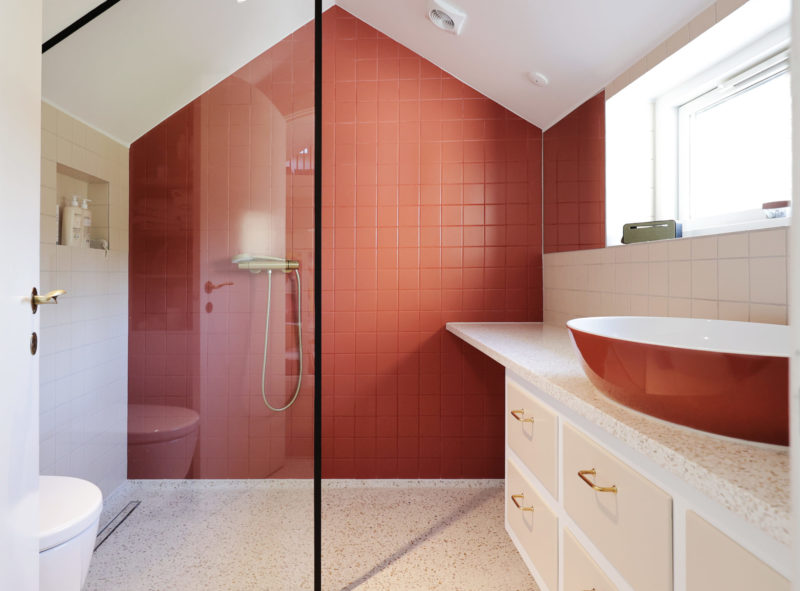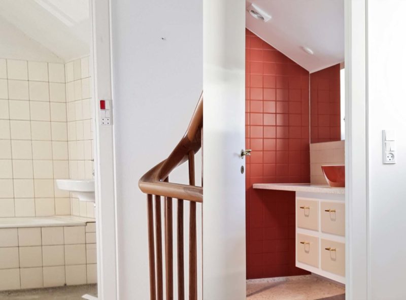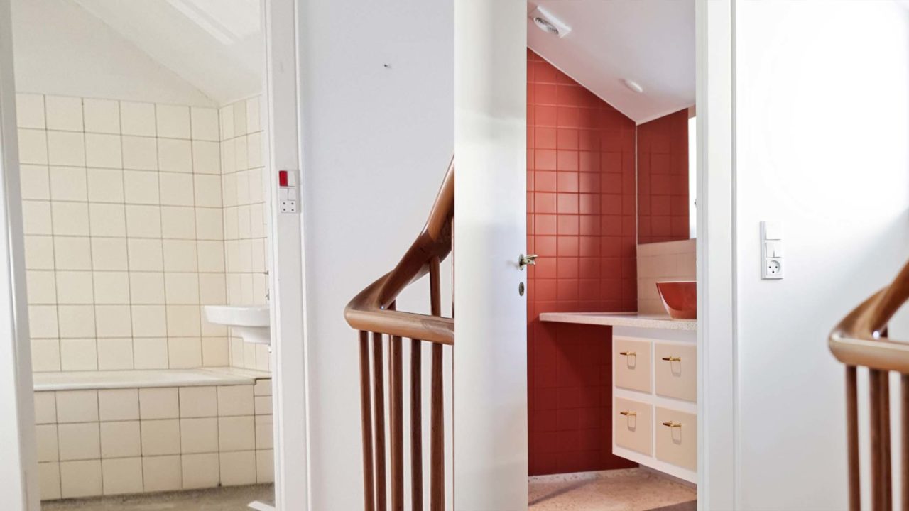 Bygherre ønskede at åbne op mellem rummene, samt etablere et fælles familiezone i stueetagen med køkken, spisestue og dagligstue. Tre rum blev føjet sammen, og der blev åbnet op til trappeopgangen, for at skabe en visuel forbindelse gennem huset. Som en reference til arkitektens ”champagnehuset”, blev der isat runde vinduer i forskellige størrelser. Badeværelserne blev renoveret med en intention om at bevare det oprindelige udtryk og materialitet, og derfor faldt valget bla. på terrazzo og fliser i en farvepalette fra arkitektens portfolio. Stueetagens nye mørkegrønne forramme køkken med terrazzobordplade er et stilrent og håndværksmæssigt element, der forener funktionalitet og æstetik.