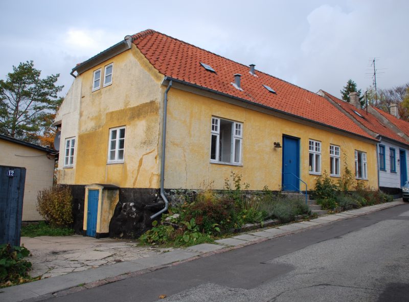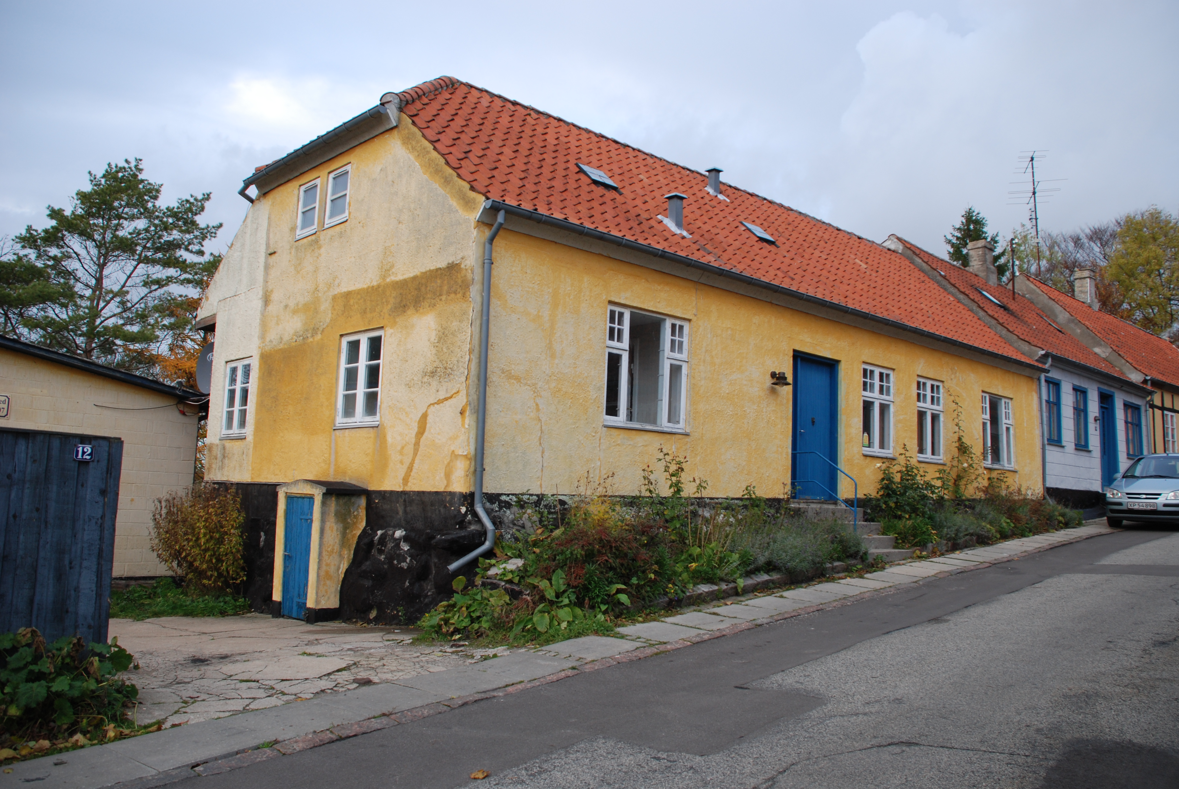 Et 250 år gammelt, nedslidt byhus med bindingsværk pakket ind i cement og plasticmaling på den ene side af huset, og røde mursten, termoruder og eternittag på den anden side af huset. + syltstenssokkel, som ikke var i frost(-og rotte-)sikker dybde.