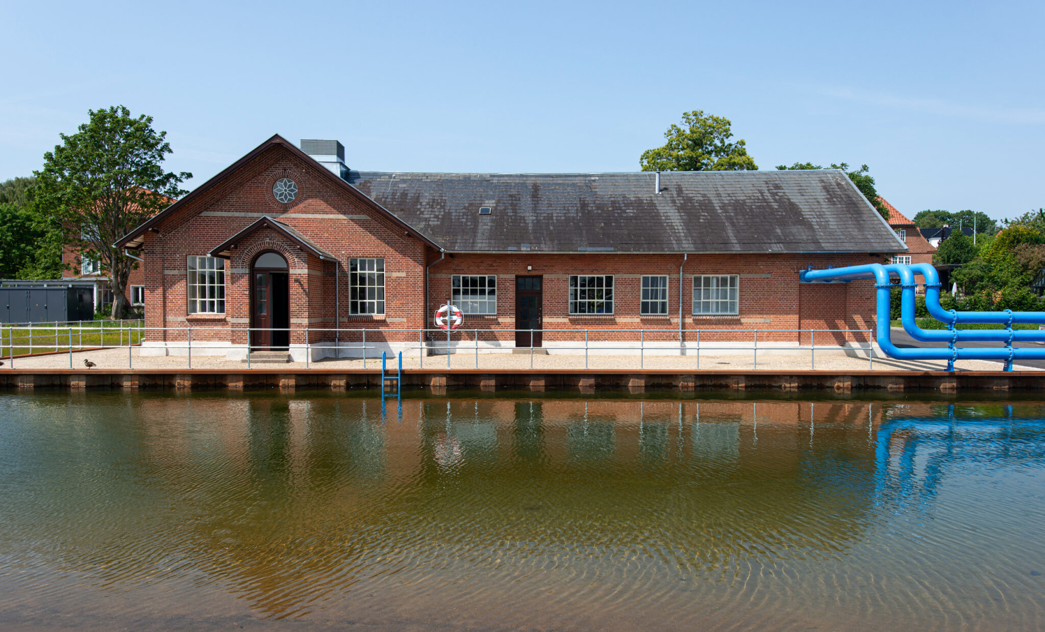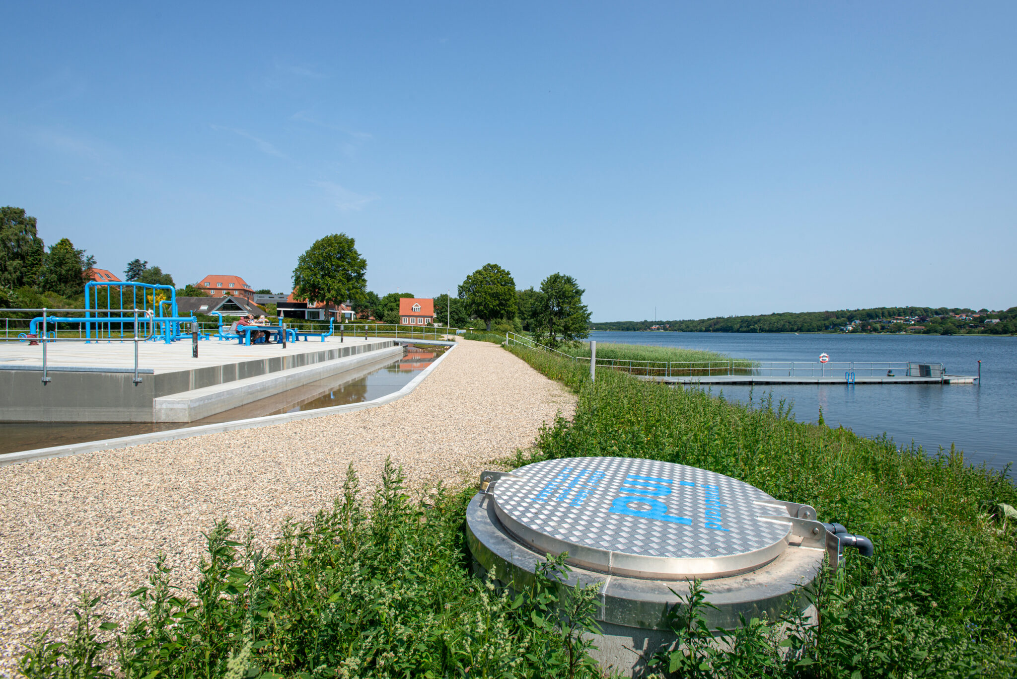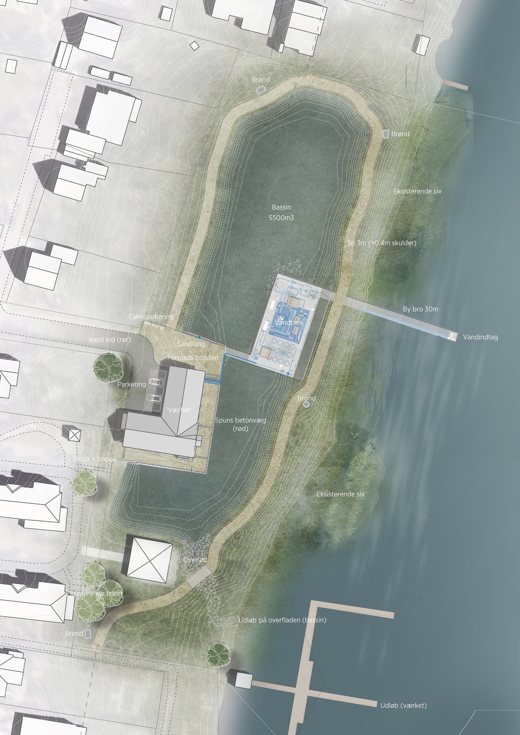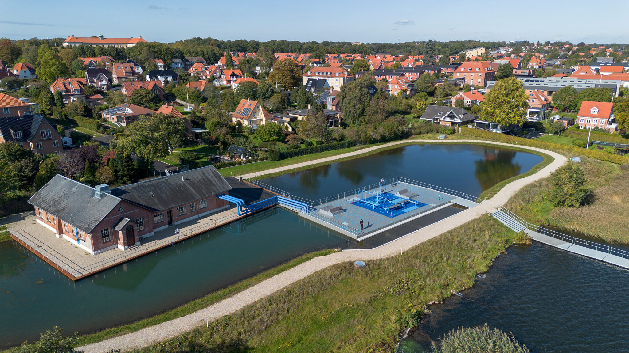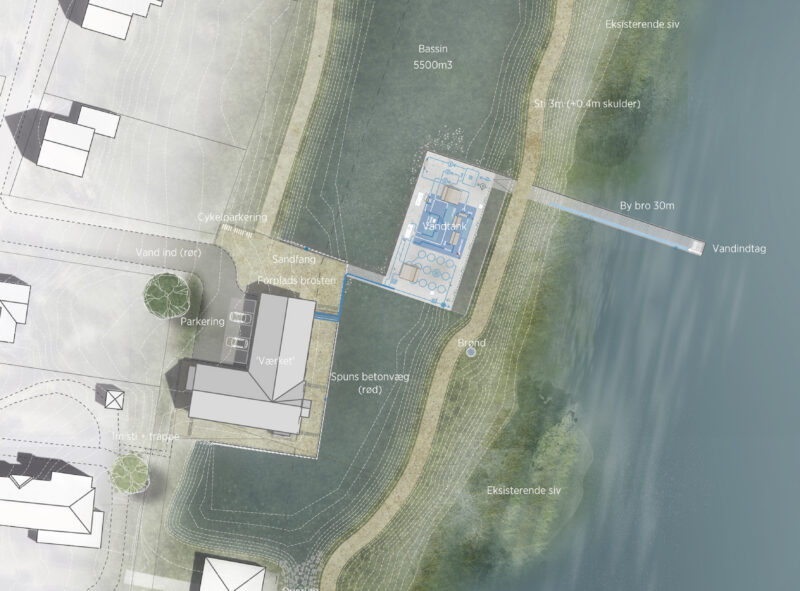 • Stiforløb, broer og terrænregulering gør det muligt at bevæge sig tæt på både bygninger, bassin og tekniske installationer uden at kompromittere sikkerhed eller drift.