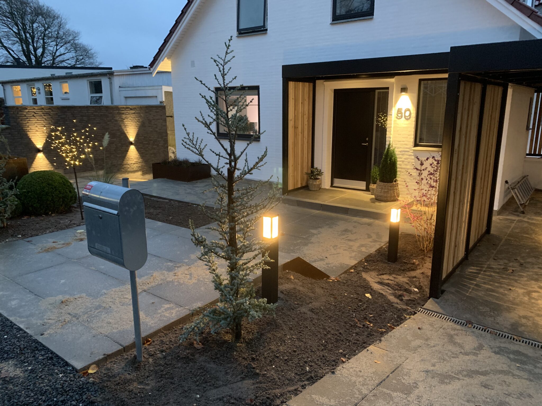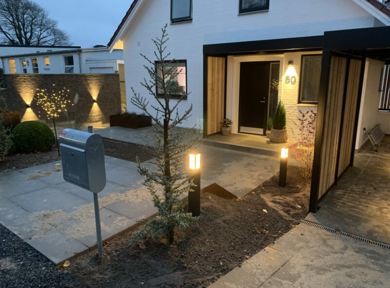 Samtidig med renoveringen af huset har haveanlægget ligeledes fået en gennemgribende renovering, hvilket bl.a. betyder en åbning af haven til begge siders naboer, for at skabe en mere naturlig rummelighed. Sammenhængen mellem havens anlæg rundt om huset helt har forandret husets udseende og iflg. Ejendomsvurderingen efterfølgende har dette ligeledes tilført huset en væsentlig værdistigning fordi der er skabt et komplet sammenhæng. At åbne huset og hele omgivelserne op har skabt et helt andet åbent miljø end det, som i mange år har været kendetegnene for Langsøhaverne med lukkede haver uden indkik og forbindelse mellem husene, Trækstien og den smukke sø. Havearkitektens videretegning af husarkitektens ide med at åbne huset op, er viderefortolket for at bringe søen ind i havens design og videre ind i huset, hvor indretningsarkitekten har bygget videre på søens natur tema.