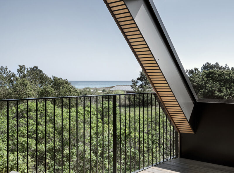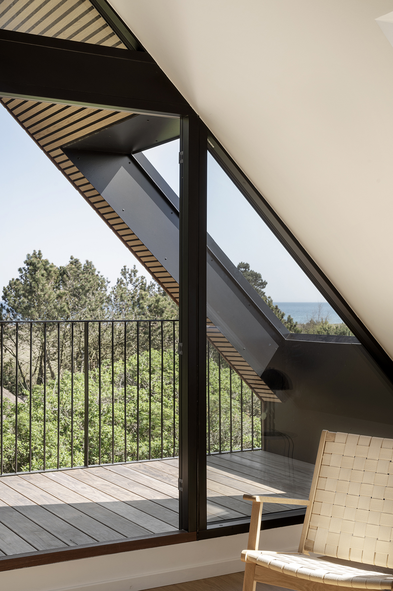 På førstesalen er der åbnet op til kip, og den tidligere meget lukkede gavl fremstår nu som et stort vinduesparti, hvorfra man har udsigt til trætoppene og kig til havet. Store skydedøre gør det i øvrigt muligt at åbne helt op til altanen, så ude og inde flyder sammen. I tagudhænget er der skåret en stor åbning, hvilket giver yderligere lys og udsyn.