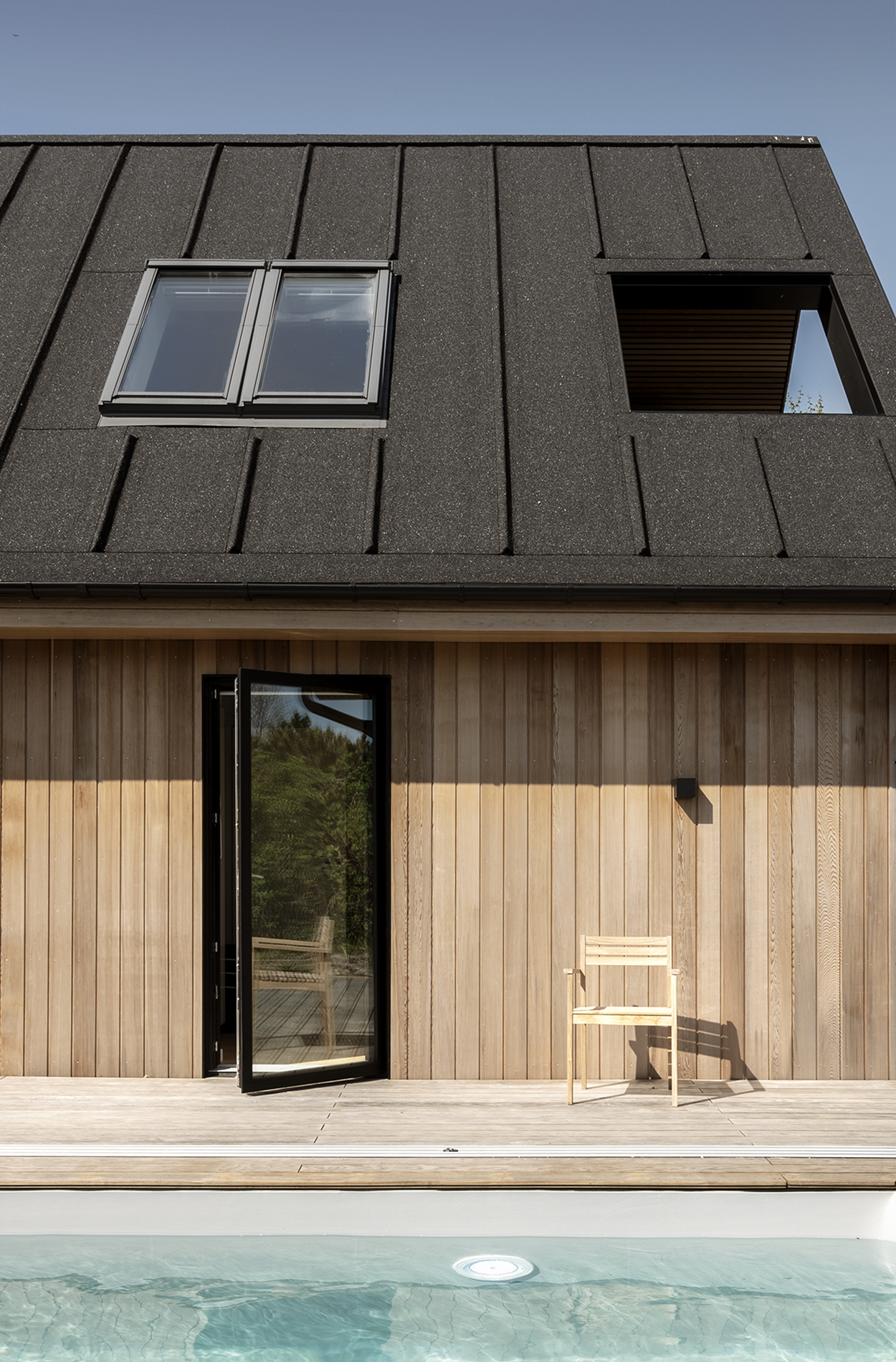 Et 70’er-hus med et tungt udtryk er totalrenoveret og har fået et helt nyt udtryk, der matcher funktionen som sommerhus. Det eksisterende hus er efterisoleret, har fået ny klimaskærm i træ og en ny tilbygning er tilføjet. Tilsammen udgør sommerhuset nu en række forskudte volumener med en komposition over saddeltaget.