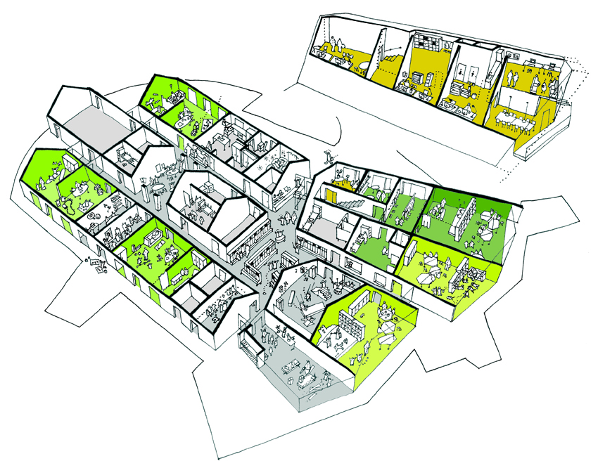 Ombygningen respekterer den nuværende arkitektur, med en stor grad af genanvendelse af den gode eksisterende struktur i råhuset. Tilbygningen tilpasser sig grunden og den eksisterende bygning, samt tilfører Spiloppen en ny og spændende organisering.