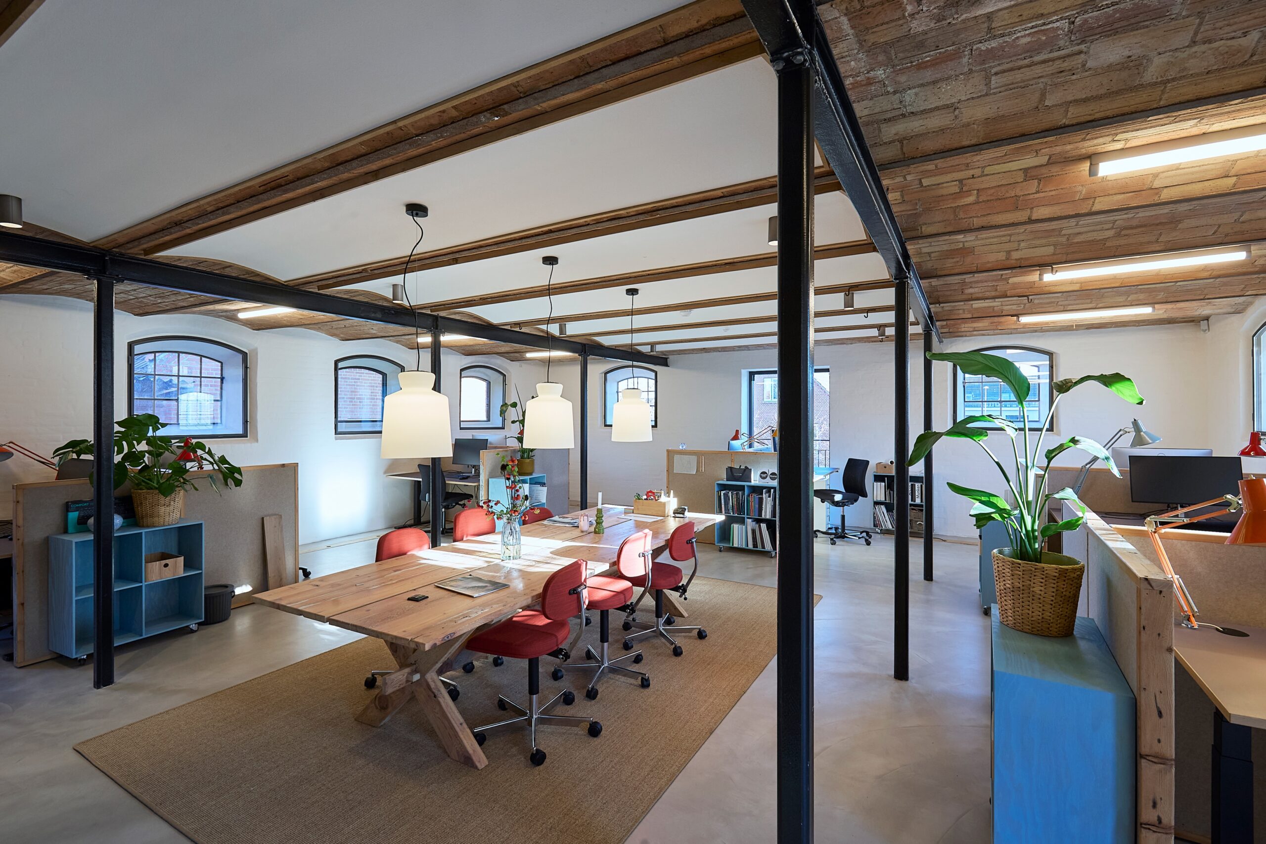 - De synlige stålstolper og -bjælker under det hvælvede loft istandsat