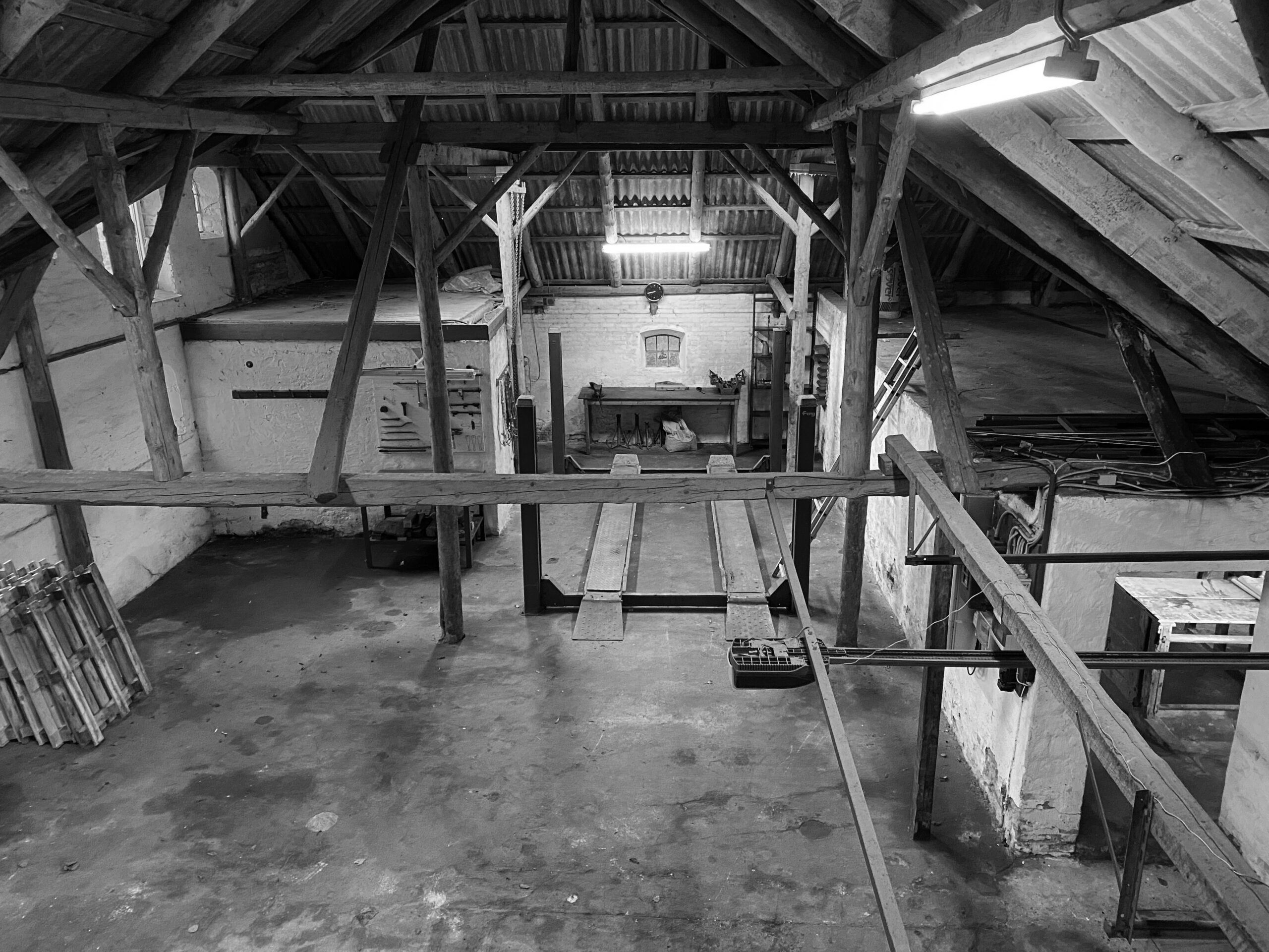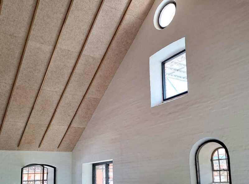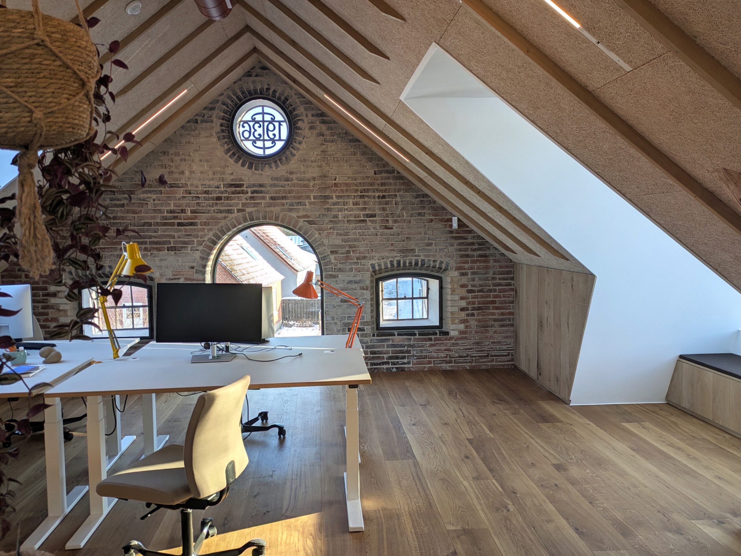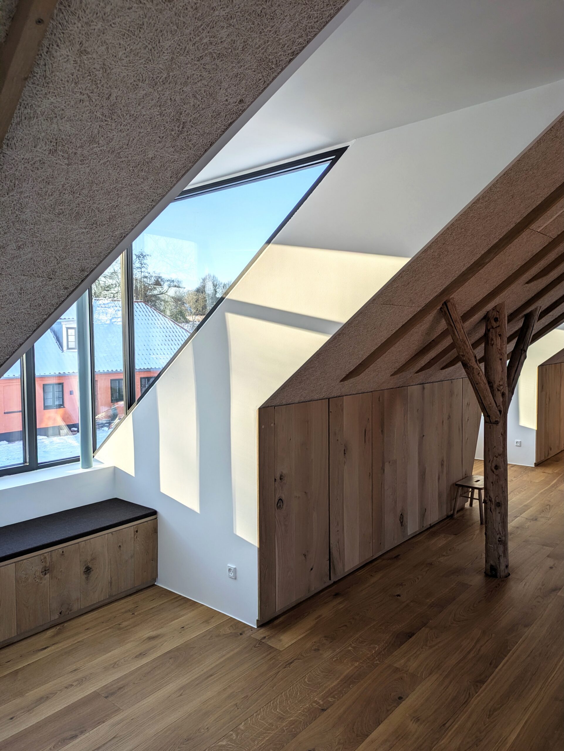 Loftsrummet er en oplevelse i sig selv – særligt det lange kig fra gavl til gavl, hvor to cirkulære vinduer skaber en visuel og symbolsk forbindelse mellem fortid og nutid. Mod øst det oprindelige, ikoniske gavlvindue med årstal. Mod vest det nye, store cirkulære vindue – en fortolkning og forstørrelse af det gamle, som en spejling og et ekko i nutiden.