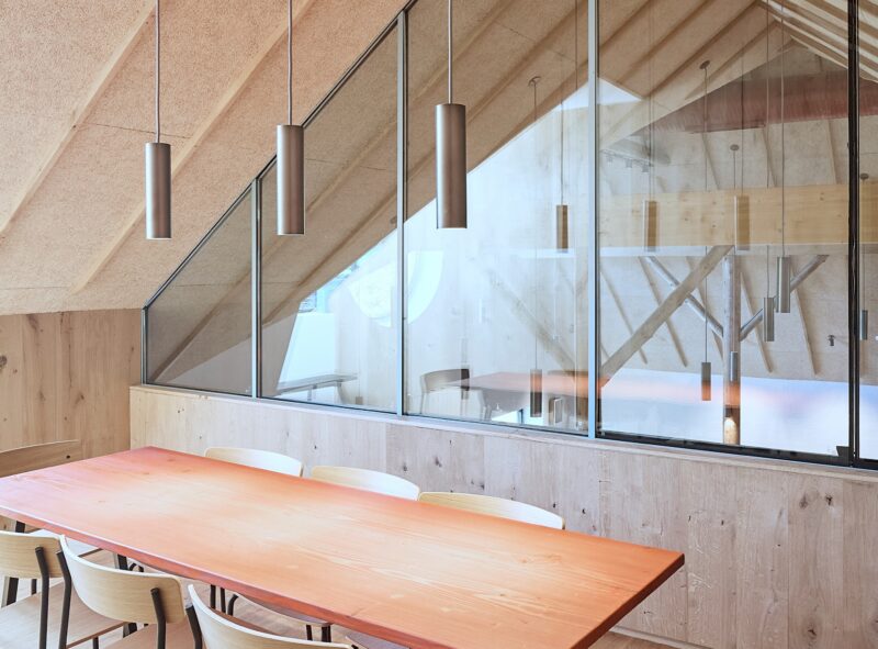 Engang blev kvistene brugt til at hejse hø ind og ud af loftsrummet. Idag bringer de dagslys og rummelighed ind i kontorfællesskabet. Inspireret af papirfoldninger skyder kvistene sig frem som skarpe snit i tagfladen. Et karakterfyldt greb, der viser, at her er sket noget nyt.