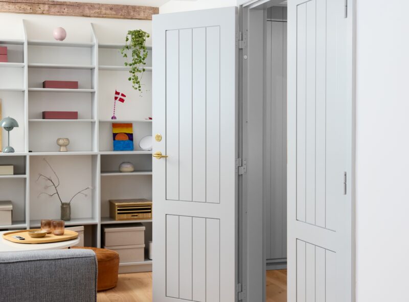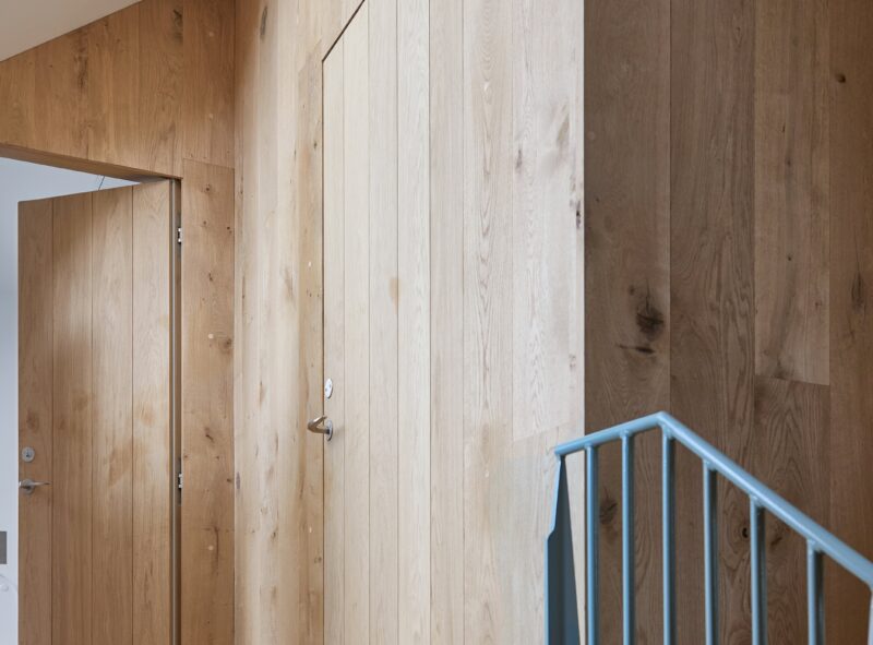 Fast inventar såsom skabe, bænke og reolvægge er specialdesignet og udført i egetræ med bræddebeklædte fronter, der går i ét med de indvendige vægge og døre. Projektet kombinerer hele vejen igennem en moderne arkitektonisk tilgang, håndværksmæssig høj kvalitet og respekt for de historiske kvaliteter.