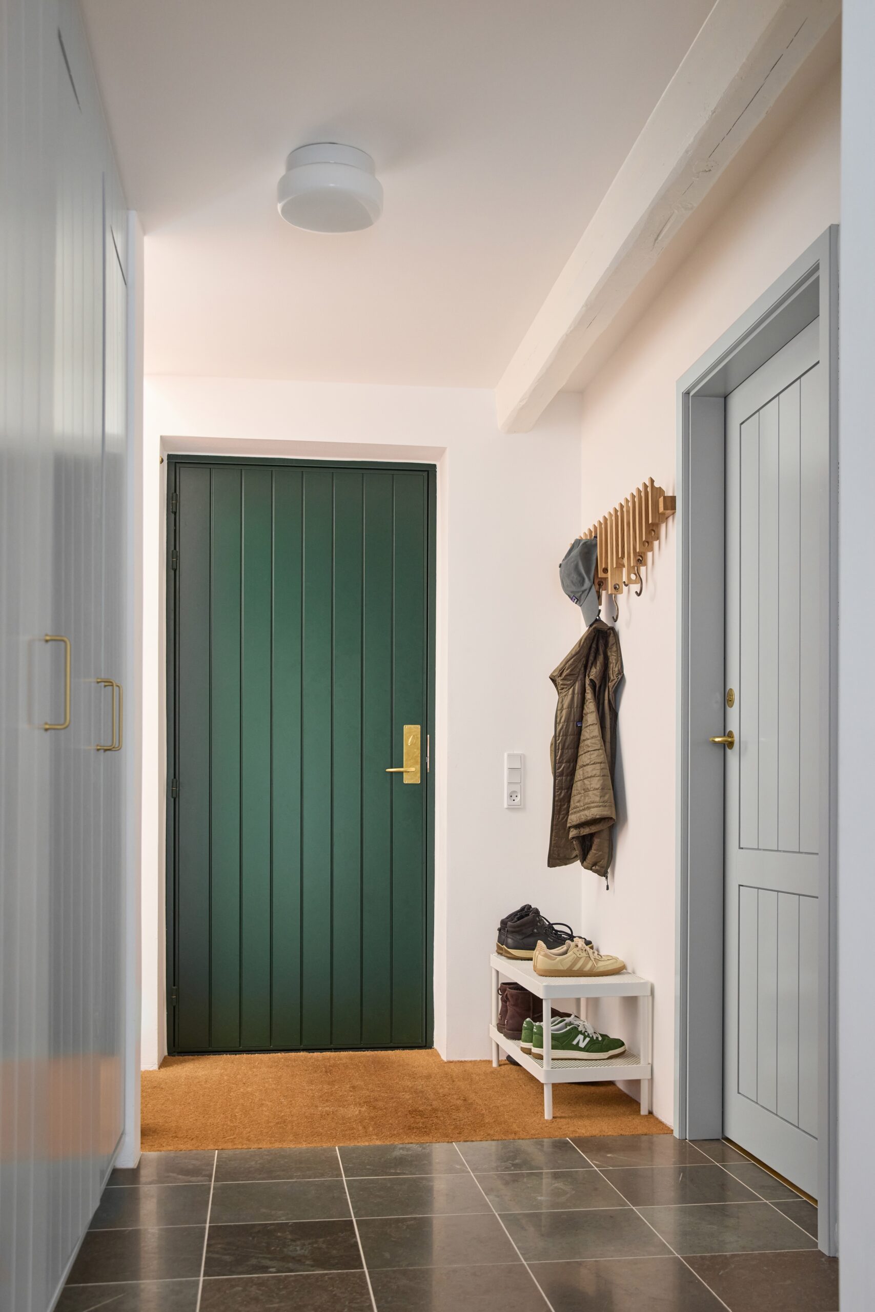 I det historiske stuehus er ydermure og syldsten er nænsomt restaureret og synlige bjælker – nogle med dekorative frisebemalinger – er bevaret. Farvesætningen tager afsæt i traditionelle farver, og armaturer fremstår i messing. Inventar og døre er nyfortolket i enkel bondehusstil og holdt i en lys grå tone, der skaber et roligt og sammenhængende interiør. En moderne fortolkning af boligen på landet.