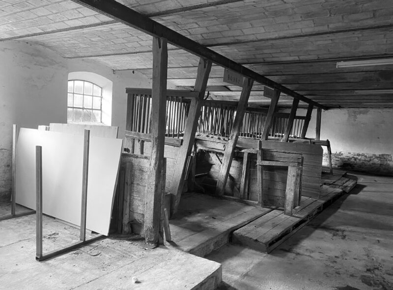 - Nye funktioner i stalden (mødelokaler, køkken, toiletter, teknikrum) sat ind som ‘en trækasse’, der underordner sig den tunge konstruktion