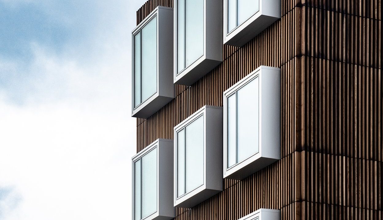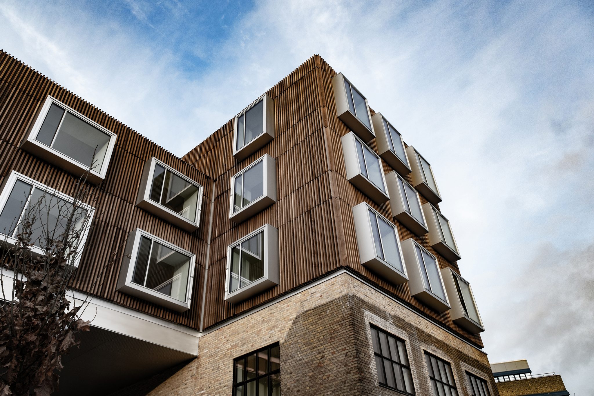 Der er ikke gået på kompromis med materialer. Asketræet, der pakker de tre øverste etager ind er et godt eksempel. Karnapperne er skabt, for at give en lille ekstra opholdsplads og gode lysforhold i de traditionelt små studieboliger.
