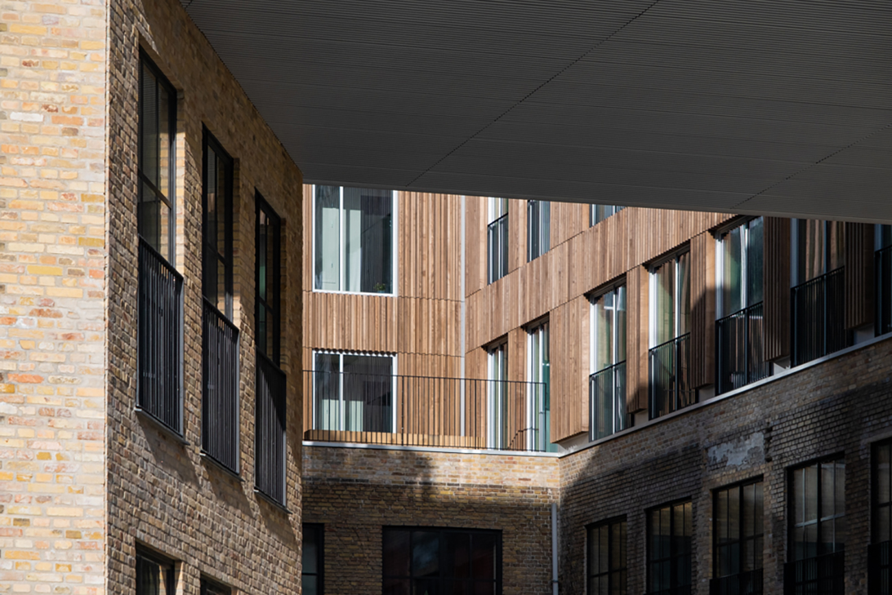 De tilføjede etager spænder ud over gårdrummet som en bro – en klar sanselig opfattelse af, at tilføjelsen med træbeklædning ligger let ovenpå den eksisterende tungere bygning i tegl. Det samlede areal fordobles, samtidig med at den snart 100 år gamle industribygning dikterer formen for sin egen udvidelse opad.