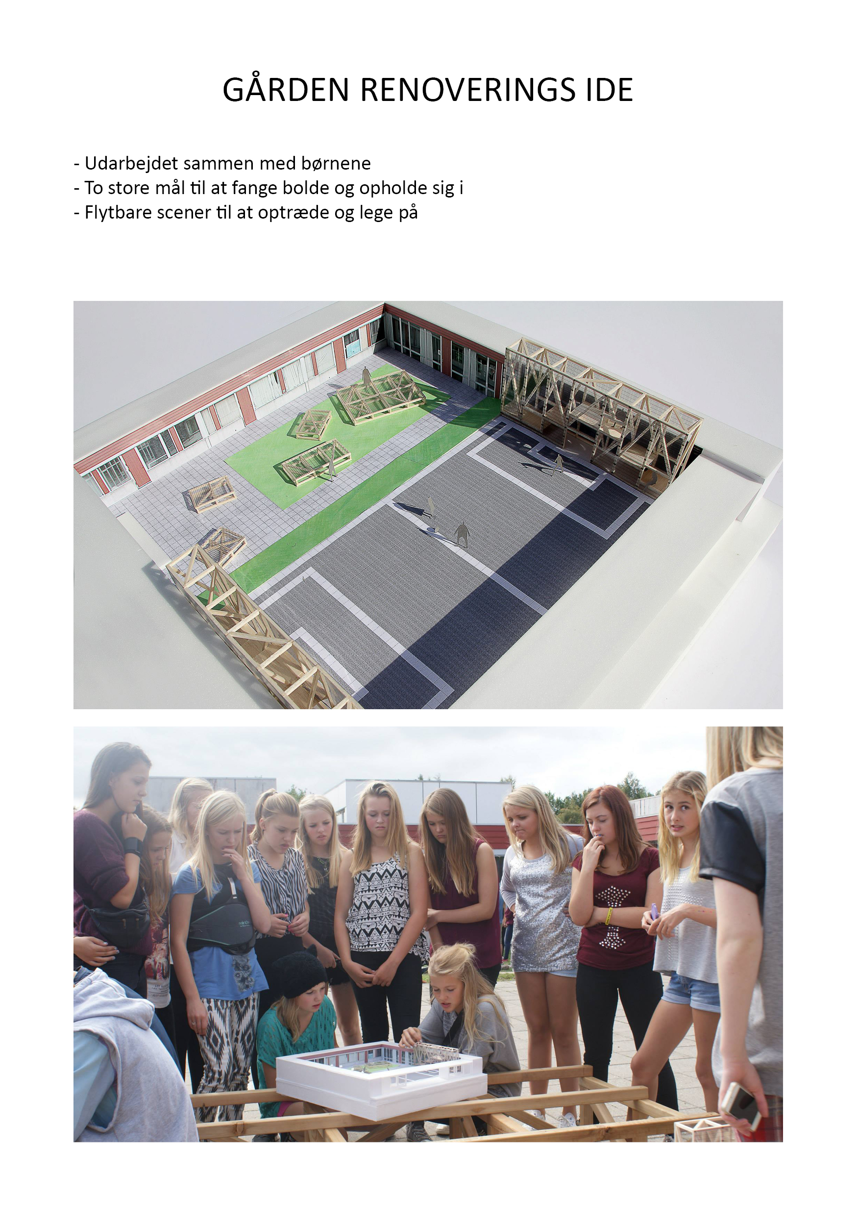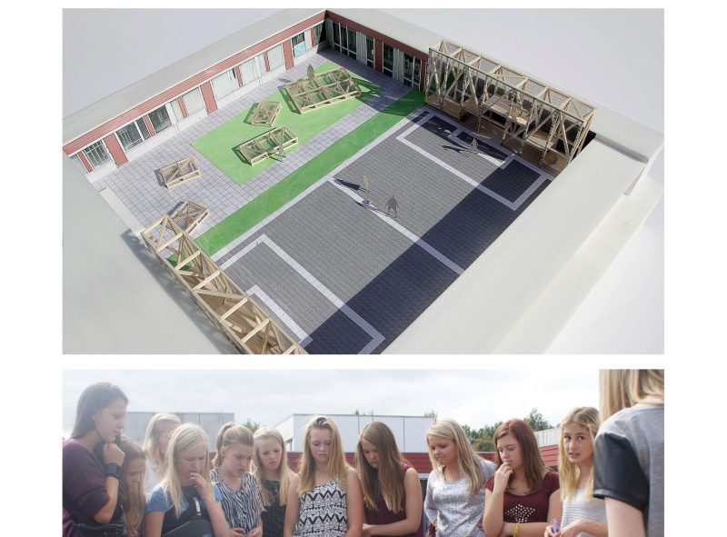 4 udendørs projekter på skolen blev realiseret, og et af dem, Gården, blev et fint renovationsprojekt af et nedslidt gårdrum. Her spillede de unge fodbold men smadrede facadematerialerne og skød ofte bolden op på de lave tage, hvor de så også selv havnede.. ofte.