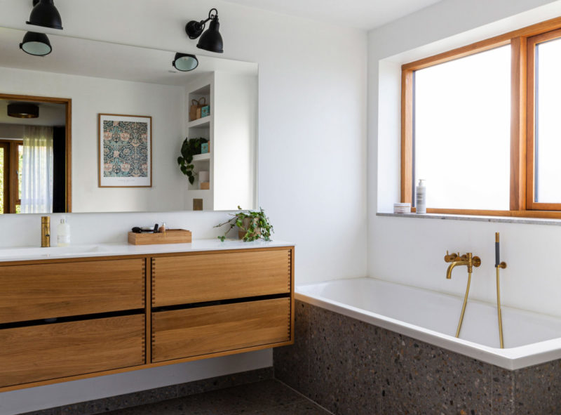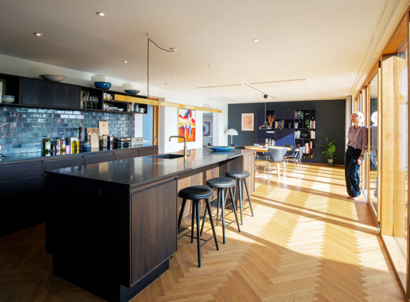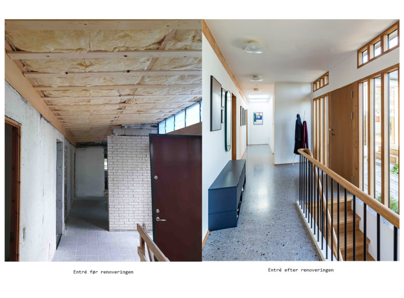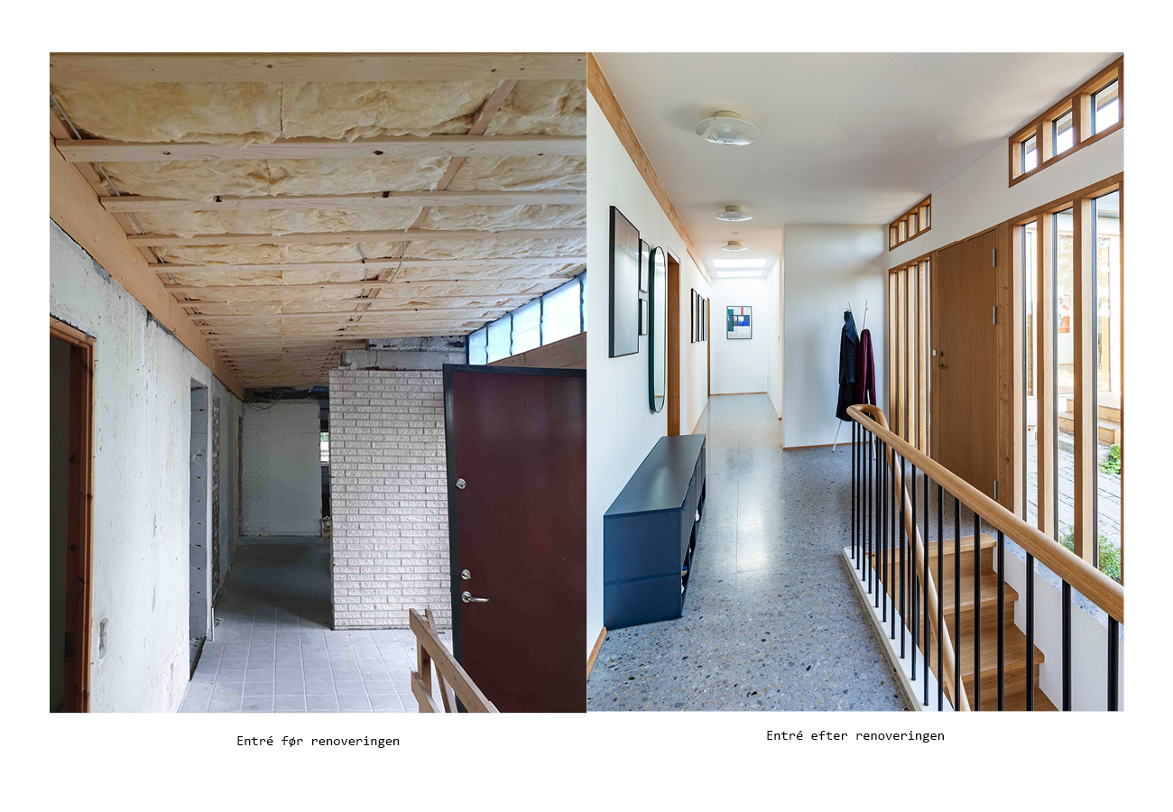 Huset blev fuldstændig strippet for indmad, og køkken og badeværelser blev etableret på nye placeringer. De nye materialer er alle af meget høj kvalitet og valgt i fin samstemning med hinanden.