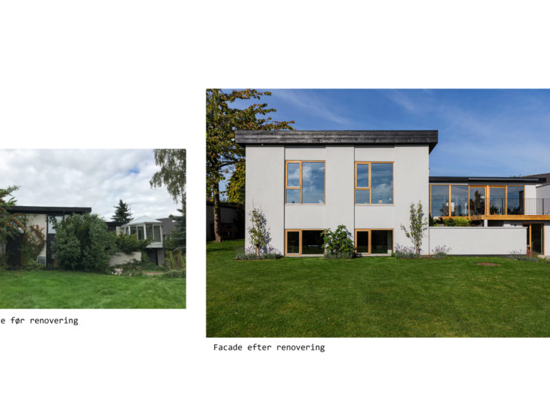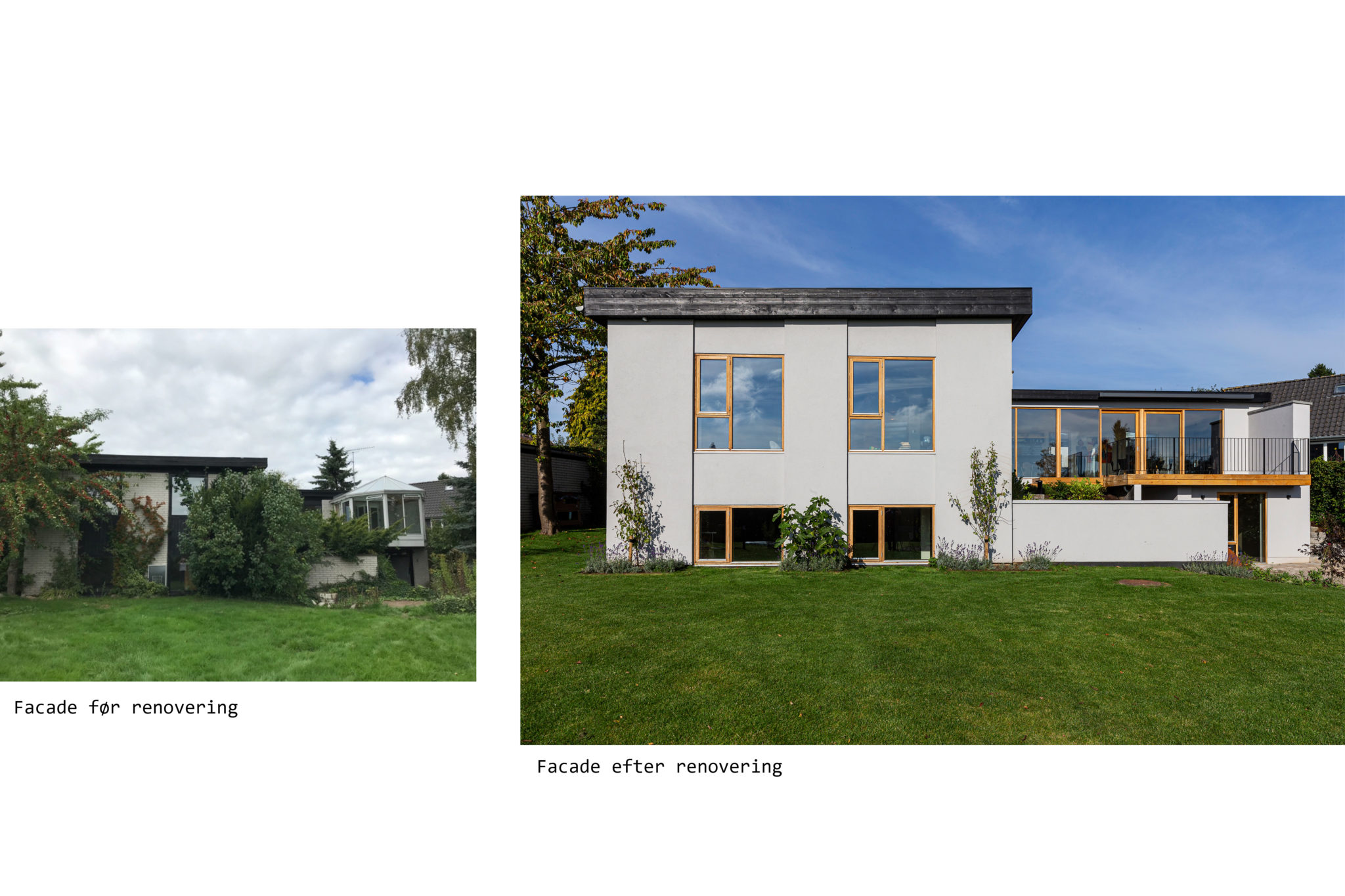 Derfor blev huset efterisoleret udvendigt og pudset i en lys, varm hvid. Alle vinduespartier blev skiftet og forøget. Det gamle glas og dørparti blev udført på ny, men som det eksisterende, hvorimod vi tegnede de øvrige vinduer helt om. Disse er udført med store faste glaspartier og mindre partier som kan åbnes.