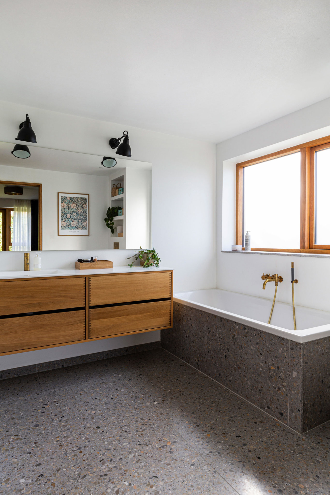 Som arkitekt lyttede vi til bygherres behov og udfordrede dem med materialevalg samt indretning af badeværelser. Derefter tegnede vi den nye tilbygning, som skulle have forbindelse til både køkken-alrum og kælder. Dette endte i et hus, der nu har et helt andet stilsprog end det oprindelige, en villa med en stærk konsekvens i dens æstetik og et helt fantastisk og unikt hjem til en moderne famille.