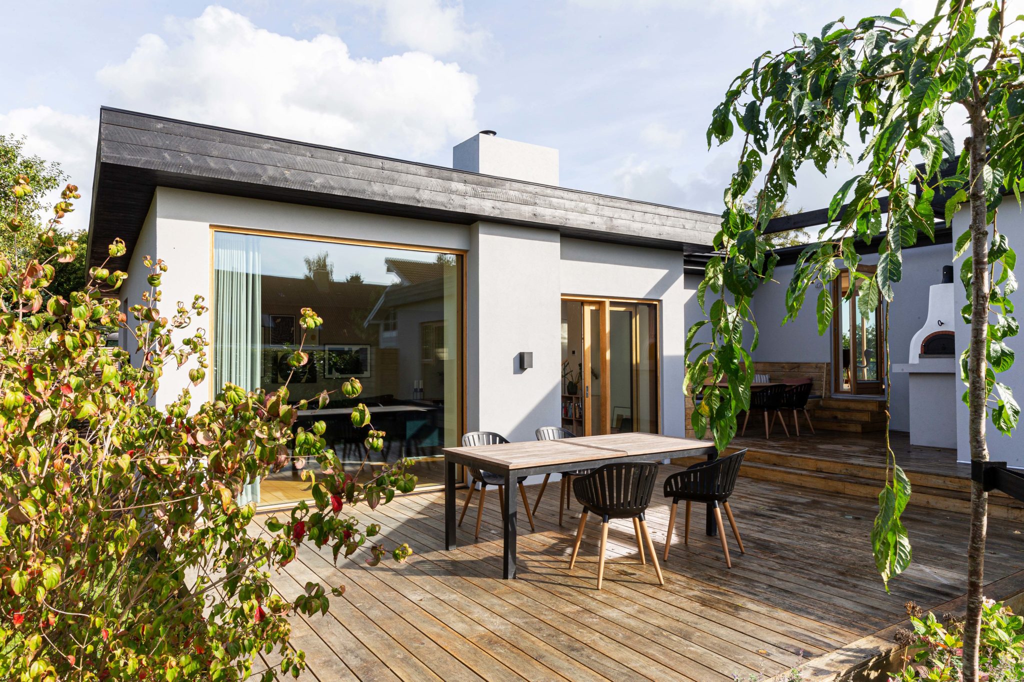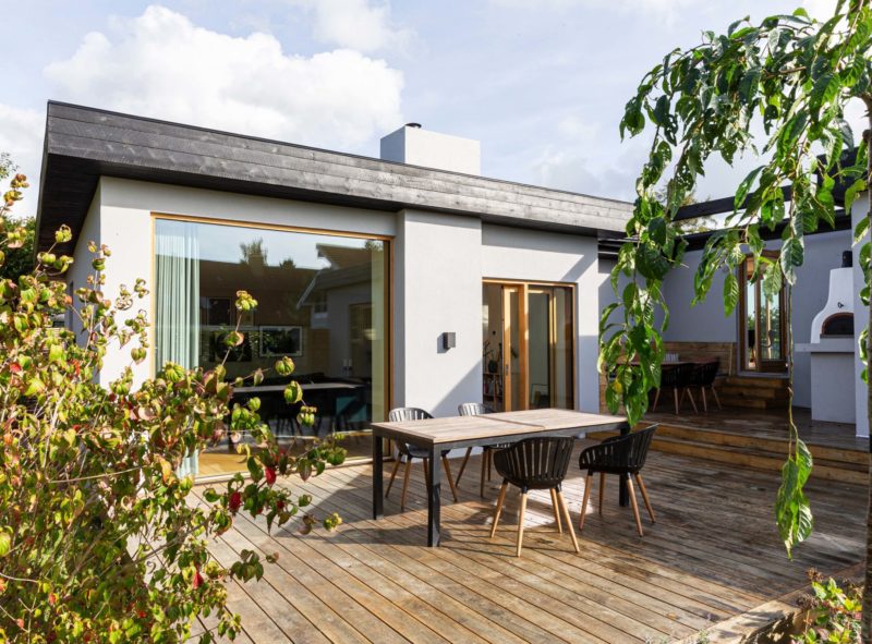 Vi udførte en tilbygning og terrasse i læ bag huset. Her blev plads til pizzaovn og et indhak til en hyggelig spisekrog.