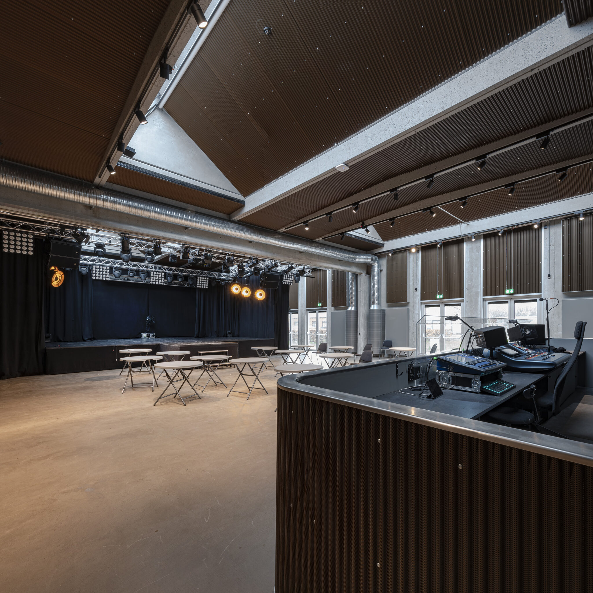 Spillestedet er først og fremmest et koncertsted. Lofter, vægge og bardiske er forsynet med akustisk dæmpning udført af paneleri perforerede anodiserede aluminiumspaneler i en mørk bronzefarve, så akustikken bliver ideel til elektronisk forstærket musik. Spillestedet er holdt i mørke farver, så de optrædende på scenen træder frem til aftenernes koncerter. Metaloverfladerne understreger den rå karakter med en kontrast til betonen. Den originale traverskran er bevaret i foyeren, hvor den byder velkommen sammen med vægge beklædt med messing mosaikker der sætter stemningen til aftenens koncert. Spillestedet er indrettet med foyer, garderobe og toiletter, loungeområde, bar, mixerpult, backstagerum med tekøkken, møderum, depotrum og teknikrum.