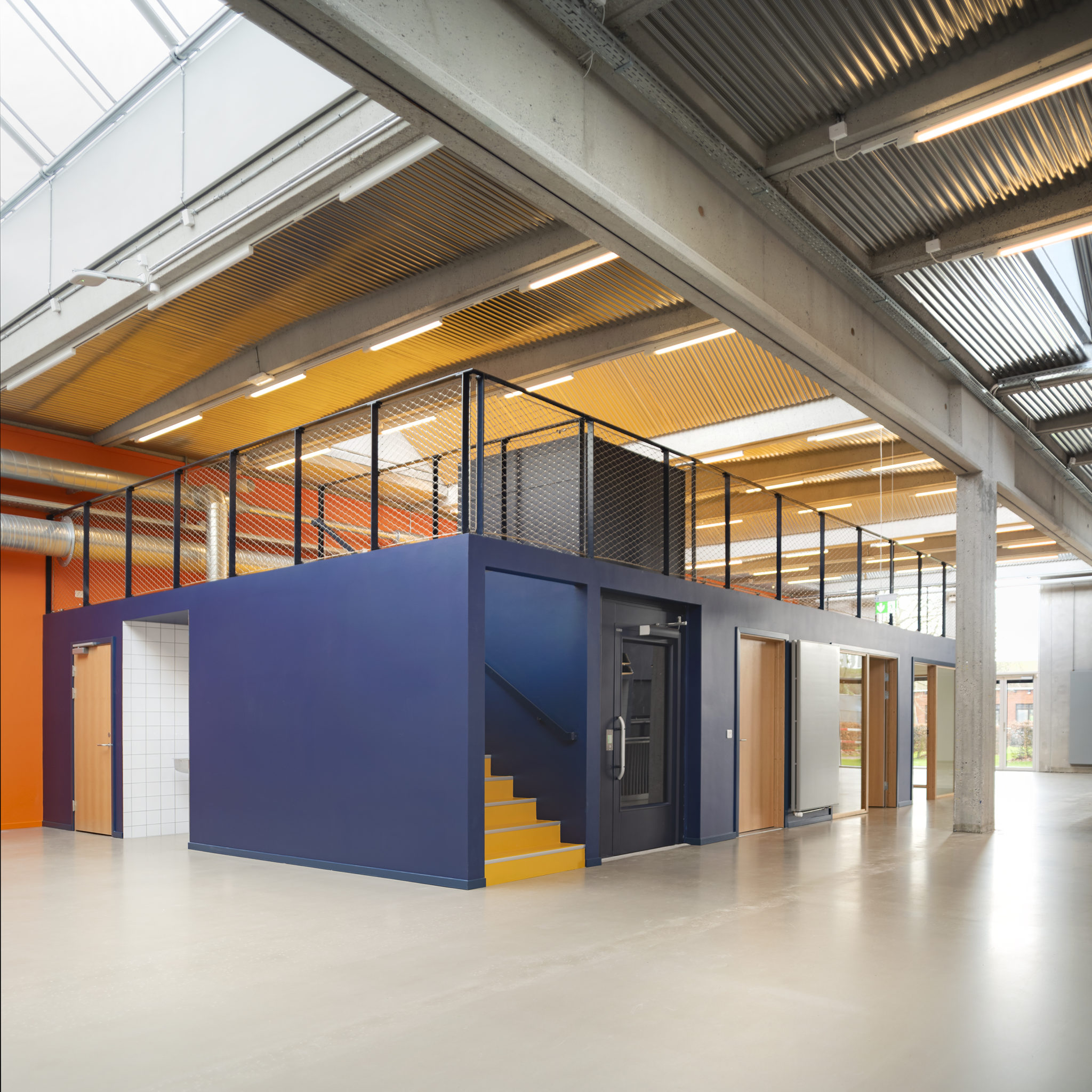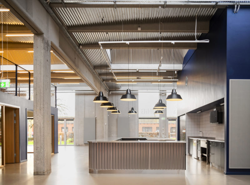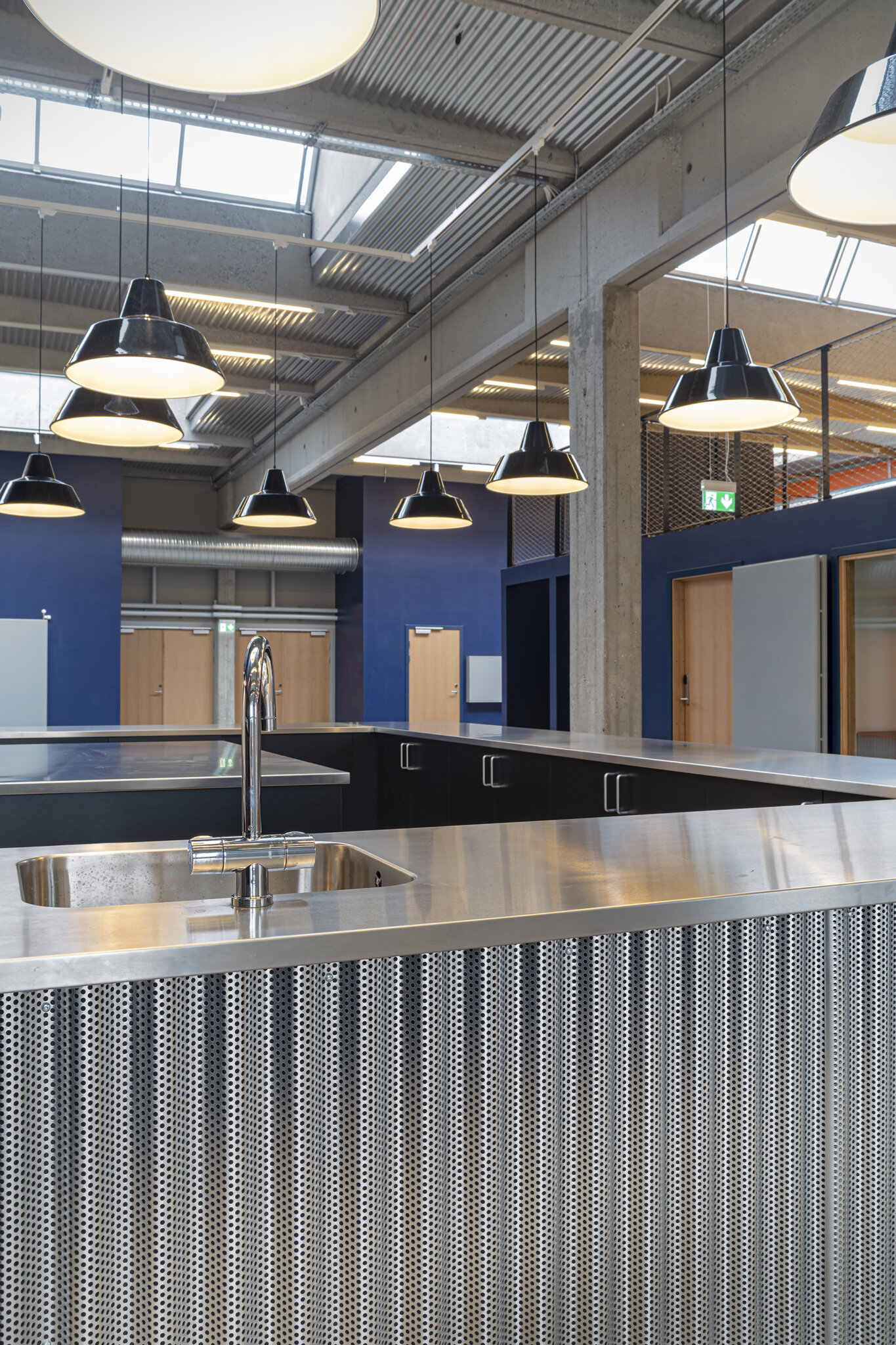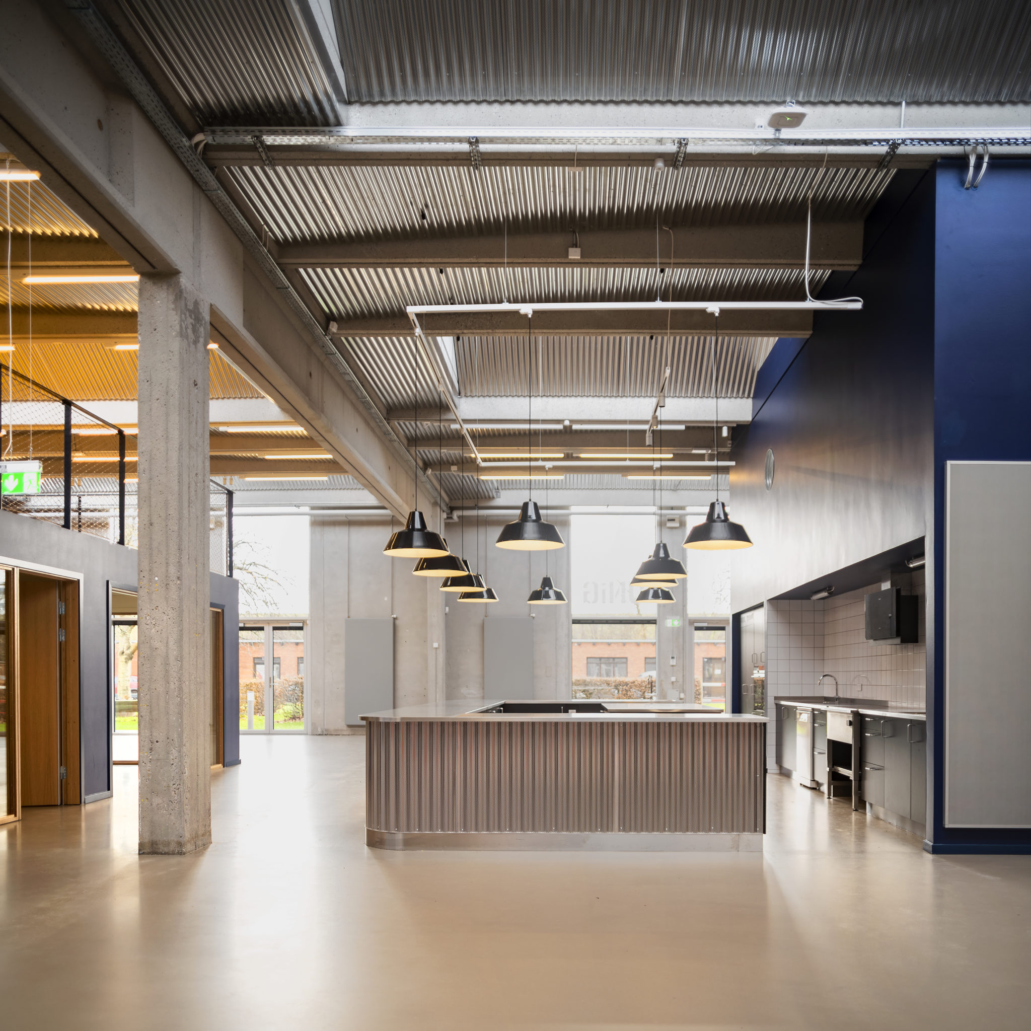 Alle overflader i fabrikken er afrenset til den rå beton, så fabrikkens fine konstruktioner træder synligt frem i betonens materialitet. I den rytmiske facade med de profilerede betonelementer, er vinduernes brystninger og øvre felter skåret ud, og nye rumhøje glaselementer med døre er etableret, så der kommer varmt lys fra syd ind i rummene, der balancerer det kølige lys fra de nordvendte ovenlys, og skaber en direkte relation mellem ude og inde. Facaden åbnes dermed op, og også udadtil viser bygningens nye funktioner. Udearealet er bearbejdet nænsomt med nyt forareal til ankomst langs bygningen og ophold/arrangementer samt cykelparkering, og er en del af det samlede ungemiljø.