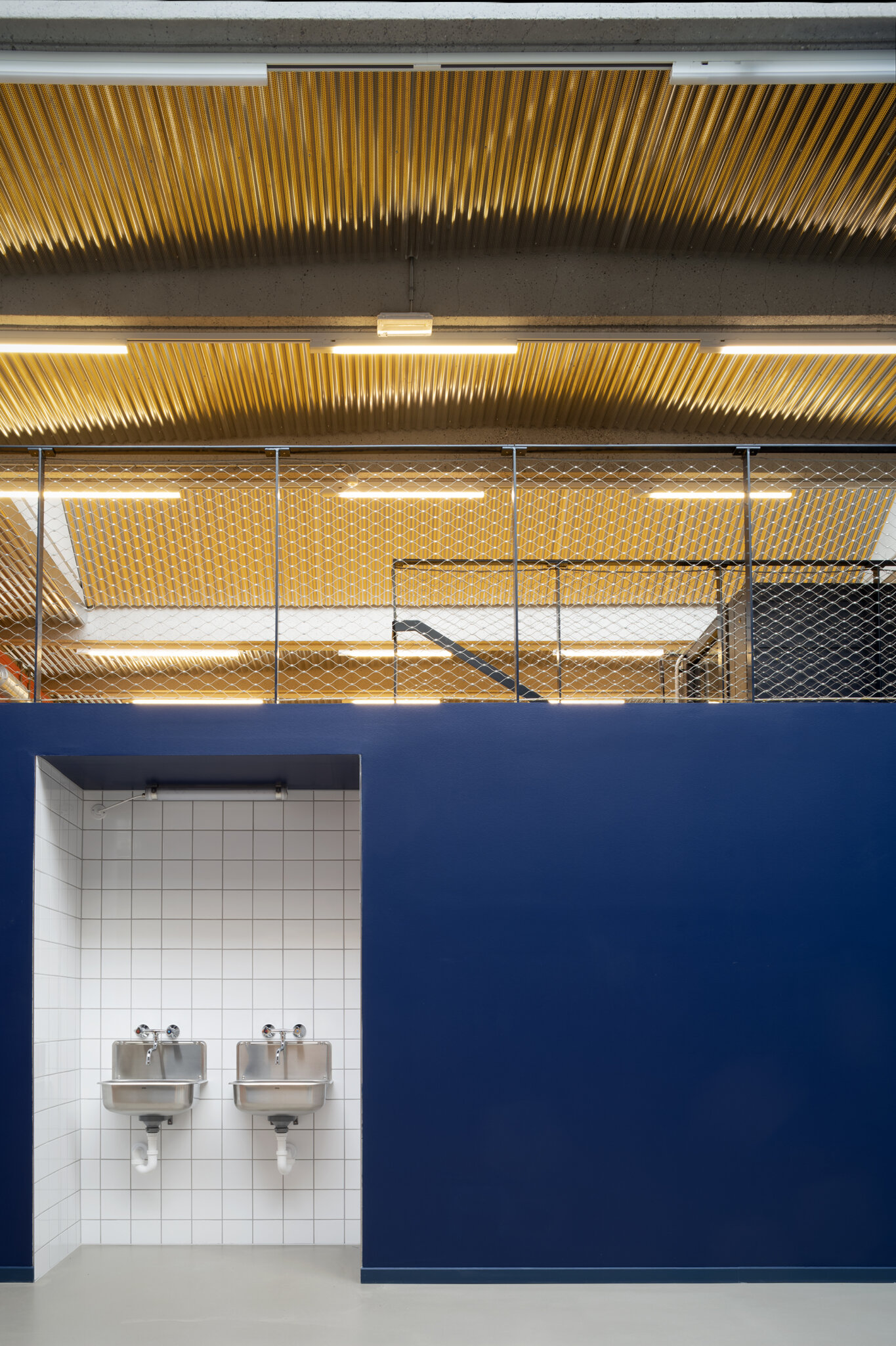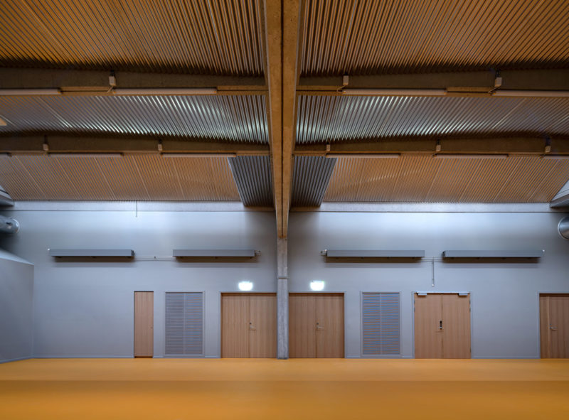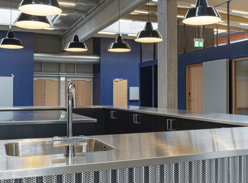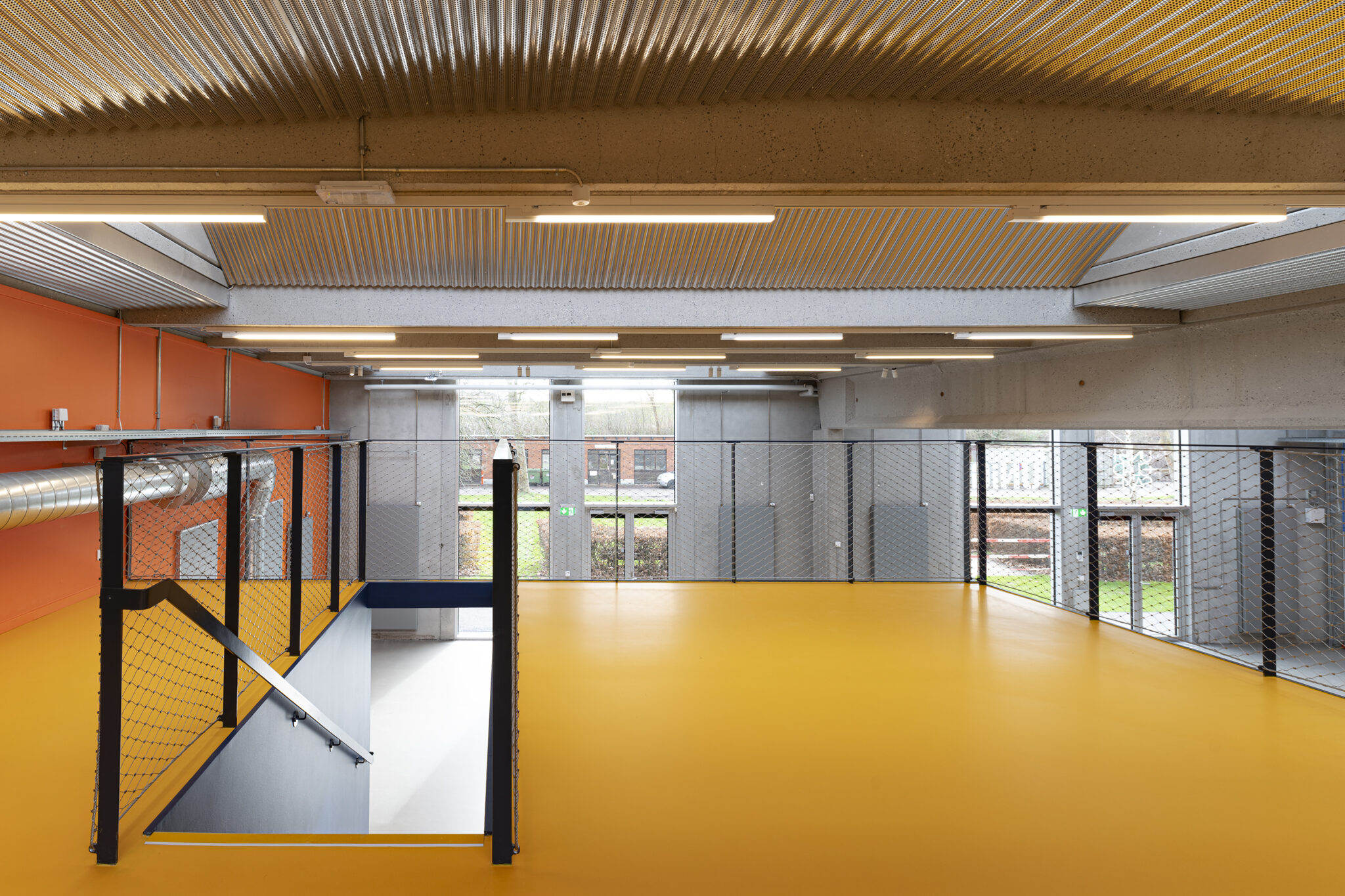 Alle overflader i fabrikken er afrenset til den rå beton, så fabrikkens fine konstruktioner træder synligt frem i betonens materialitet. I den rytmiske facade med de profilerede betonelementer, er vinduernes brystninger og øvre felter skåret ud, og nye rumhøje glaselementer med døre er etableret, så der kommer varmt lys fra syd ind i rummene, der balancerer det kølige lys fra de nordvendte ovenlys, og skaber en direkte relation mellem ude og inde. Facaden åbnes dermed op, og også udadtil viser bygningens nye funktioner. Udearealet er bearbejdet nænsomt med nyt forareal til ankomst langs bygningen og ophold/arrangementer samt cykelparkering, og er en del af det samlede ungemiljø.