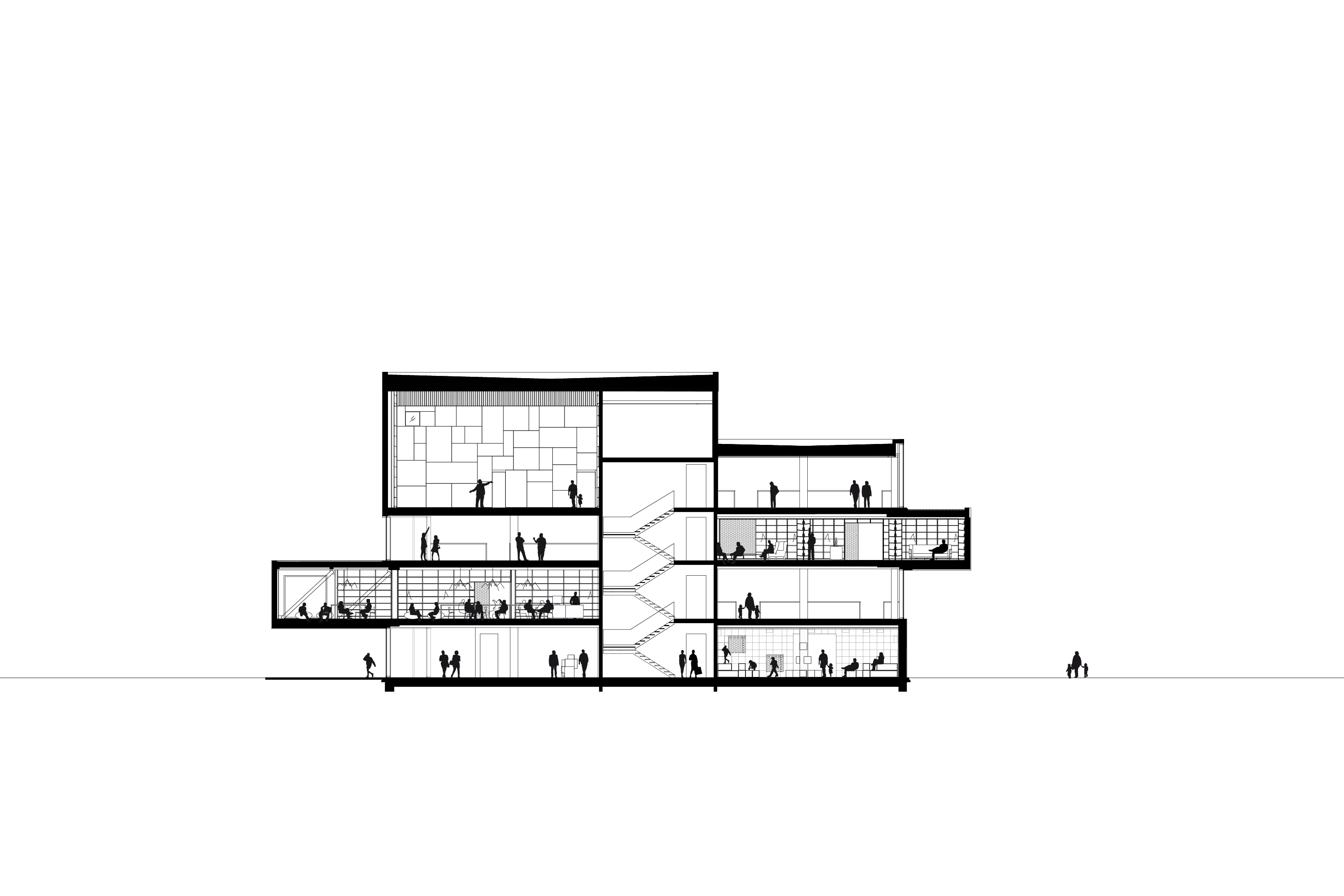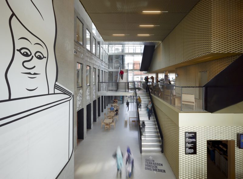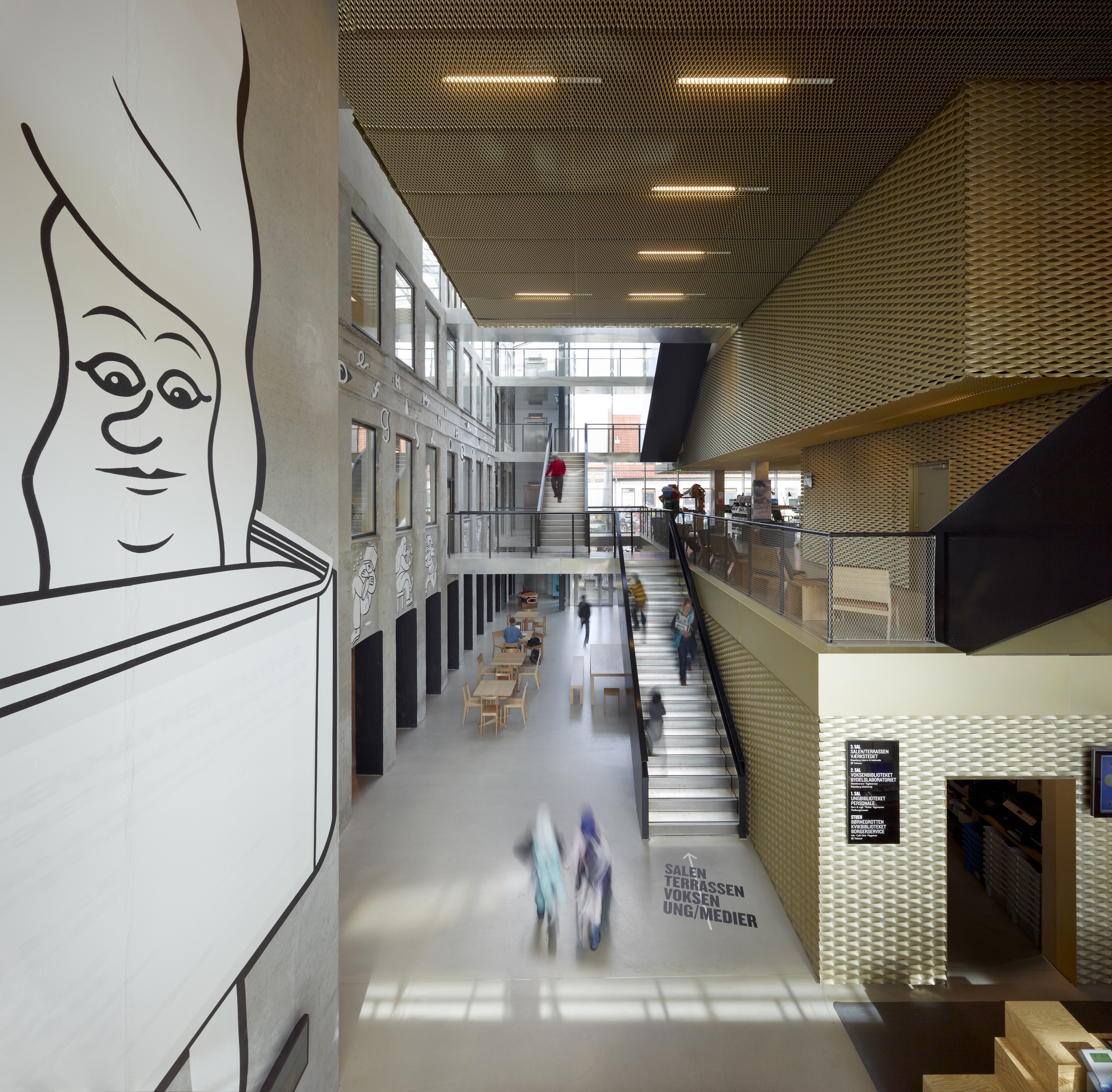 Bygningen har indgange fra både nord og syd – som en overdækket gade mellem den eksisterende og nye tilbygning, hvilket får foyeren til at fungere som en urban passage for området. Bygningen er designet ud fra demokratiske principper til at være åben, inkluderende og fungere som en platform for dialog.