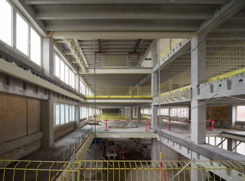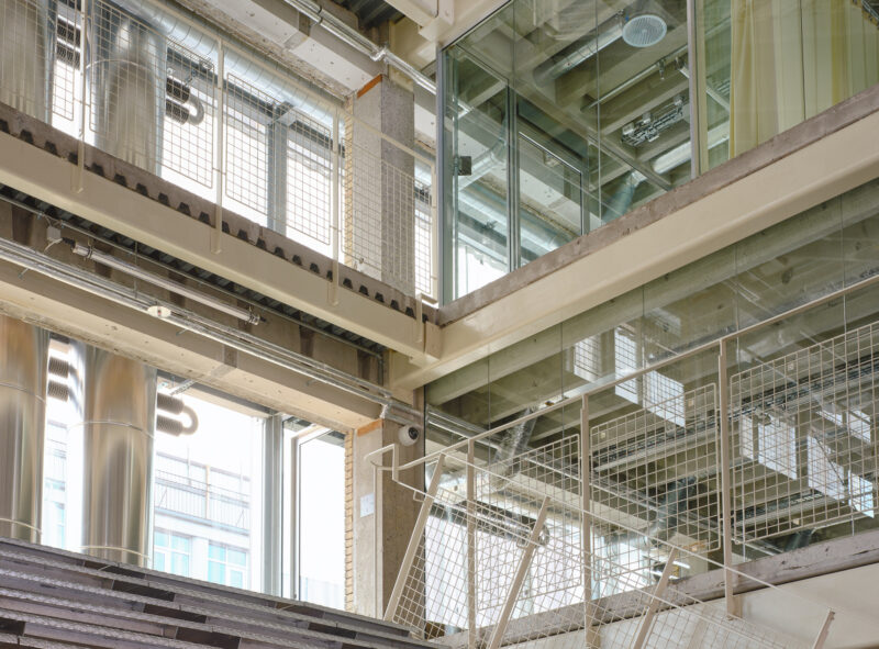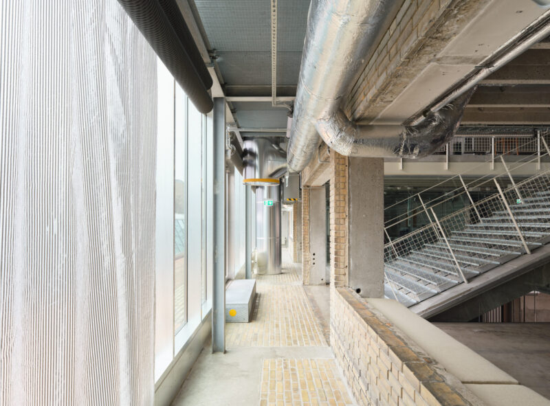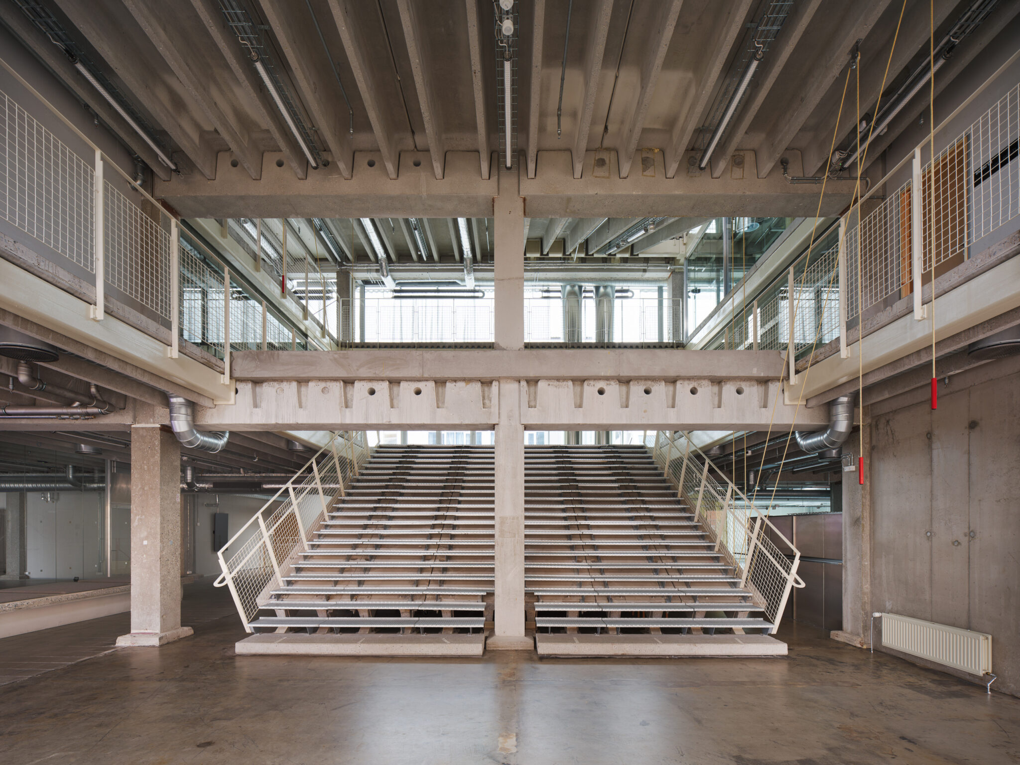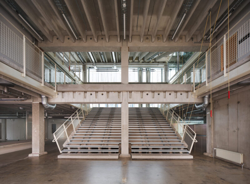 Det er ingen smal sag drastisk at ændre en eksisterende bygnings geometri. Søren Munkholm beskriver processen: ”I forbindelse med genanvendelsen af de eksisterende TT-etagedæk, har vi forstærket dem, således at vi kan bevare forspændingen. Dækket er herefter skåret ud og meget forsigtigt vinklet ned i den ene side, og placeret i helt nye stålkonsoller. Efter montage i stålkonsollerne, er der monteret ståltrappetrin og rækværk direkte på TT-dækkene.”