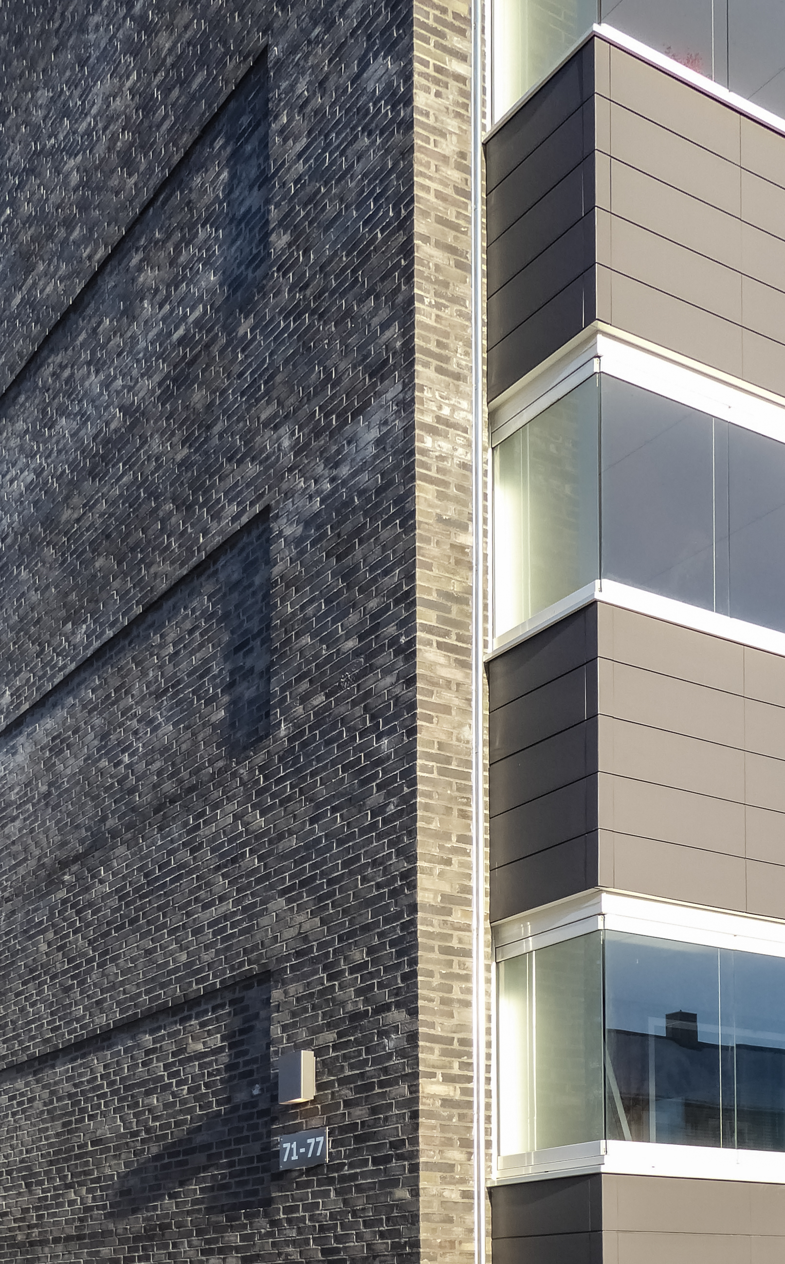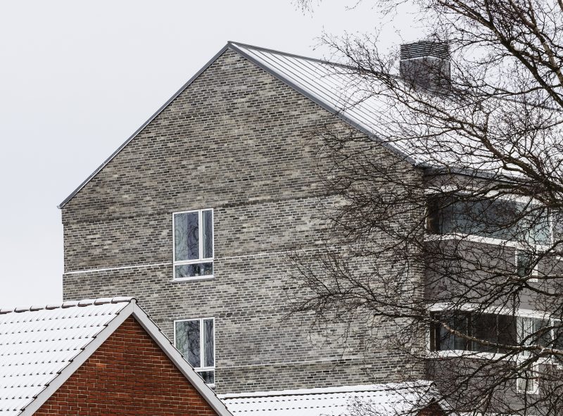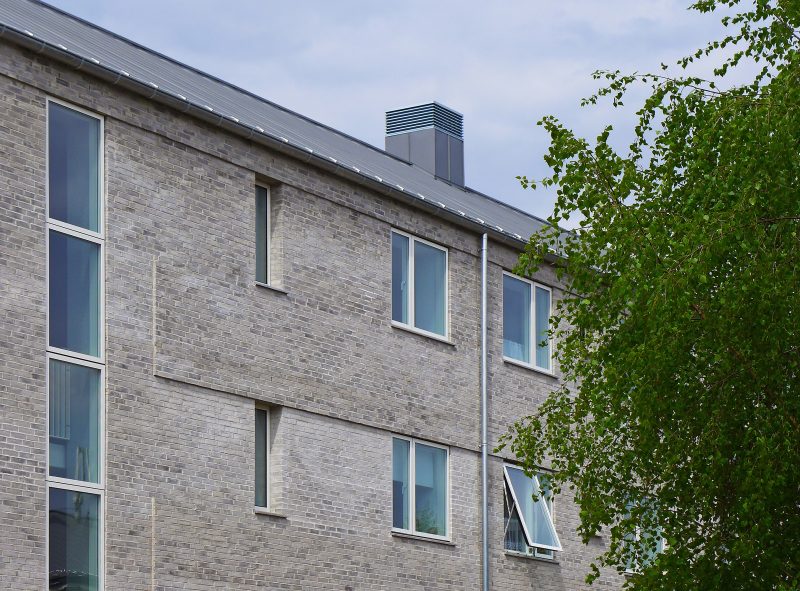 Der er anvendt specialtegl og farveafstemt skærmtegn i tre forskellige grånuancer. Specialfremstillede sålbænke i indfarvet beton og fugearbejde i en specialmørtel afstemt teglen bidrager til en harmonisk helhed.