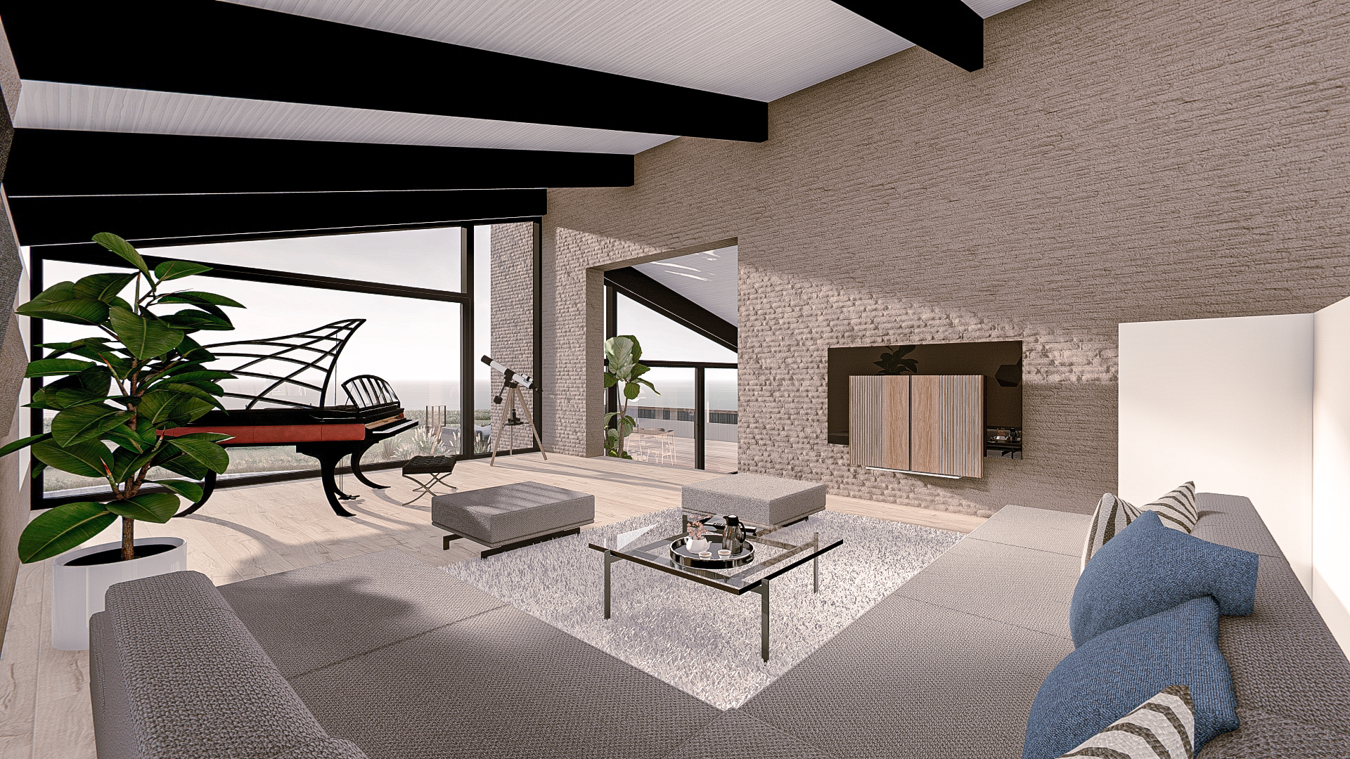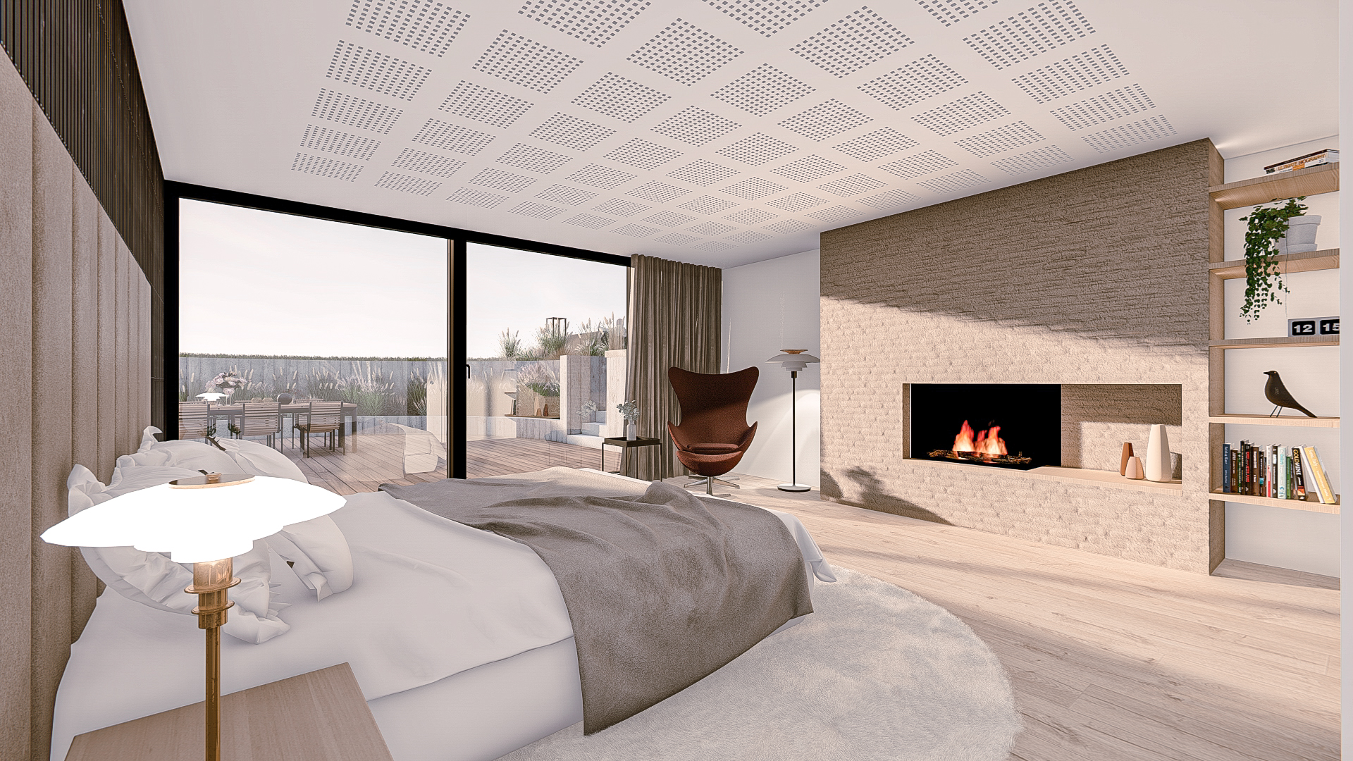 Indvendigt er der arbejdet med få, gennemgående materialer, som binder rummene sammen og understøtter oplevelsen af sammenhæng, lys og rumlighed.