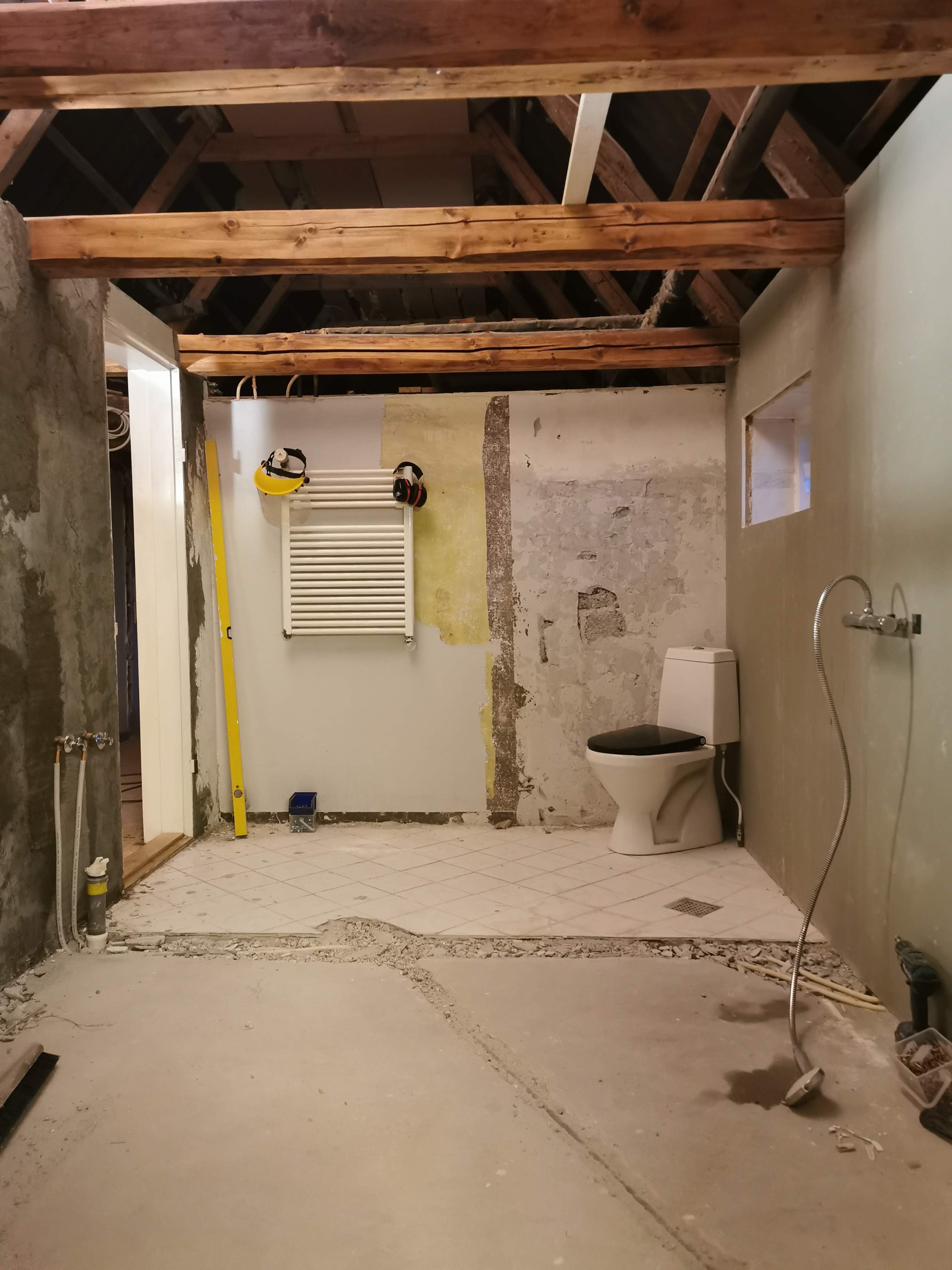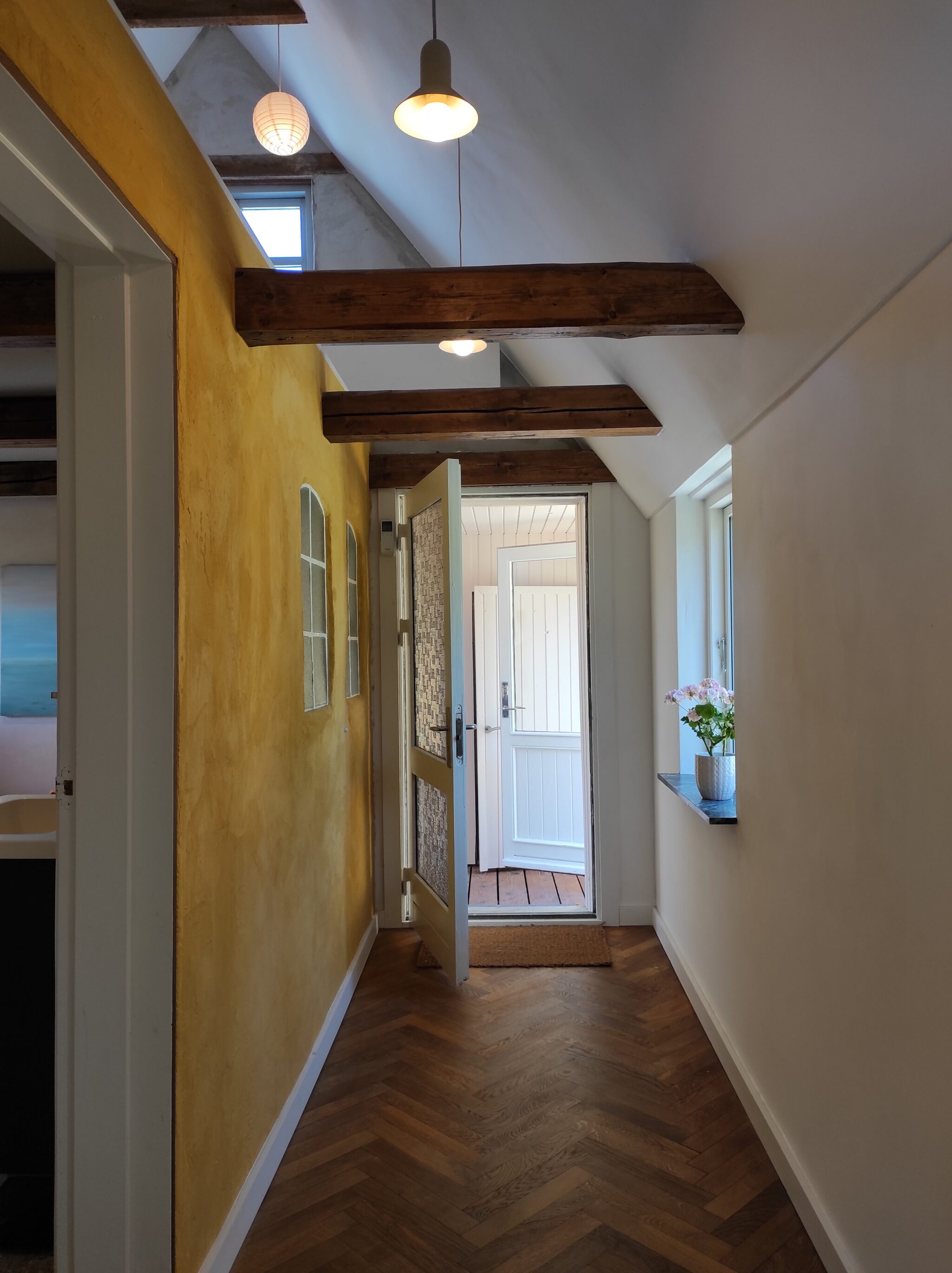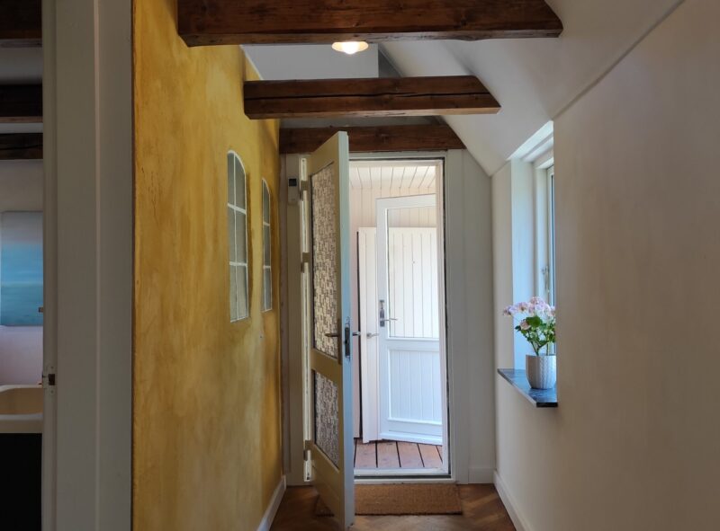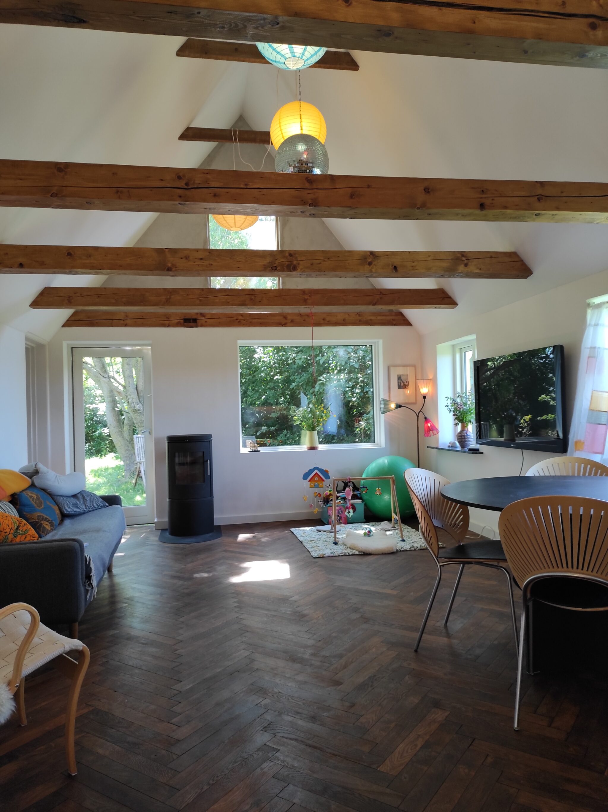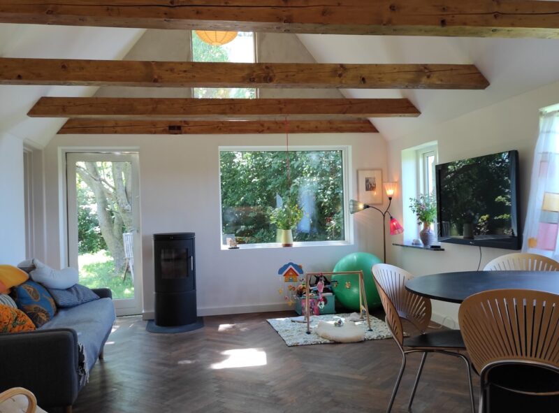 Huset er åbnet op til kip, og et stort vindue i gavlen giver en fantastisk udsigt til det rige dyreliv udenfor. Loftet blev efterisoleret med 30 cm mineraluld, og noget af den gamle isolering blev genanvendt.