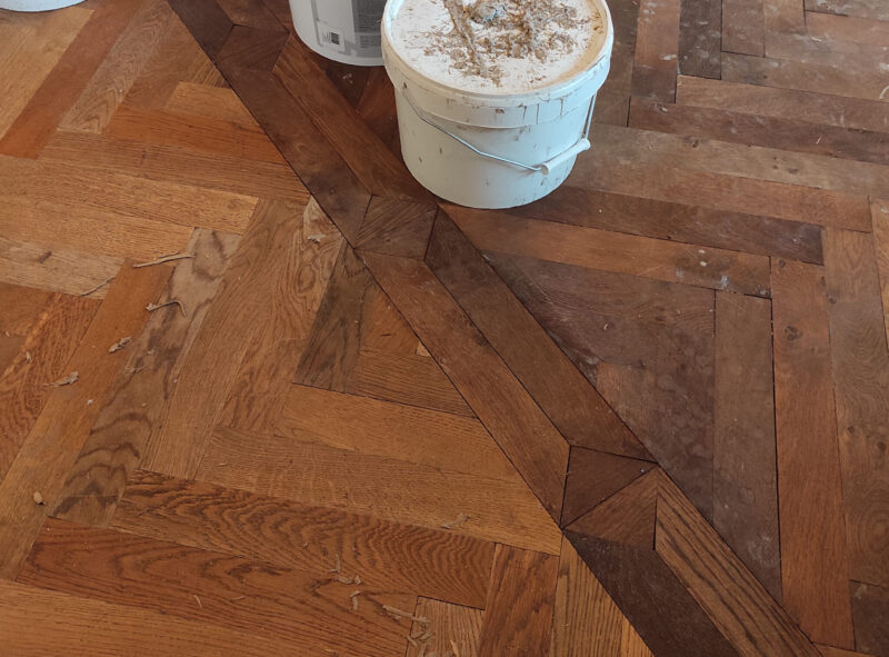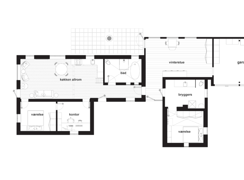 Renoveringen af dette hus er et eksempel på, hvordan kreativ brug af genbrugsmaterialer kan skabe et unikt og tidløst hjem. Gulvet blev hentet fra to forskellige boliger i København – 100 år gammel eg med knaster og 120 år gammel eg uden knaster. Da der ikke var nok til at dække hele gulvarealet, blev der skabt et bånd, der adskiller de to gulvtyper.
