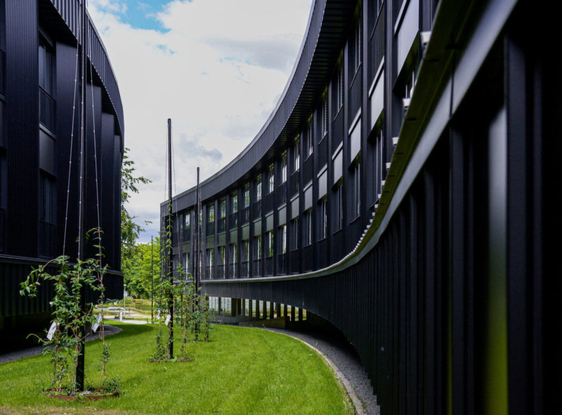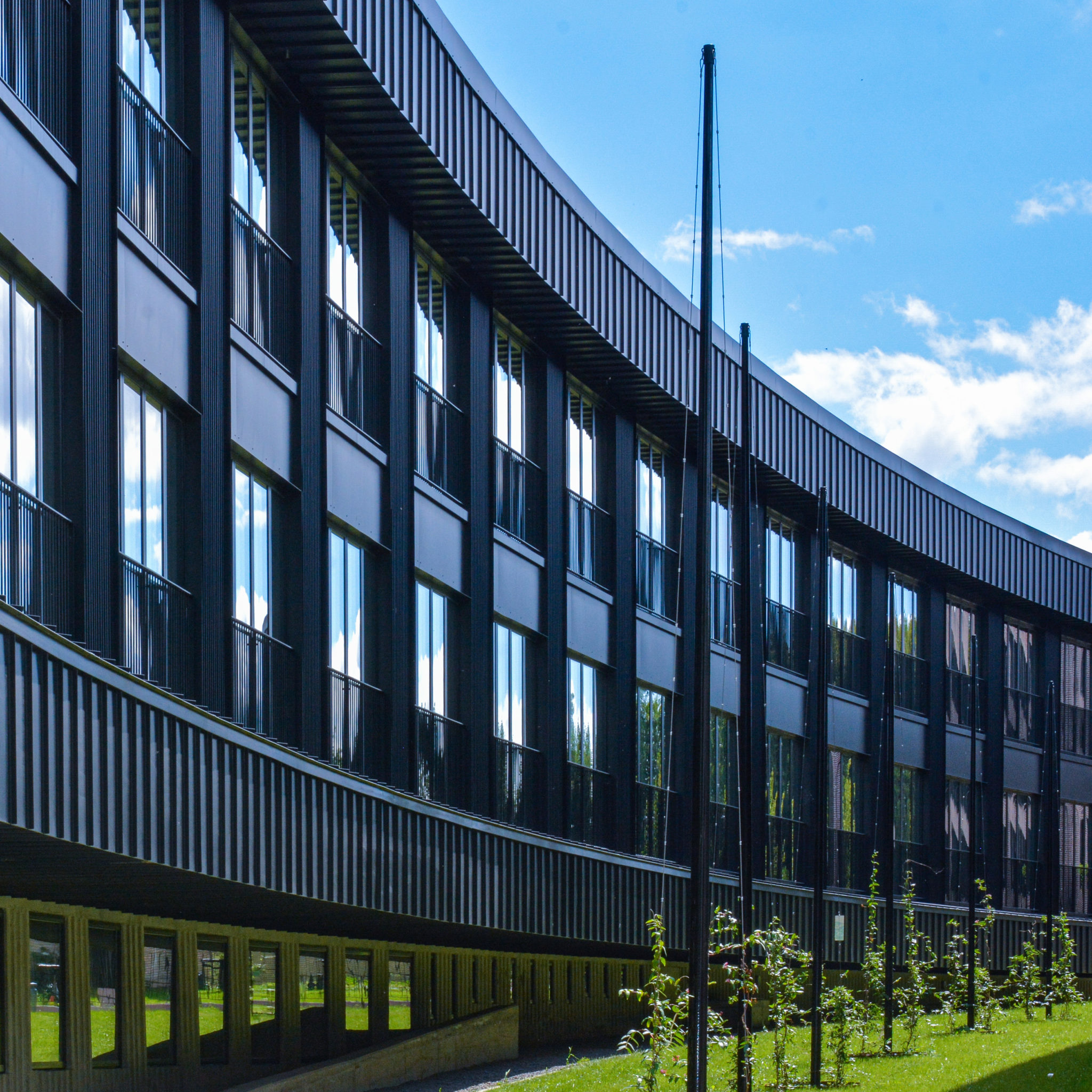 Der er arbejdet med dynamiske lag i facaderne. Vinduerne er trukket tilbage, og de diskrete, åbne værn understreger både de lodrette og vandrette linjer i facaden. Vinduer, døre og værn er sorte som facadebeklædningen, hvilket giver bygningerne et homogent og strømlinet udtryk.