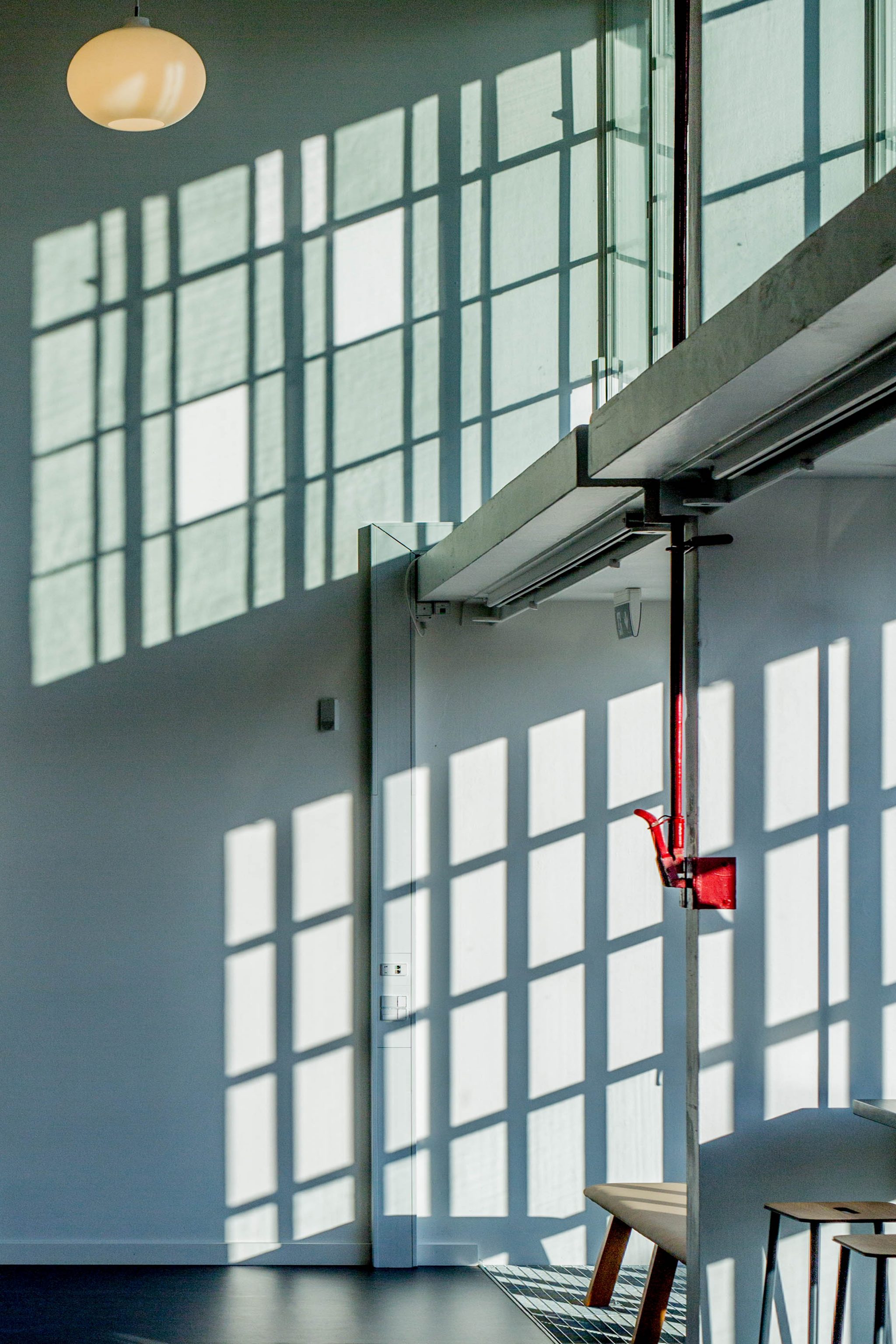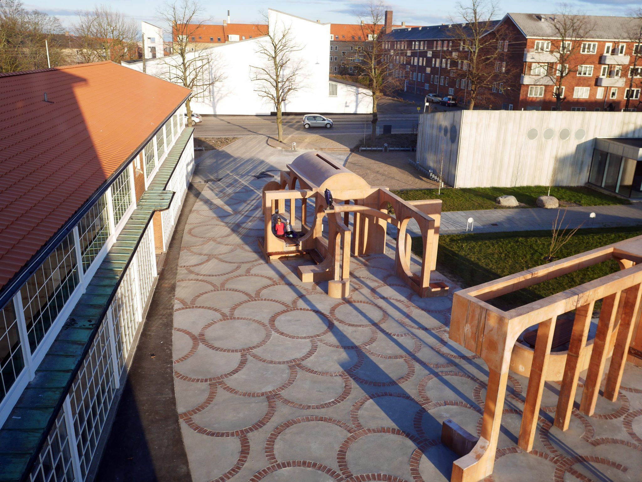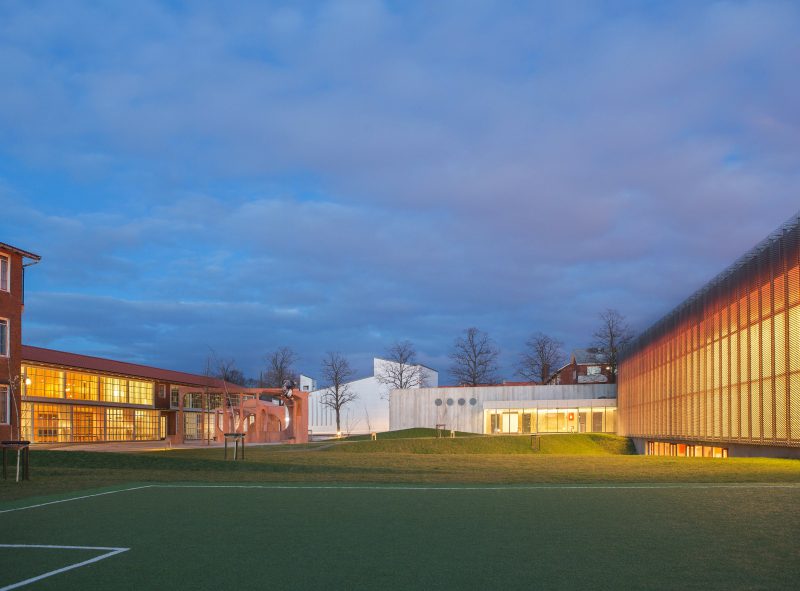 Arkitektonisk har det været vigtigt at søge inspiration i den eksisterende arkitektur, og forsøge at skabe gode nye rum, der spiller sammen med dem der allerede findes. Et centralt motiv, inspireret af de gamle gymnastiksales oprindelige facade, er filtreringen af lys gennem sprosser og ribber, rundt om søjler, og menneskernes bevægelse i det spillende sollys. Det har resulteret i to facader i den gamle og den nye gymnastiksal, der spejler hinandens kvaliteter. Ved skumring spændes pladsen med kunstværket ud mellem de to facaders lysende dialog og inviterer nærområdet til at tage del i skolens liv.
