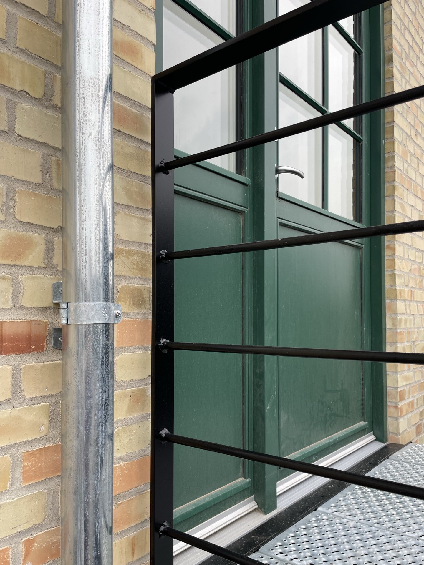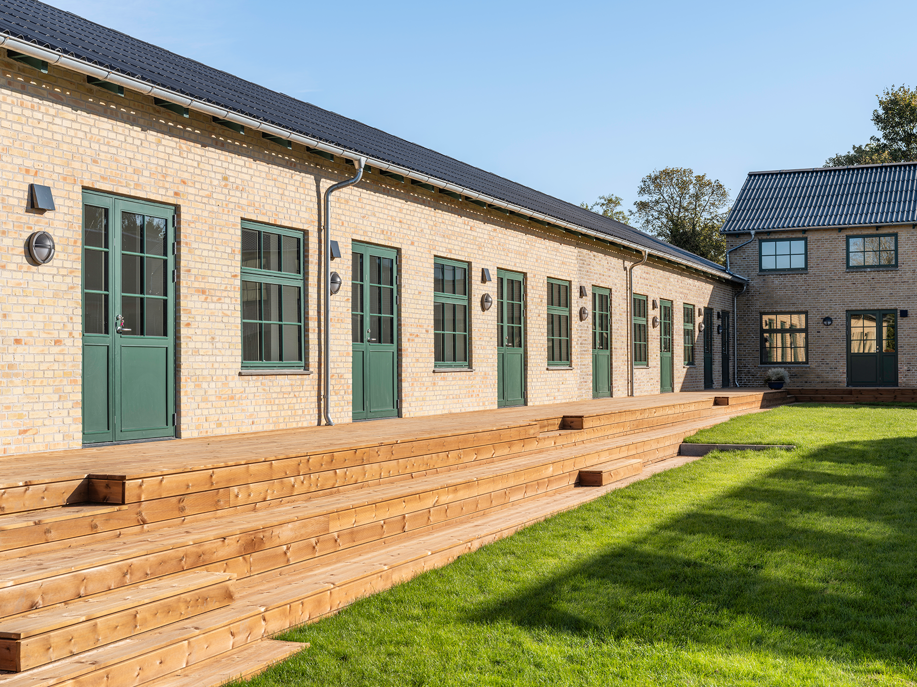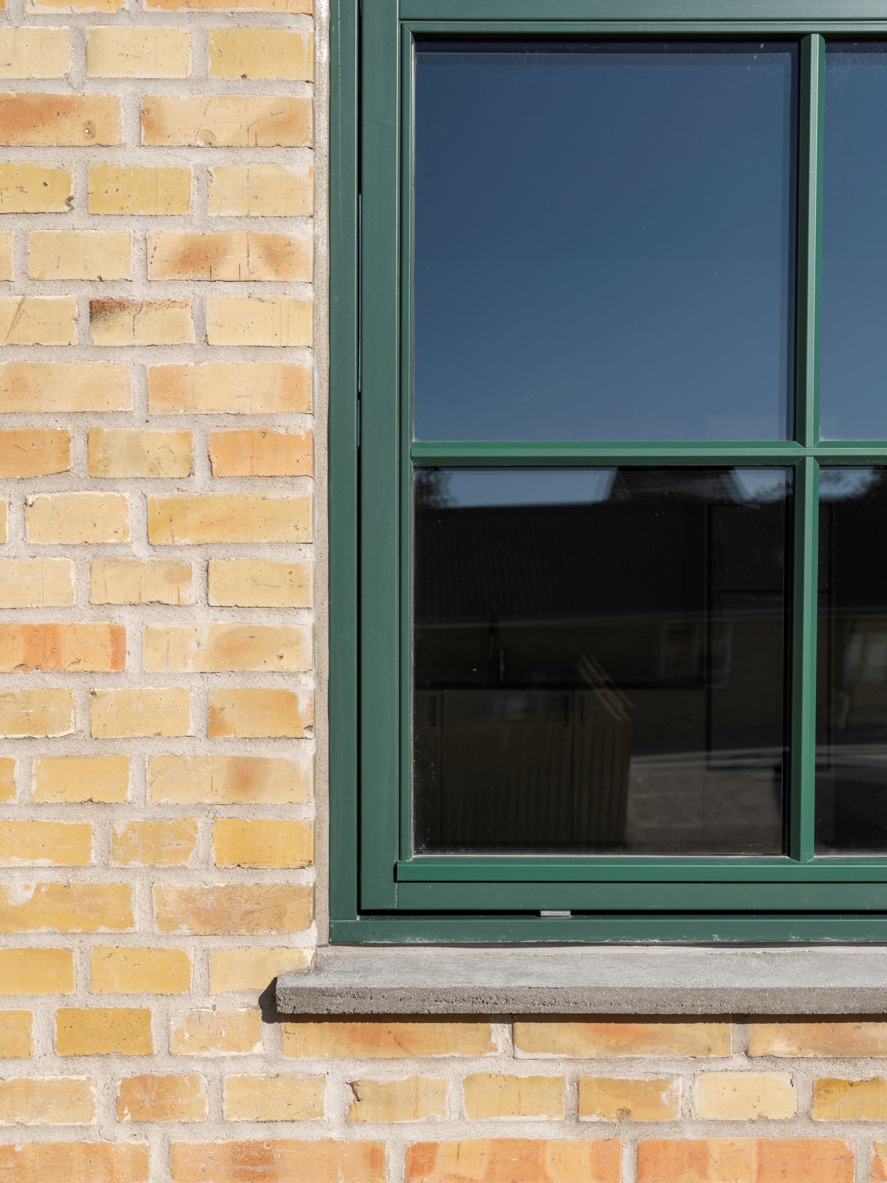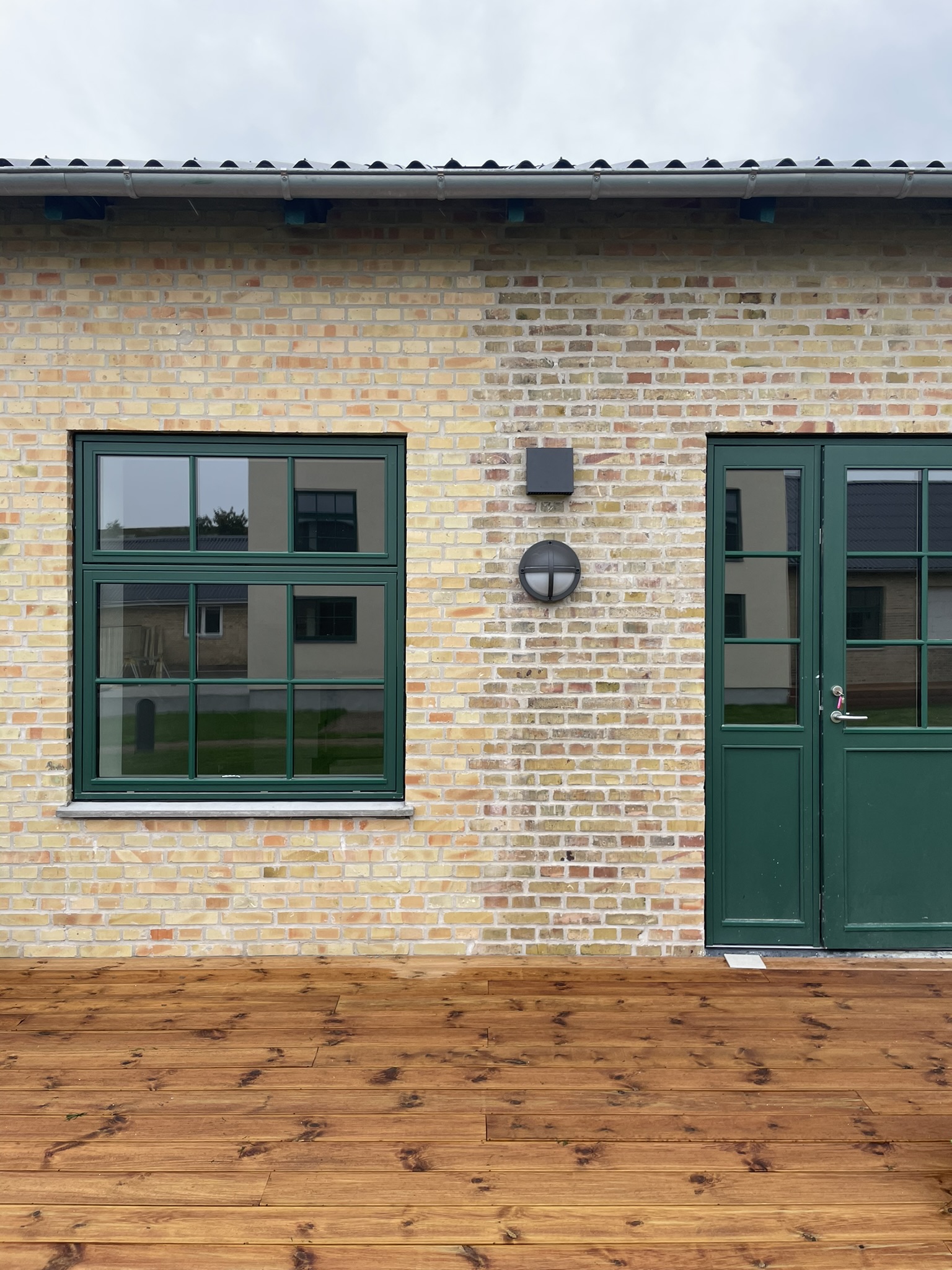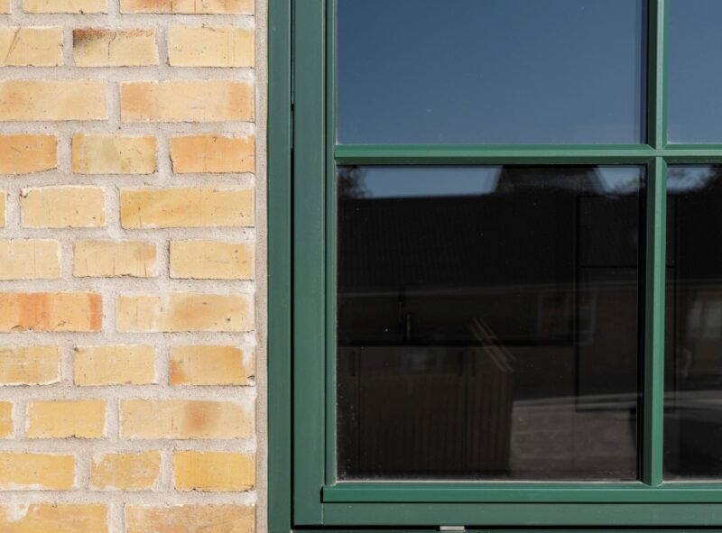 Facaderne er originale gule mursten med et skifte i nuancen mellem den oprindelige bygning og tilbygningen til polstreværksted. Facaderne er omfuget med hydraulisk kalkmørtel tilpasset gammelt murværk, og repareret med genbrugssten fra andre dele af facaden. Sokkel er bevaret i traditionel ubehandlet sokkelpuds. Døre og vinduer er træelementer og farven er original grøn umbra efter analyse af den oprindelige vinduesfarve. Vinduer er fuget med moderne tætte gummifuger strøet med sandkorn for at passe i overgangen mellem vindue og murværk. Sålbænke er insitu støbt beton som de originale, der i høj grad er med til at understrege karakteren i transformationen.