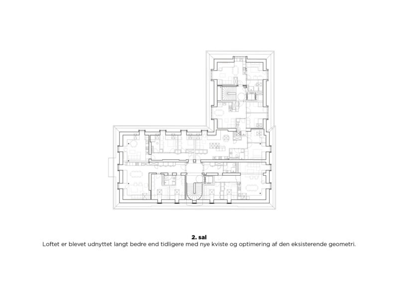 Der var givet tilladelse til, at baghuset kunne rives ned, men den stilrene funkisbygning fra 30’erne havde en række iboende kvaliteter, der gjorde den til en ressource i stedet for affald og sikrede væsentlige CO2-hensyn. Bygningen fortæller en historie fra en svunden tid, og det Frederiksberg, der også er kendetegnet ved netop baghuse og knopskydninger. Den rummede et særligt potentiale for at blive omdannet til lejligheder med højt til loftet, god rumdisponering og harmoniske proportioner. Samtidig bidrog den til at danne et fint gårdrum med L-form, der beskytter mod støjen ud til vejen.
