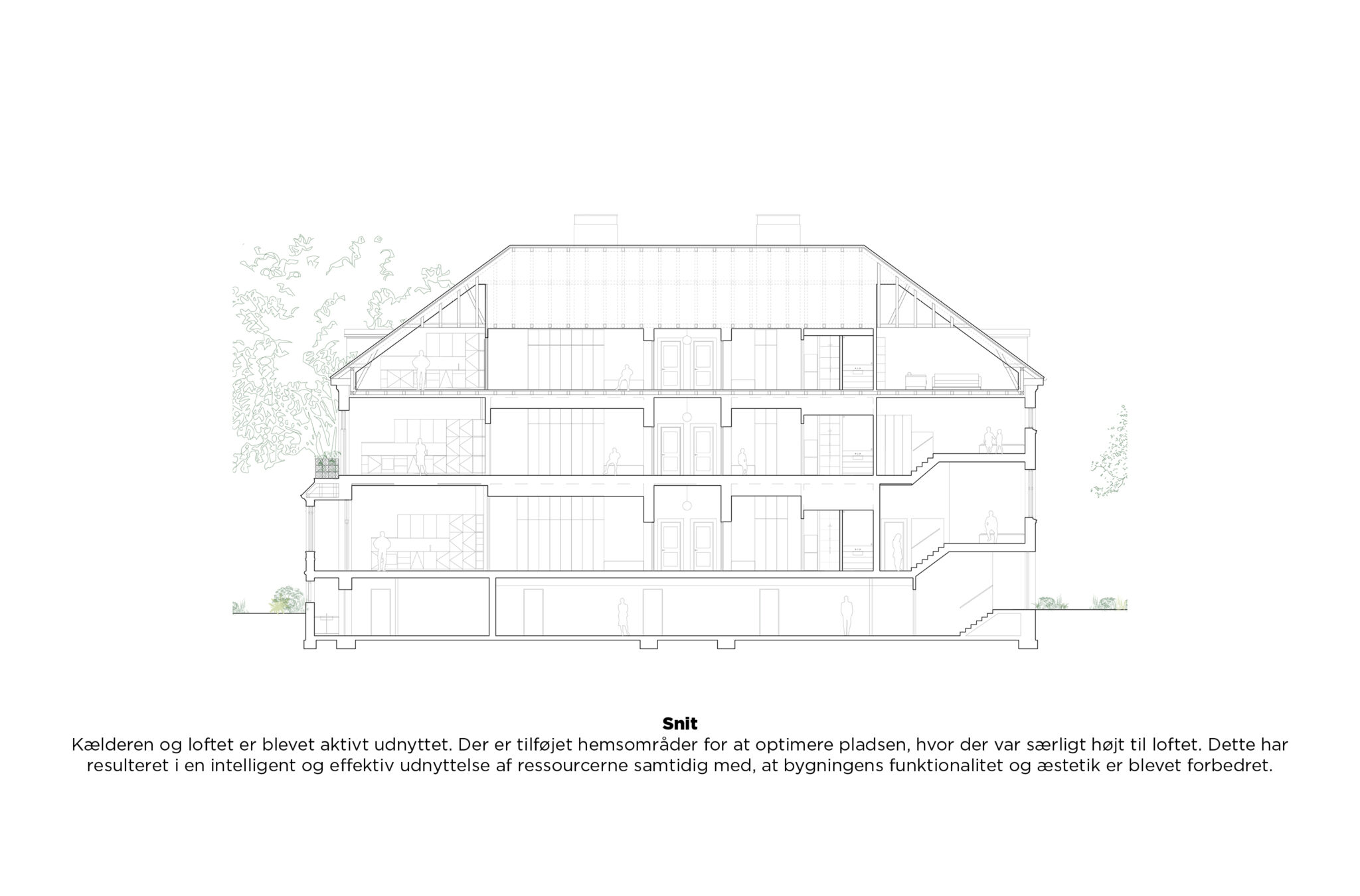 Der er i projektet lagt vægt på optimal udnyttelse af ressourcerne. Dette er opnået gennem forskellige initiativer, herunder materialevalg, genbrug og optimering af bygningens areal. Et markant eksempel er bevarelsen af de eksisterende bærende konstruktioner i boligerne samt genbrug af ressourcer i videst muligt omfang. Alt fra de gamle teglsten til detaljer af høj kvalitet, såsom som døre, paneler og stuk er blevet genanvendt, og overflødige materialer er sendt til genbyg, for eksempel blev eksisterende tagsten knust og anvendt som grus, og overskydende træ blev genbrugt andre steder i bygningen. Konservatorer renoverede nænsomt sandstensornamenterne på facaden, der i sin helhed er blevet tilbageført til sit oprindelige udseende og kvalitet, bl.a. med tilføjelsen af kalkfuger og oprindelige vinduer og tagnedløb. Teknikken er blevet diskret integreret bag den originale murstens-skorsten for at bevare det autentiske udtryk. Selv finurlige og skæve detaljer er blevet bevaret for at give boligerne en særlig karakter og identitet. Eksempelvis er en smuk skulpturel rundebetontrappe i kælderen blevet bevaret trods dens ikke-logiske placering. For at maksimere bygningens areal er kælderen blevet aktivt udnyttet, og tagetagen er udnyttet langt bedre, end den var før, med nye kviste og vinduer og optimering af den eksisterende geometri. Hemse er tilføjet for at udnytte rummet optimalt, hvor der var særligt højt til loftet. Dette har resulteret i en intelligent og effektiv brug af ressourcer, samtidig med at bygningens funktionalitet og æstetik er blevet forbedret.