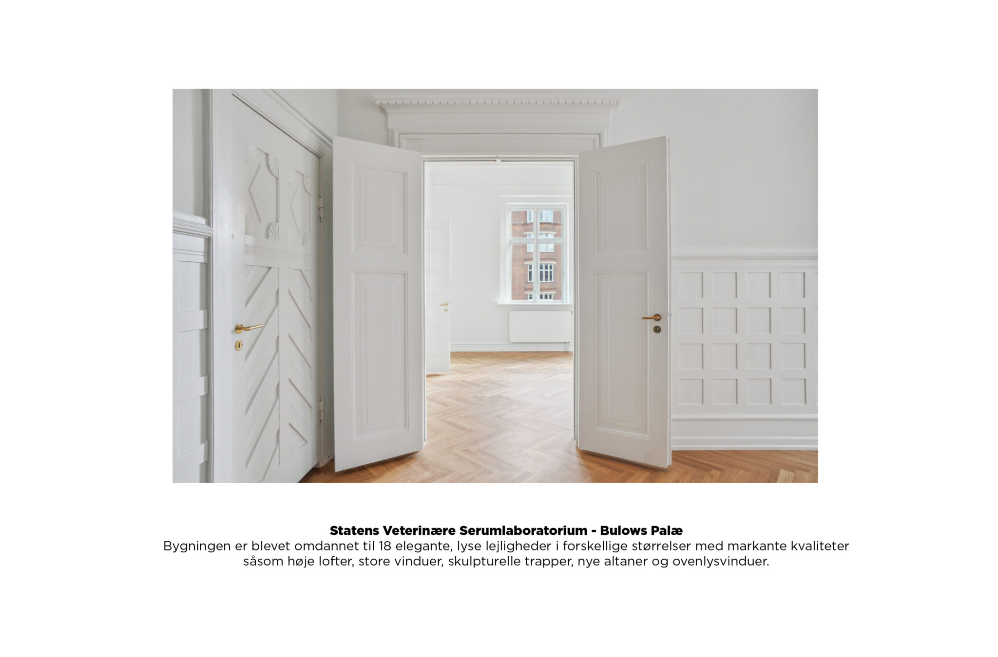 Hovedbygningen til Statens Veterinære Serumlaboratorium på Frederiksberg er med transformationen blevet omdannet til 18 elegante, lyse lejligheder i varierende størrelser med markante kvaliteter som højt til loftet, store vinduer, skulpturelle trapper, nye altaner og ovenlys.