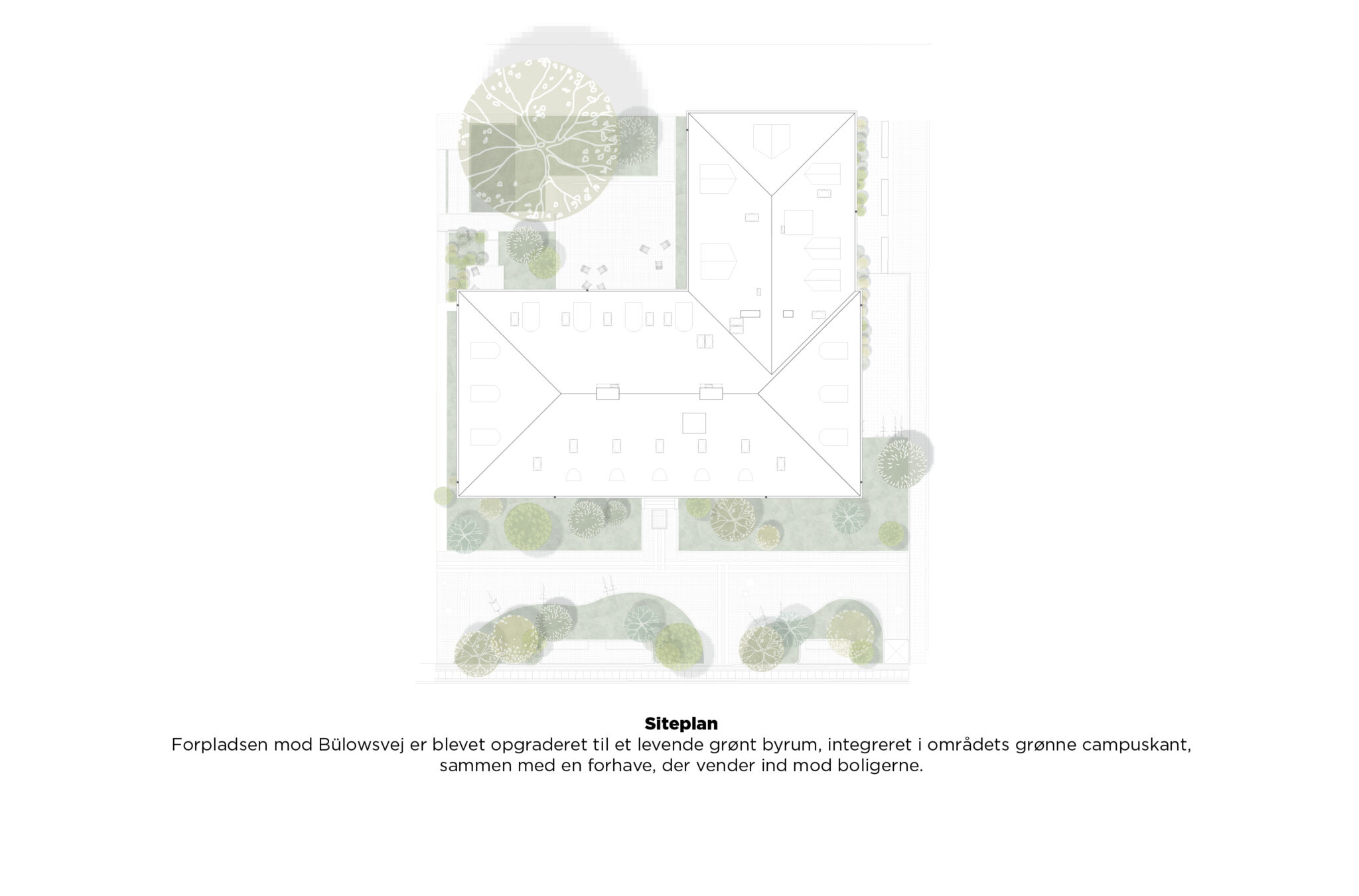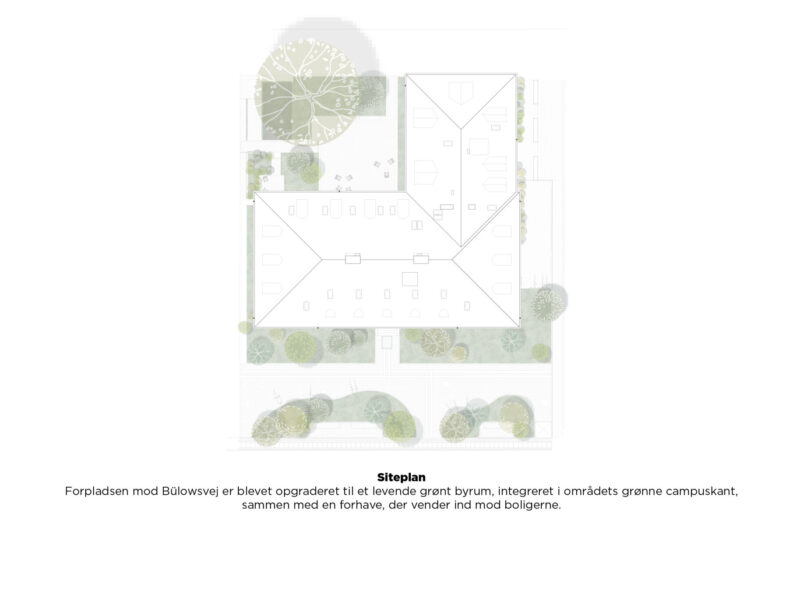 Helheden er udtryk for det klassiske Frederiksberg med sildeben og stuk samt fin detaljering af vinduesrammer og -hængsler. Den indhegnede asfaltplads, der før udgjorde bygningens forplads mod Bülowsvej er opgraderet til et levende grønt byrum, der er indpasset i områdets grønne campuskant samt et forhaveareal ind mod boligerne.