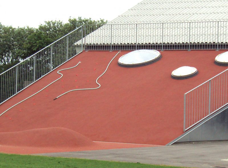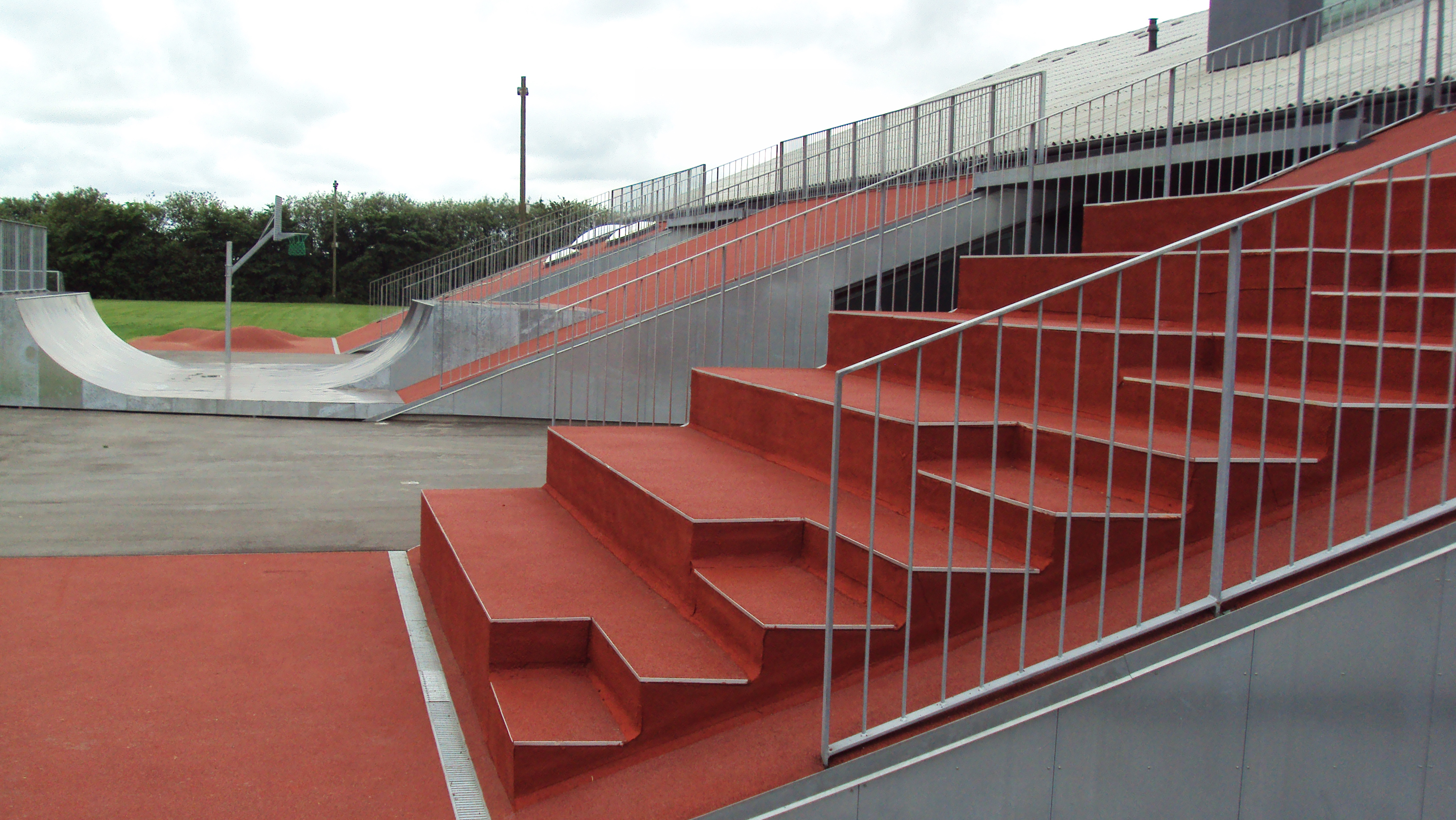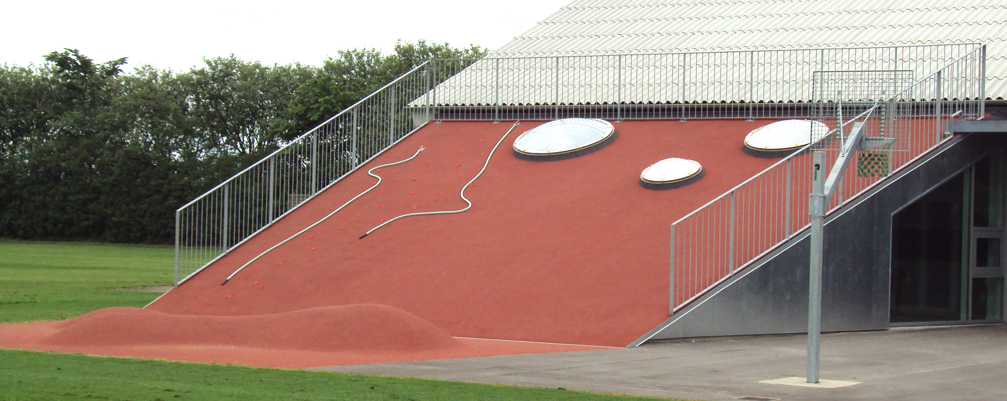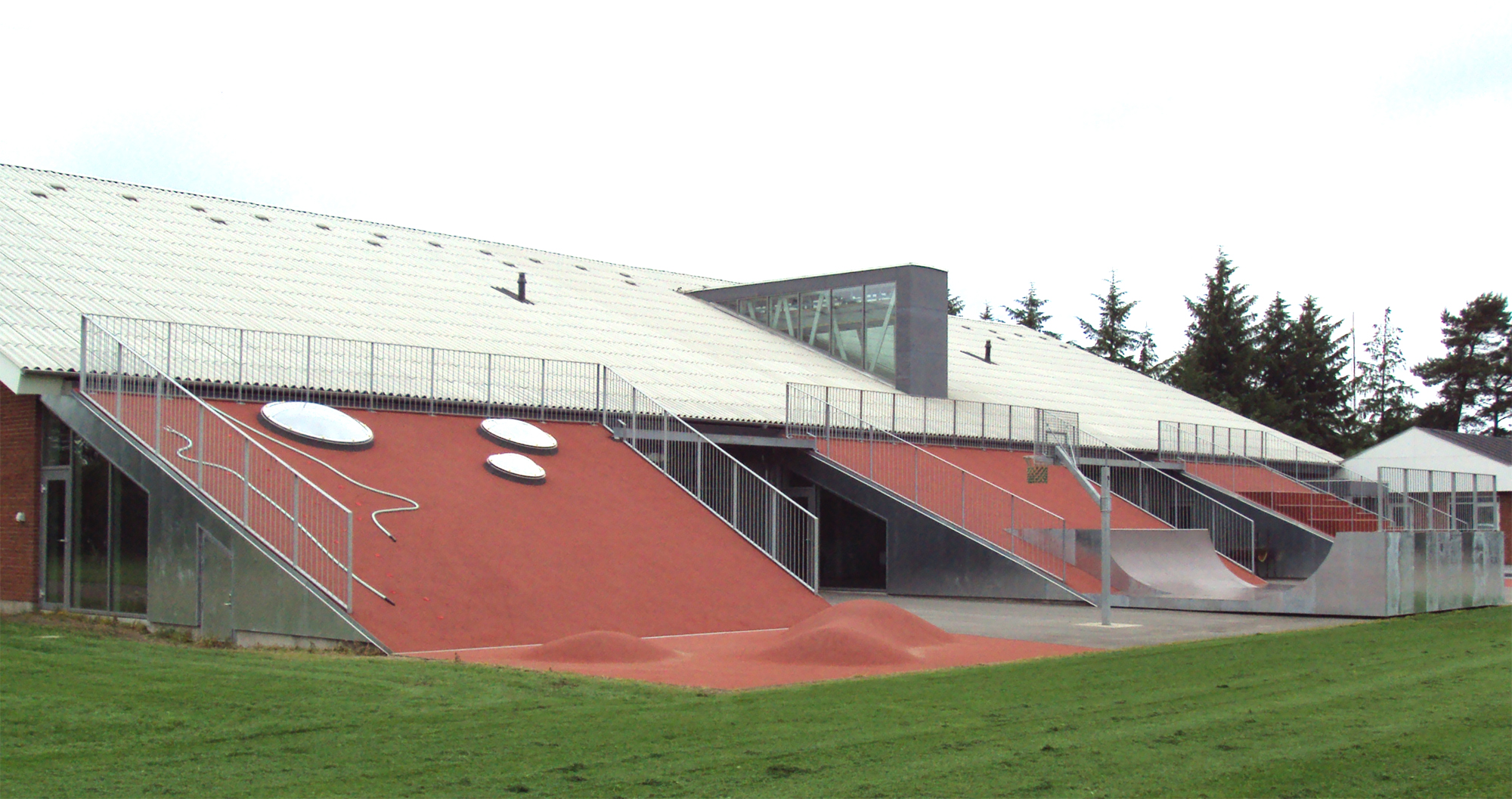 Hallen har fået tre nye tilbygninger, hvor hver tilbygnings tagflade føres helt ned til jorden. En tagflade med ovenlyskupler, en anden med værestedstrappe, og en tredje, der kan bruges af skatere på rulleskøjter eller skateboards.