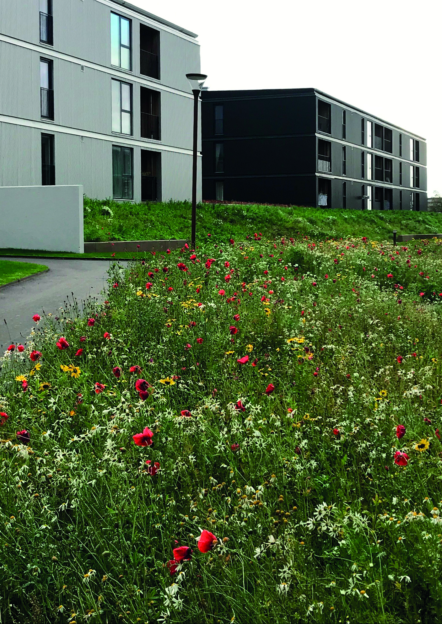 Landskabet mellem husene er bearbejdet, så der skabes en grøn buffer mellem altanerne og de nye store vinduespartier og de stier, man færdes på langs bygningerne. Teamet er ”Vildt med vilje”. I arealerne mellem husene giver store flader adskilt af stier plads til vild natur, hvor sommerfugle, bier og andre insekter får optimale levevilkår.