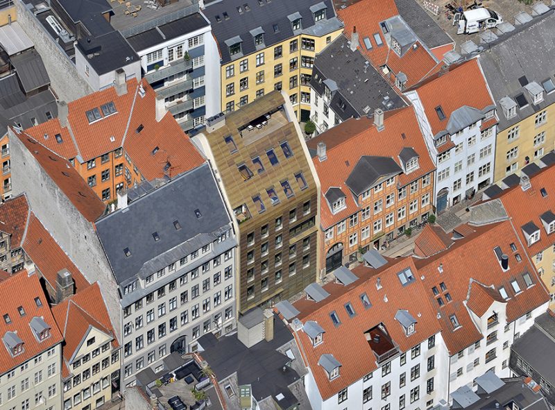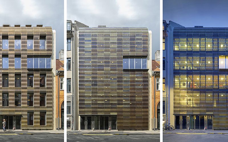 1. Om morgenen foldes messingskærmen op foran hvert andet glasparti, og huset illuderer klassisk byhus med piller og vinduer, som nabobygninger. I løbet af dagen kan skærmene lukkes individuelt.